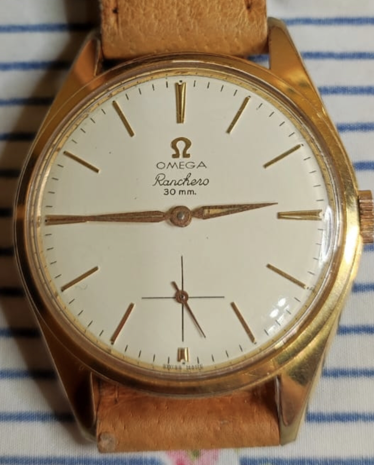 A very bad obvious redial with several popular 1950s Omega design cues like the alpha hands and the small seconds crosshair subdial, but none of them appropriate for a Ranchero. . .