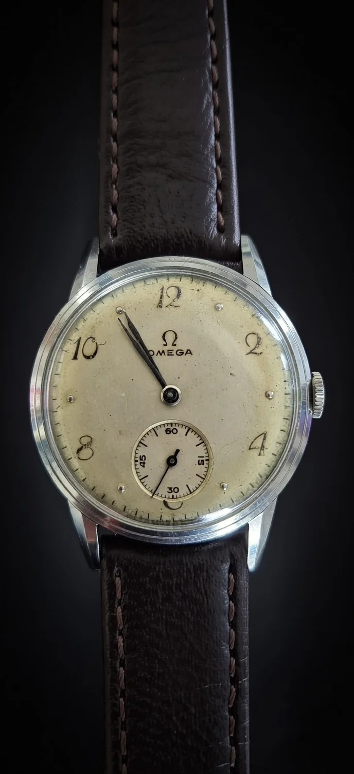 - Movement: Manual winding calibre 30T2 SC (small seconds), fully original. Recently fully serviced by a specialized vintage watchmaker: full maintenance, one main part replaced with genuine Omega part, exterior cleaned preserving the tropical patina. Runs perfectly with good amplitude and accuracy. Certificate from the watchmaker included.