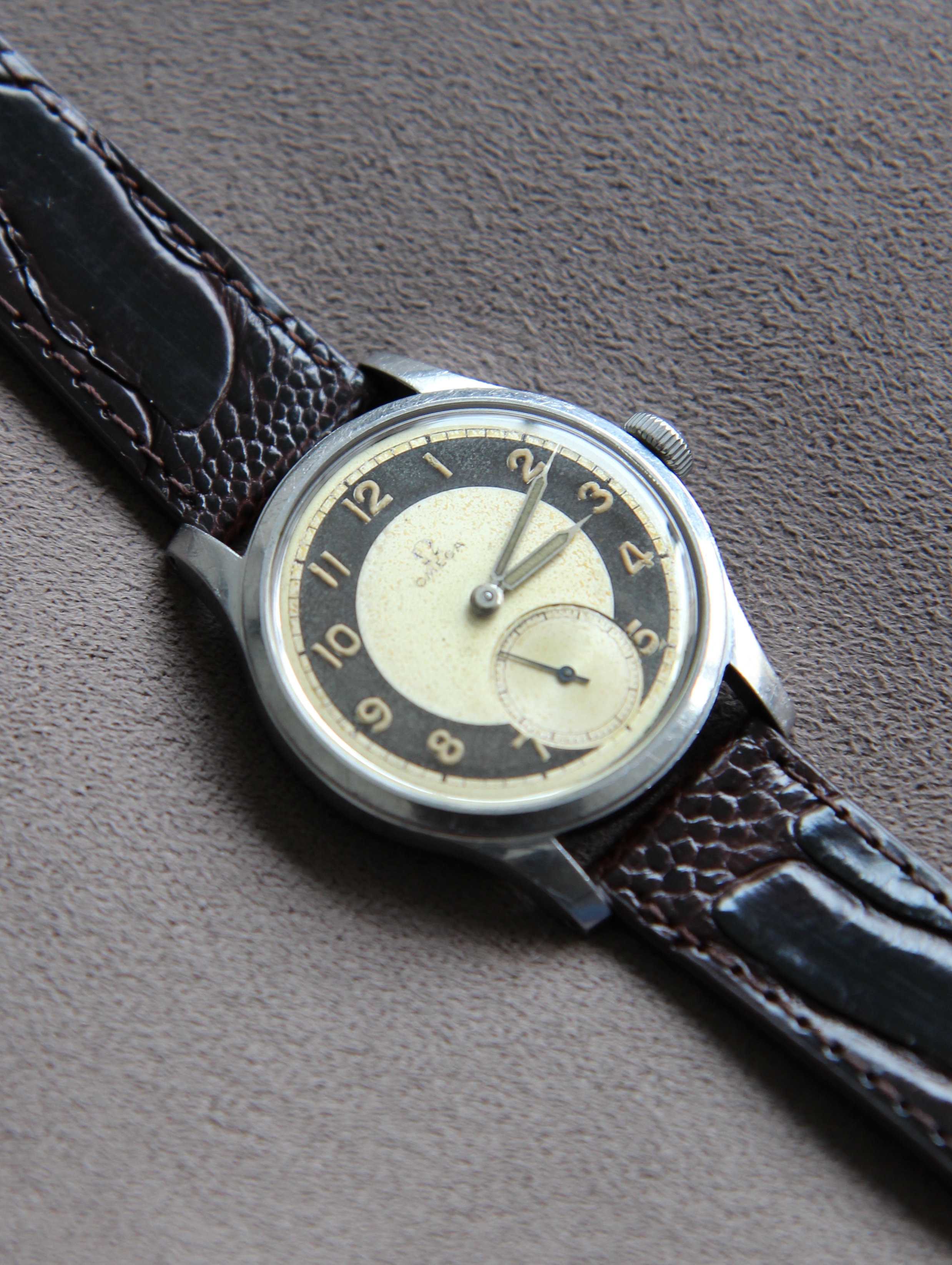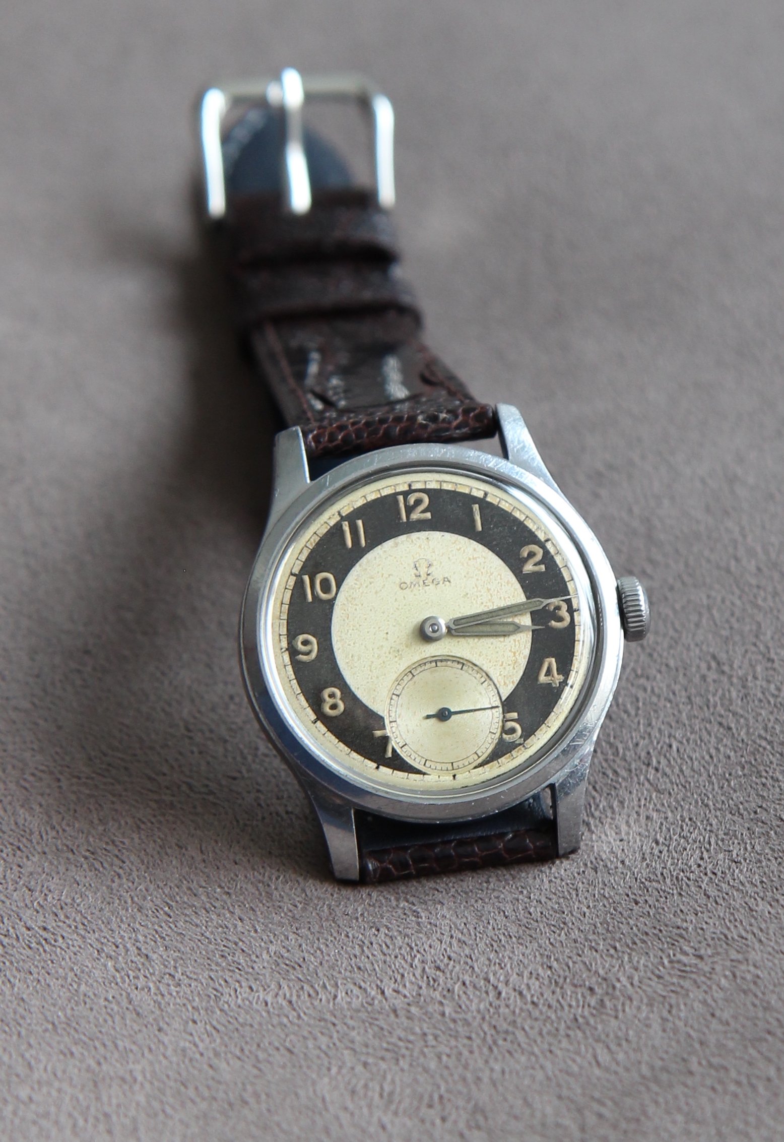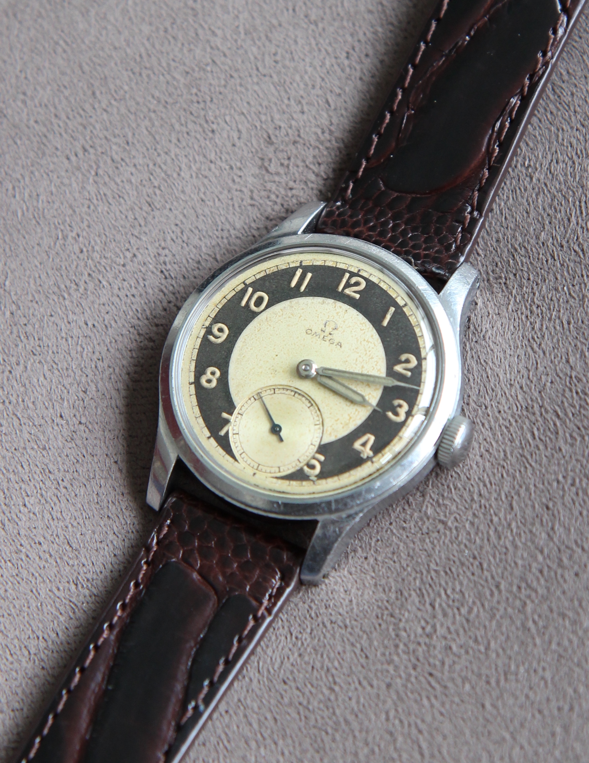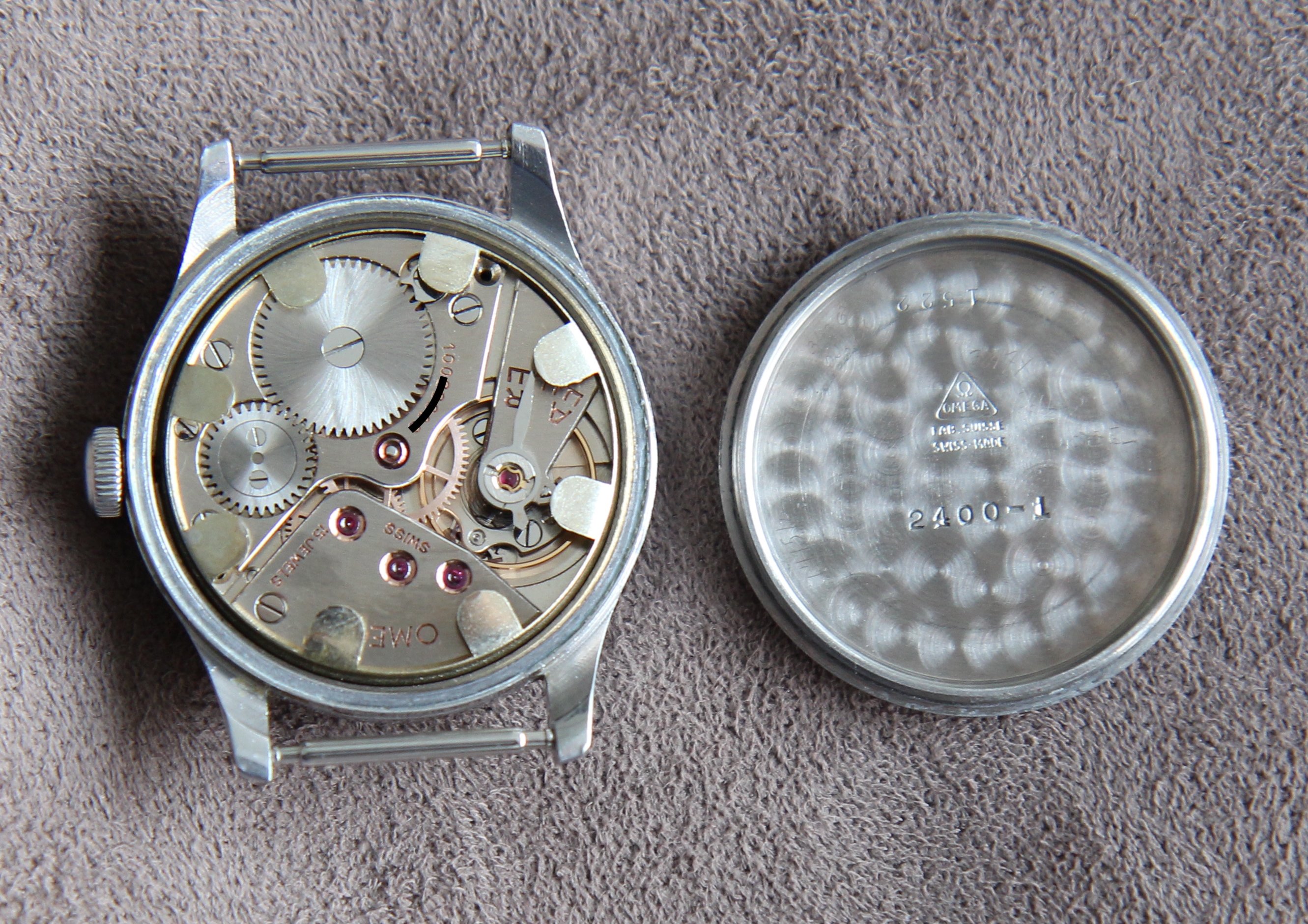 The caliber is in the rhodium color characteristic of Omega productions from 1938 until the end of the war. it was from 1945 that Omega chose the color copper.
