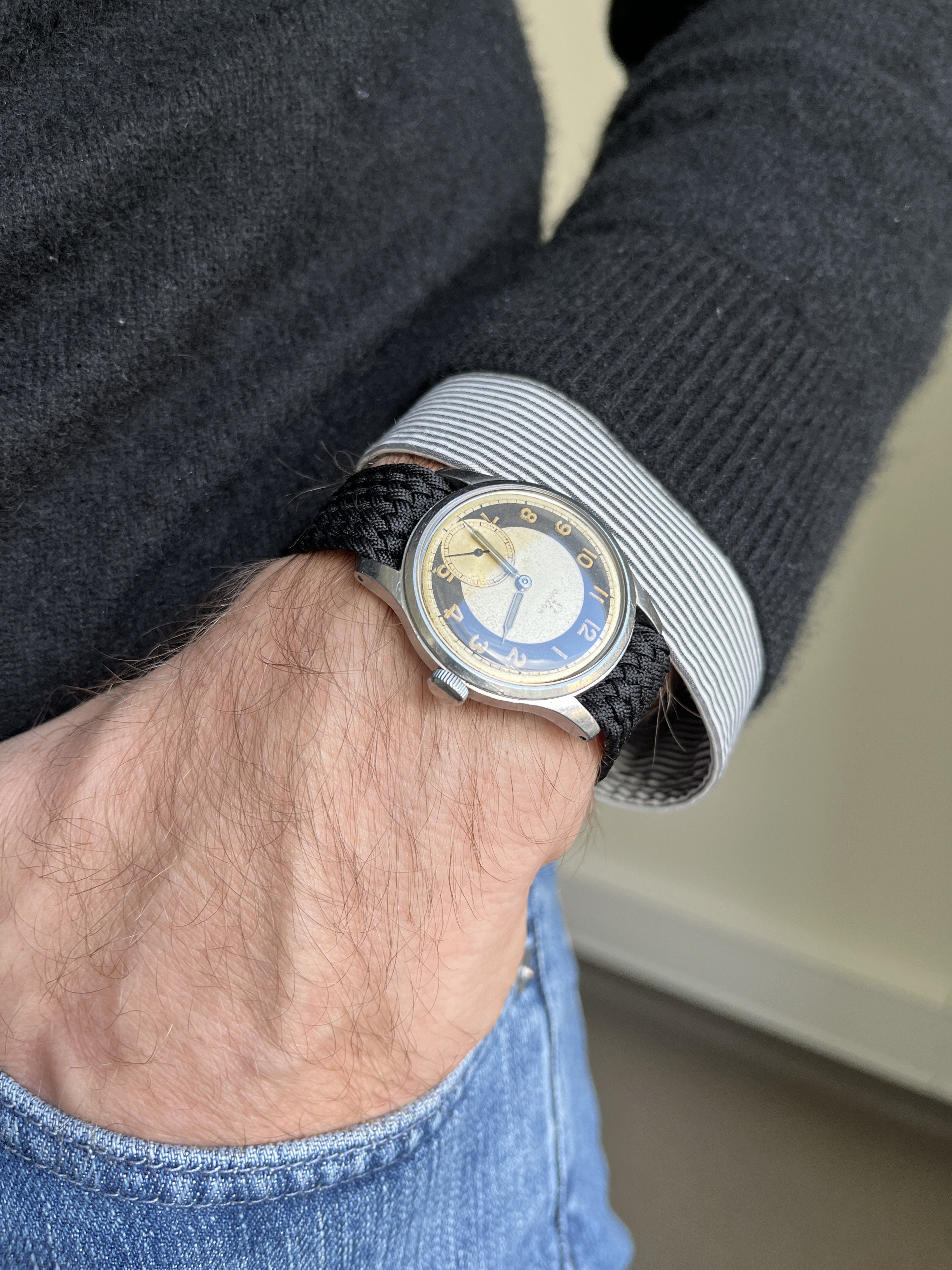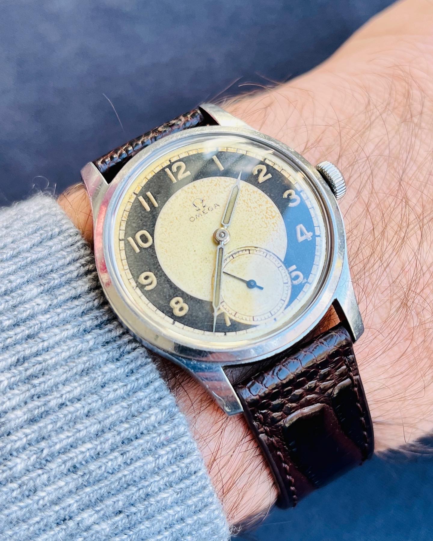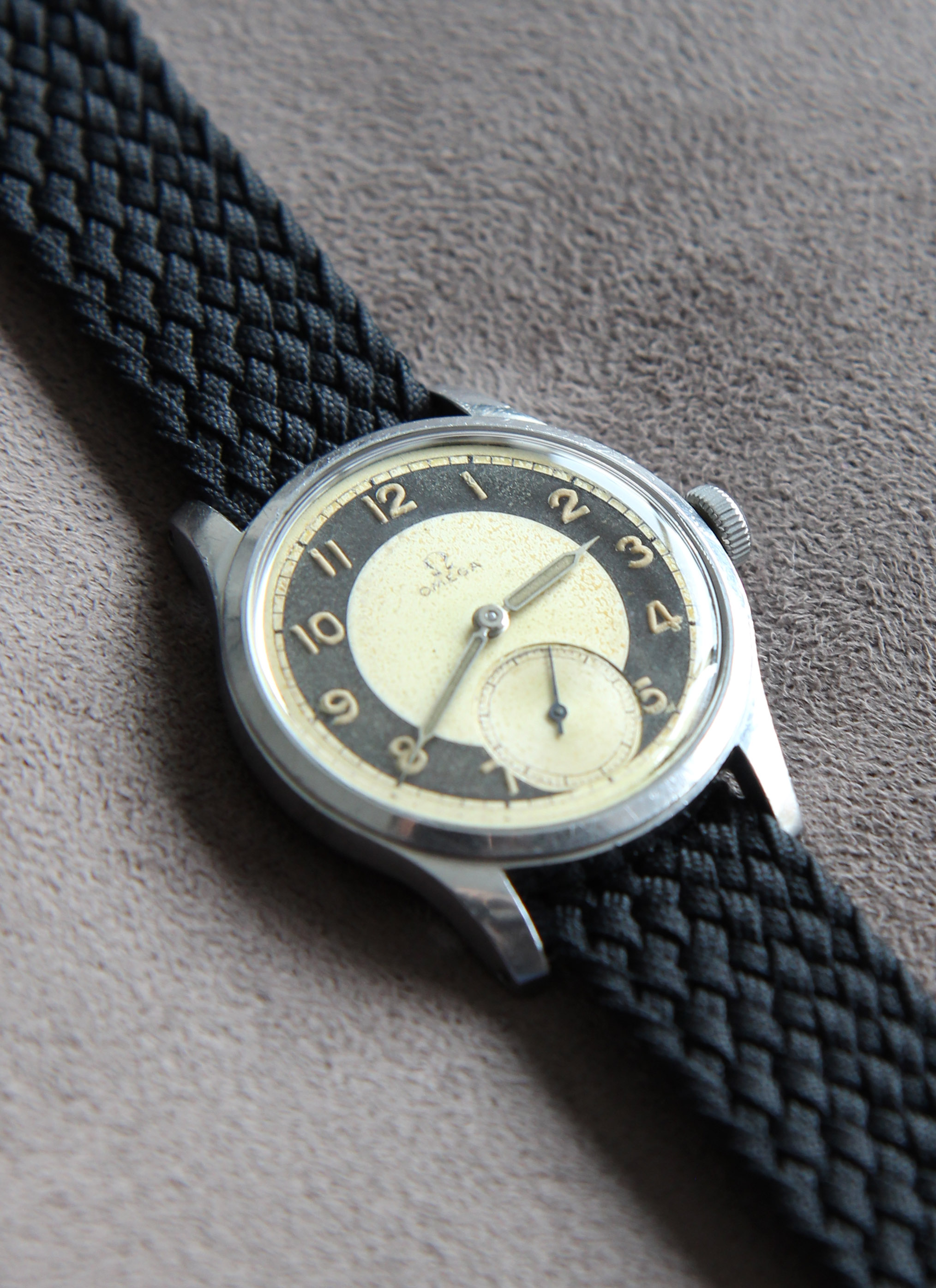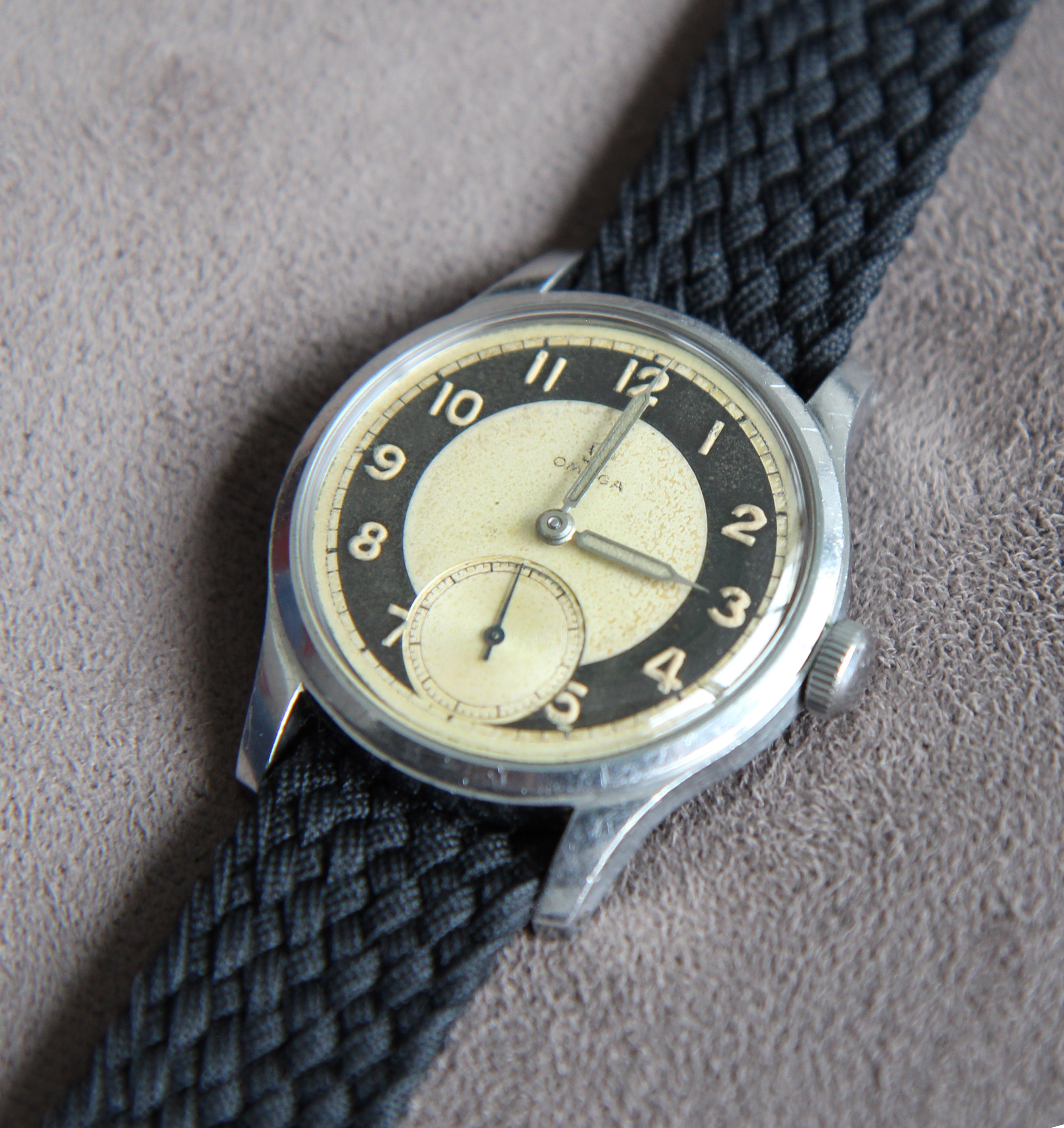 The caliber is in the rhodium color characteristic of Omega productions from 1938 until the end of the war. it was from 1945 that Omega chose the color copper.
