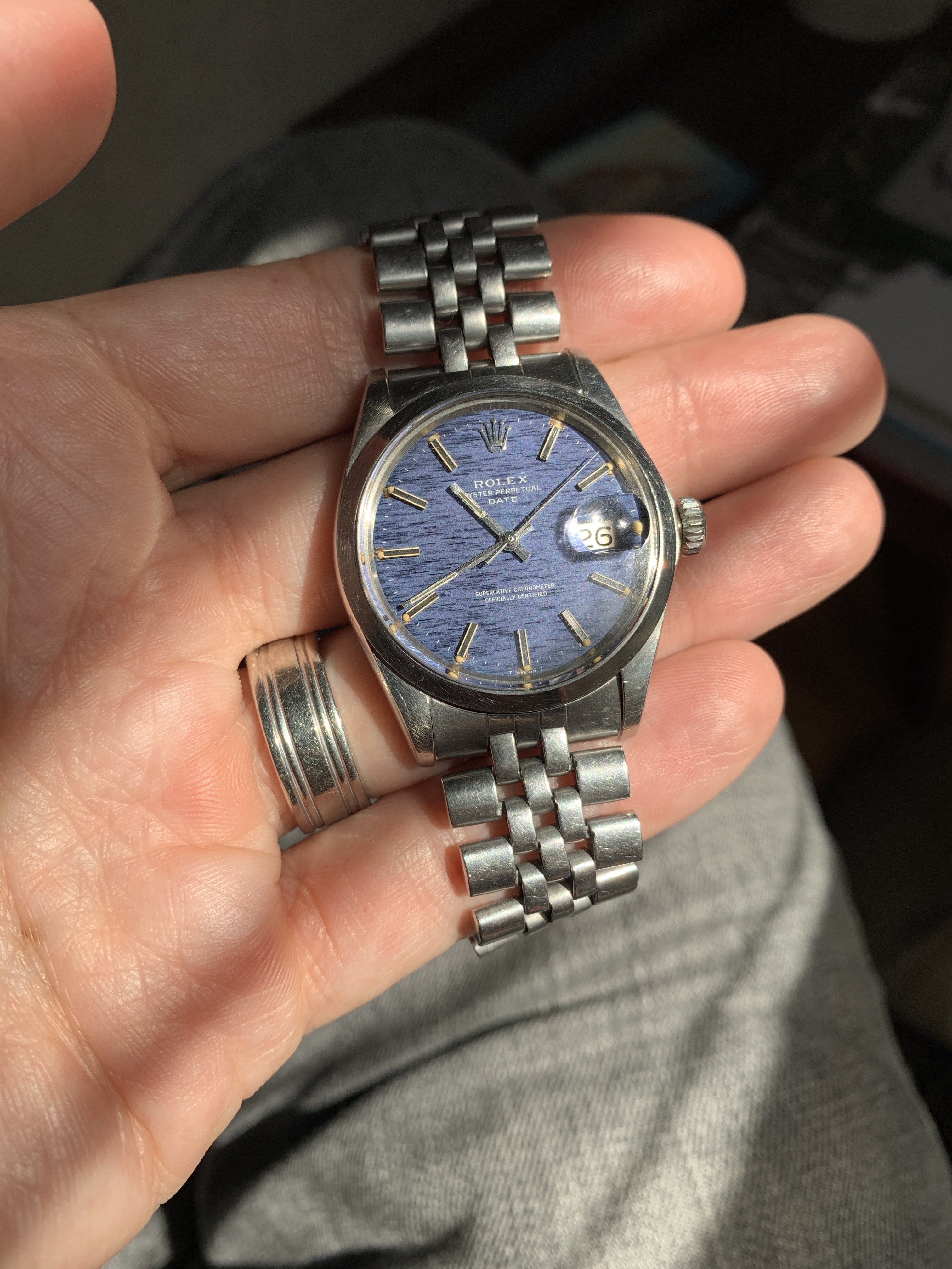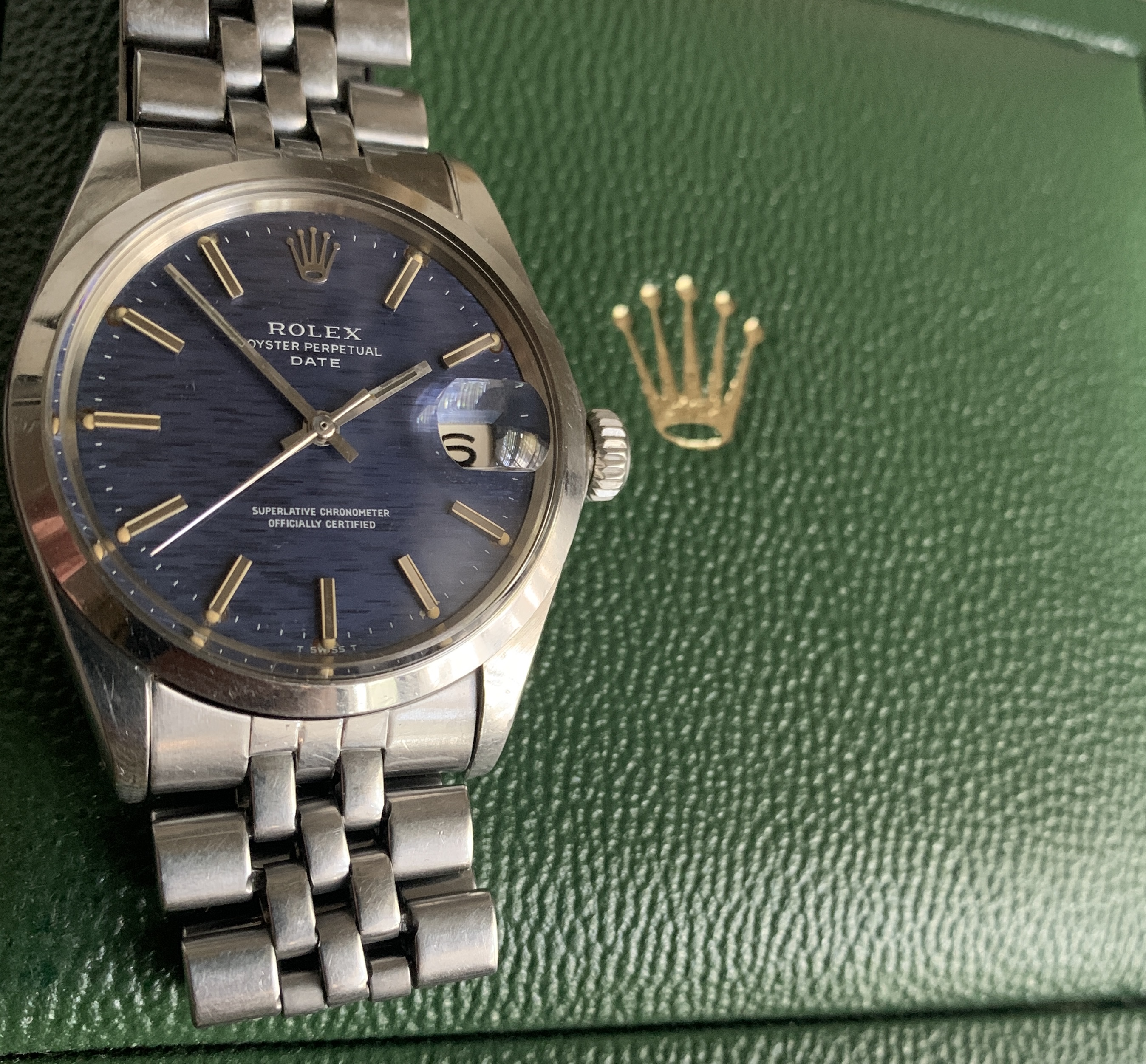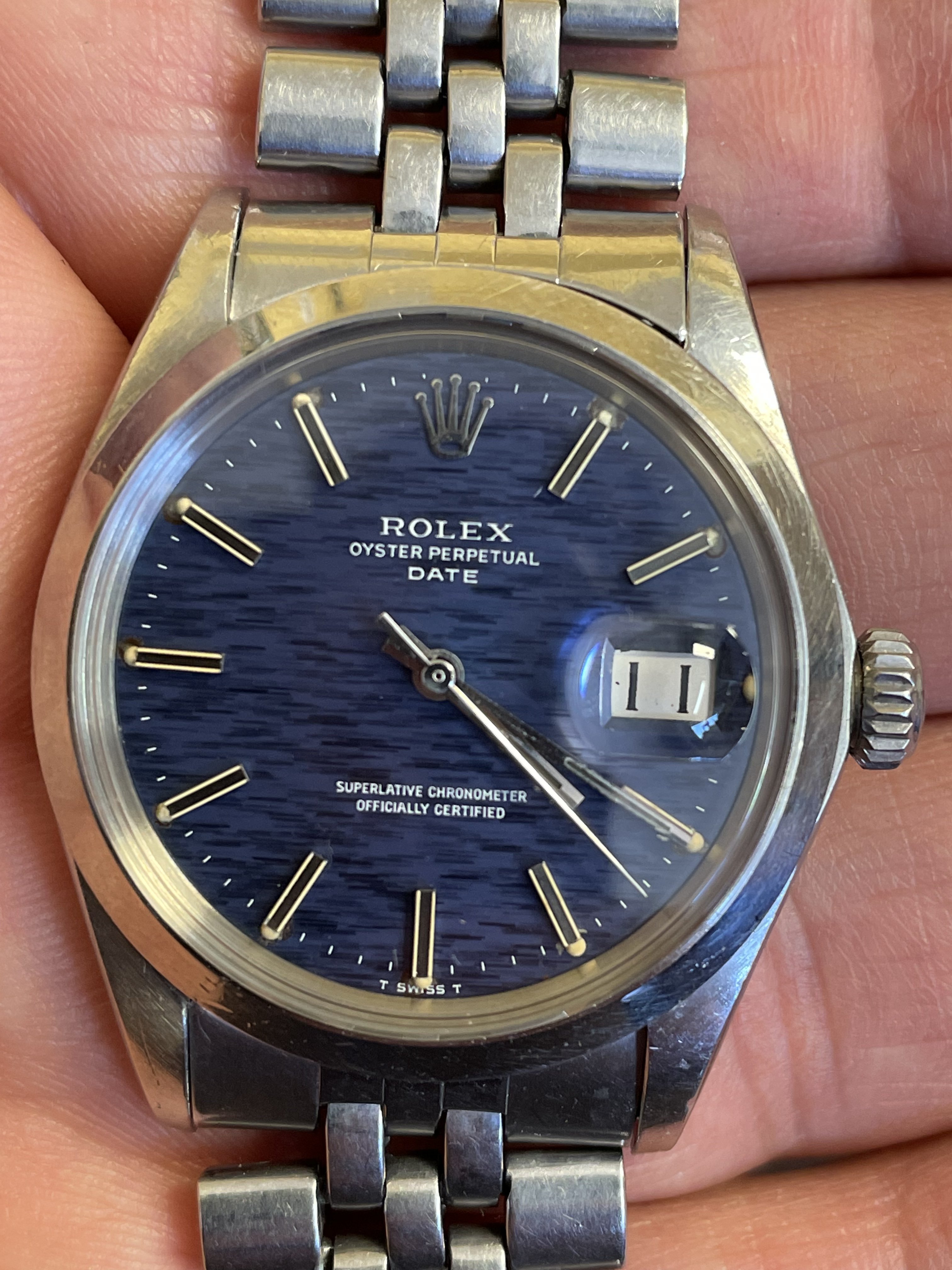 I am offering up this 1971 Rolex Oyster Date with the sweetest of dials, the rare blue mosaic or Shantung dial that was made in limited production for the Japanese market for only a few years. Reference is 1500, which measures 34.5 MM. I’ve had a few of the 1500 references and they wear large, I’d say very similar to a 36mm datejust. The smooth bezel is awesome too.
