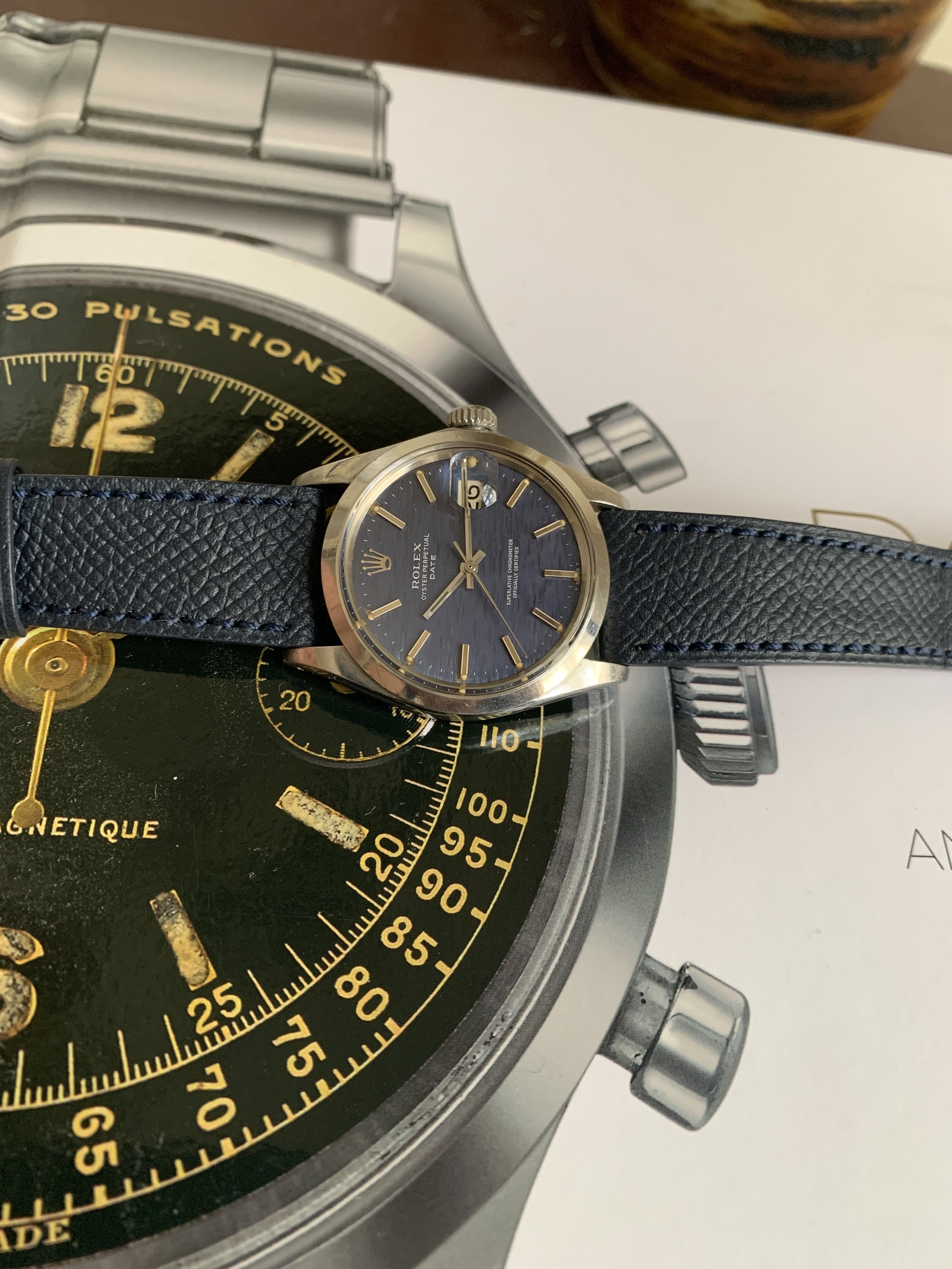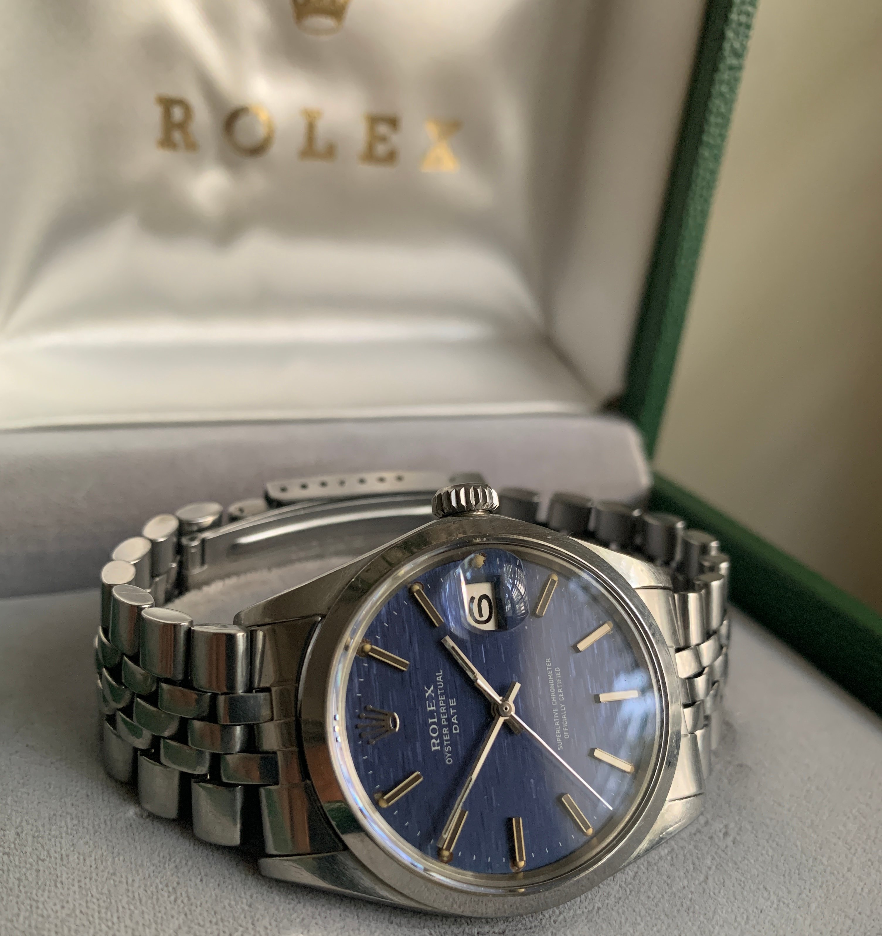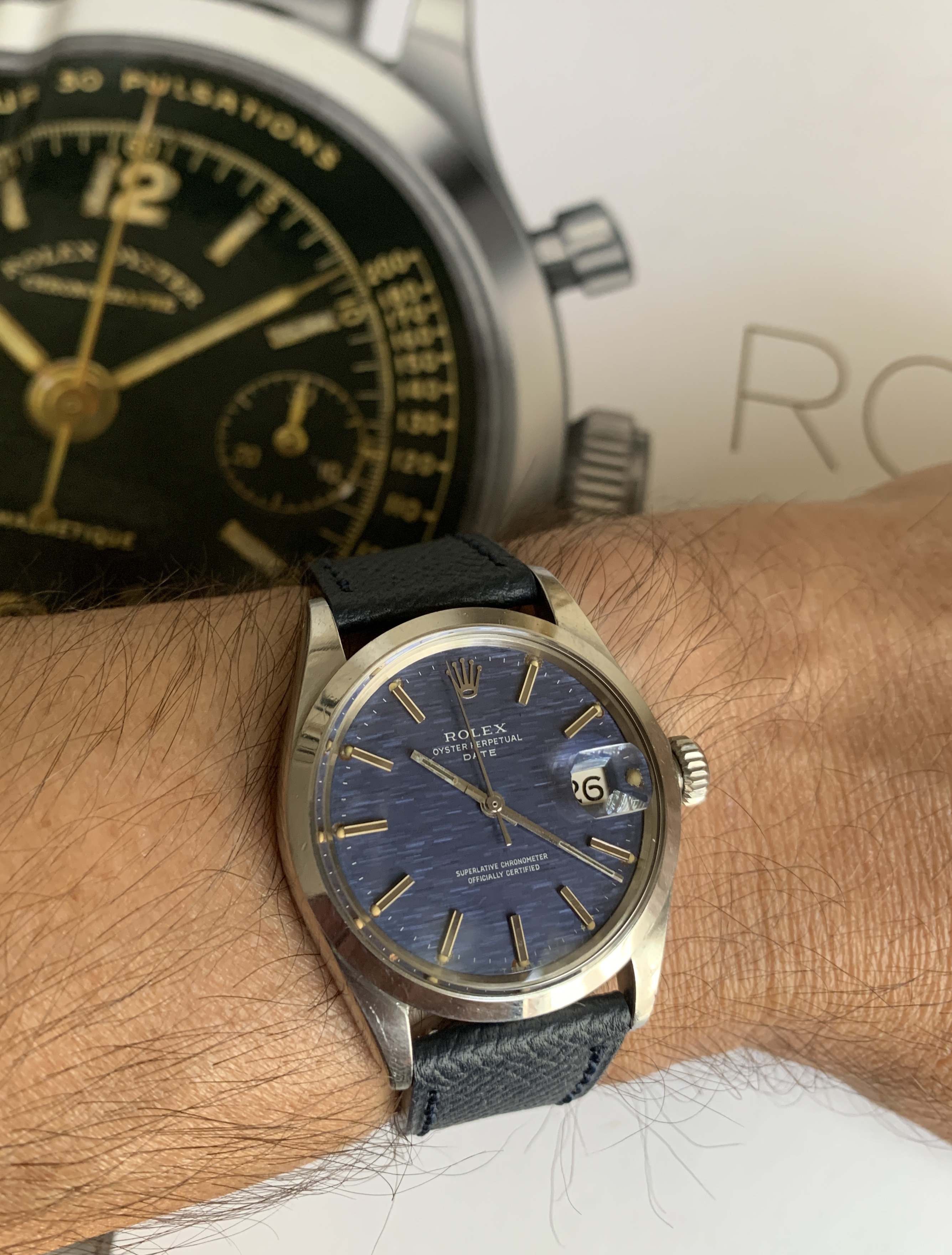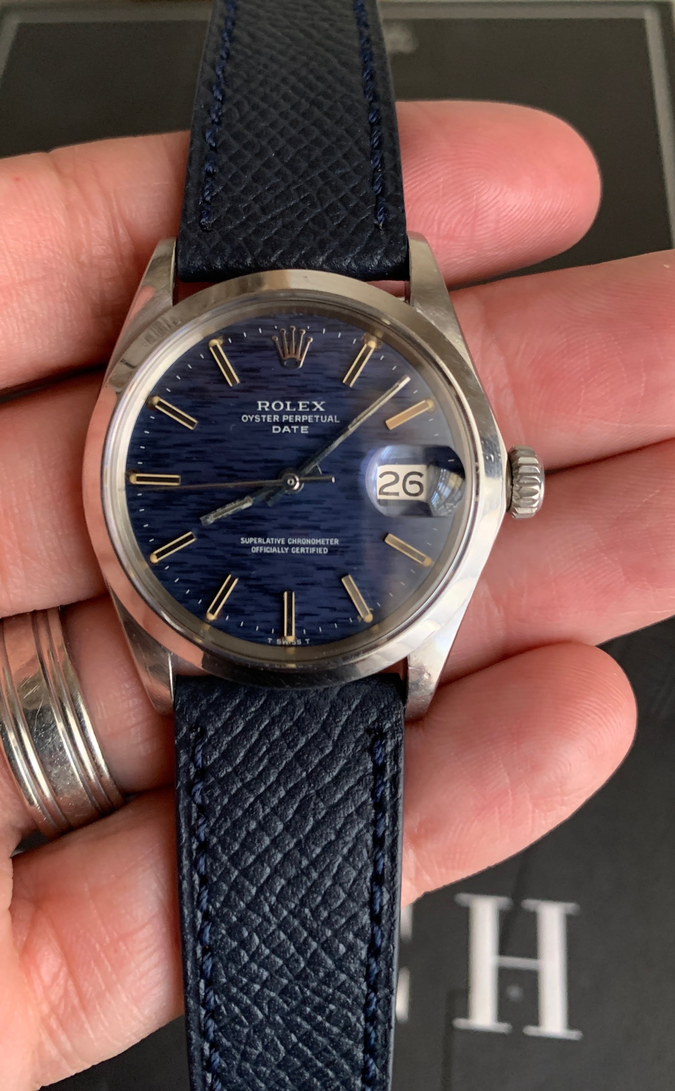 I am offering up this 1971 Rolex Oyster Date with the sweetest of dials, the rare blue mosaic or Shantung dial that was made in limited production for the Japanese market for only a few years. Reference is 1500, which measures 34.5 MM. I’ve had a few of the 1500 references and they wear large, I’d say very similar to a 36mm datejust. The smooth bezel is awesome too.