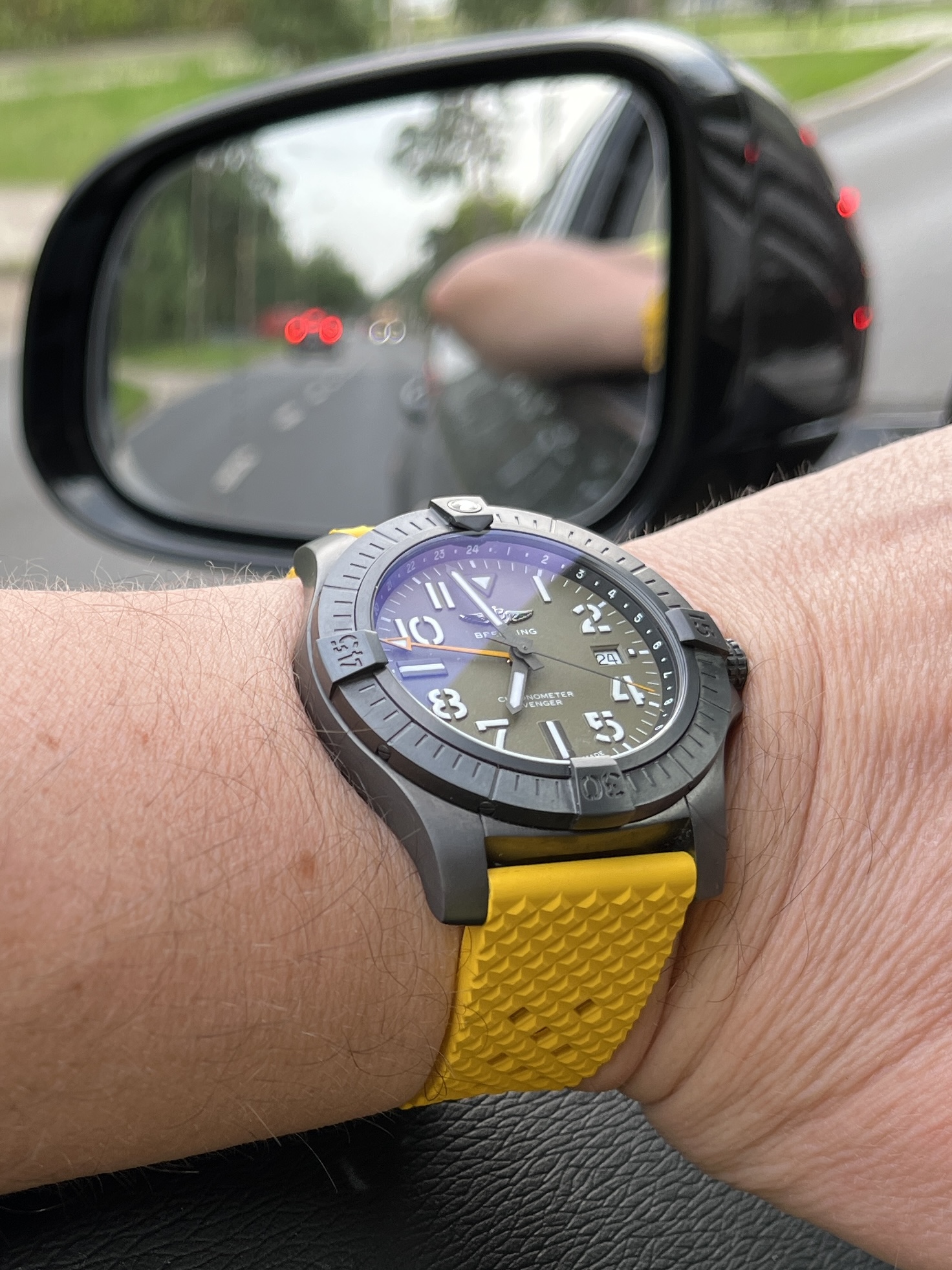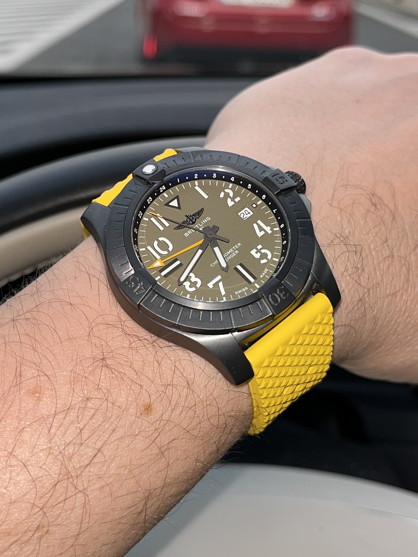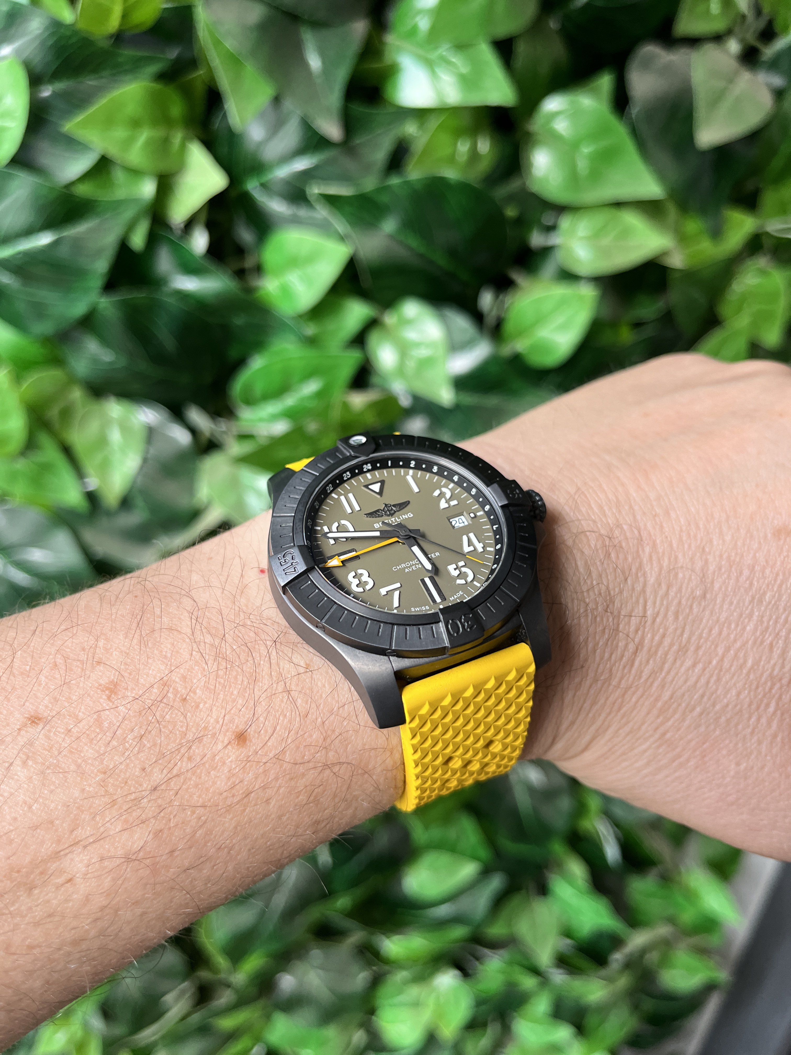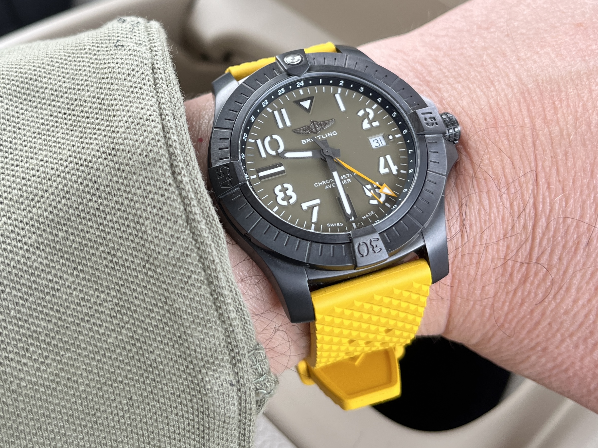 - extra yellow strap (Watch Bandit) with matching black tang buckle (no-name PCV coated steel)