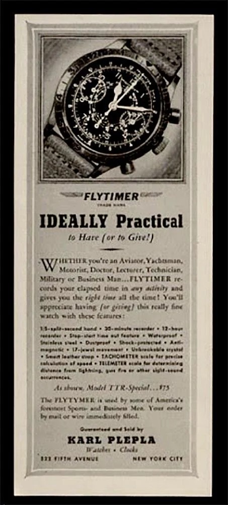 This is an extremely rare watch made by Karl Plepla, a former watchmaker for Tiffany & Co. in the 1920s. Mr. Plepla ventured out on his own after a stint with Gruen in the 1930s, and produced watches on order for the Armed Forces and under other contracts, in conjunction with Jardur . This watch, named the Flytimer, was designed for use in aviation, and came with white and black gloss-gilt dials, powered by Valjoux 71/72 movements in the 1940s.