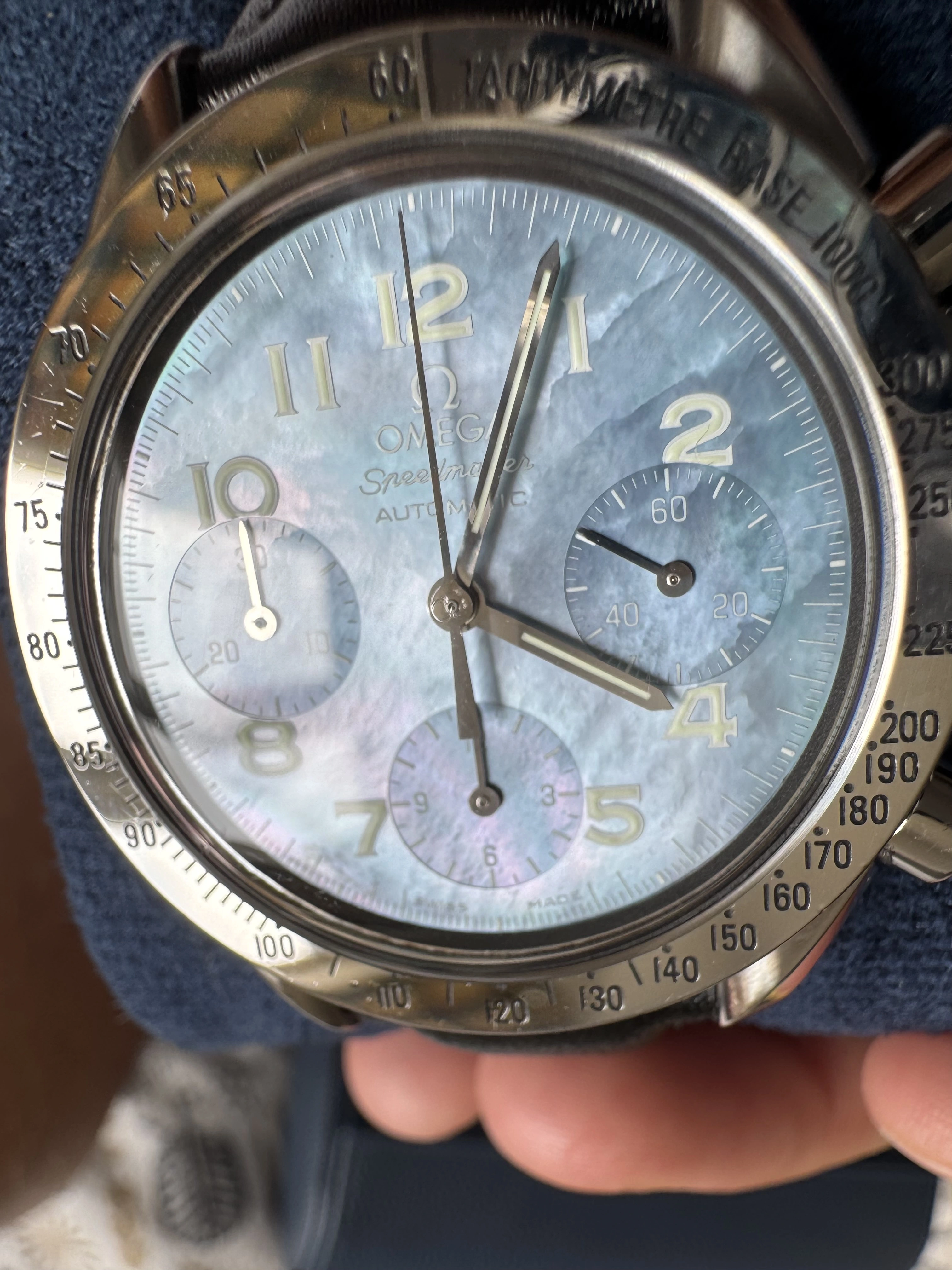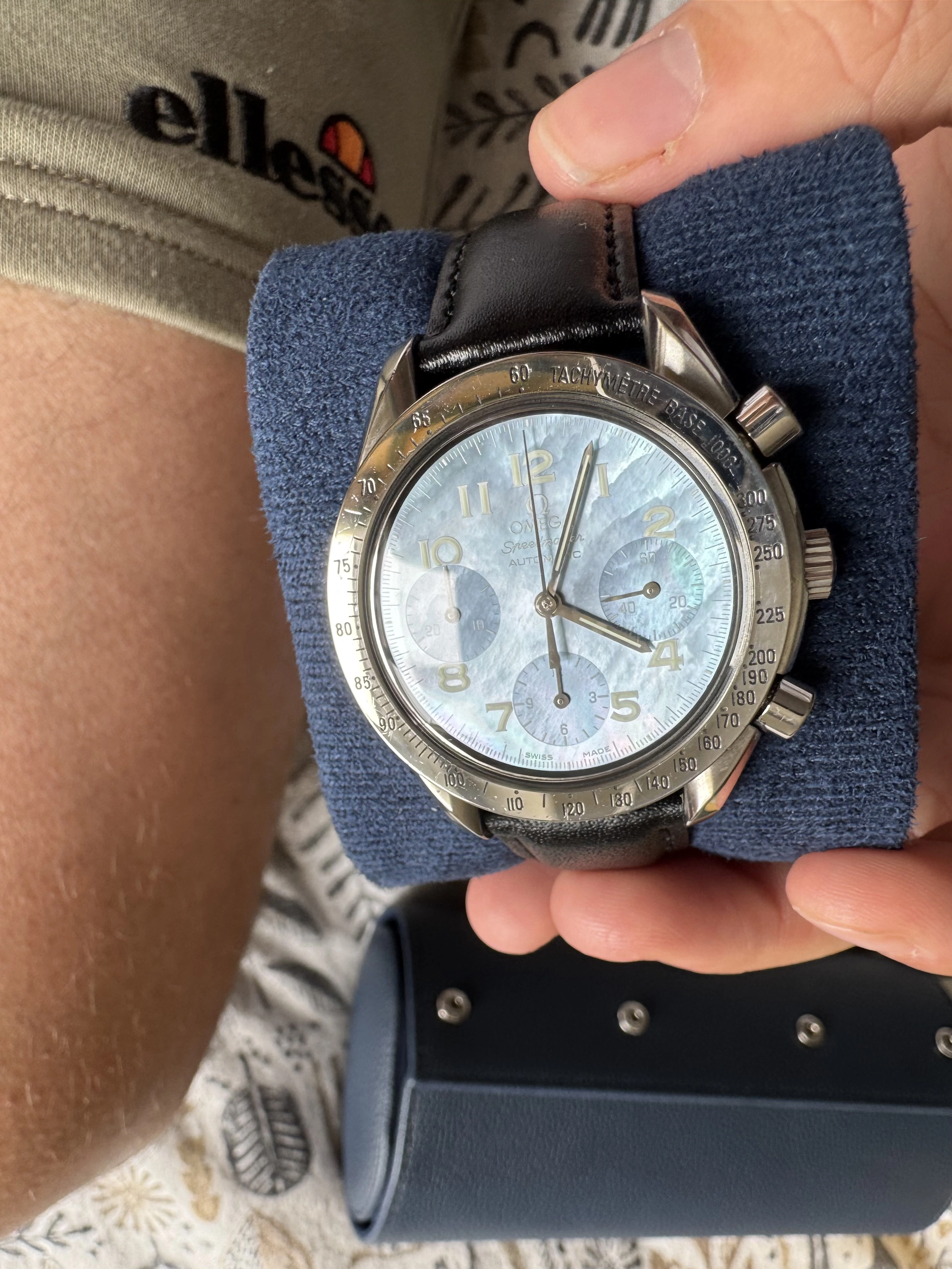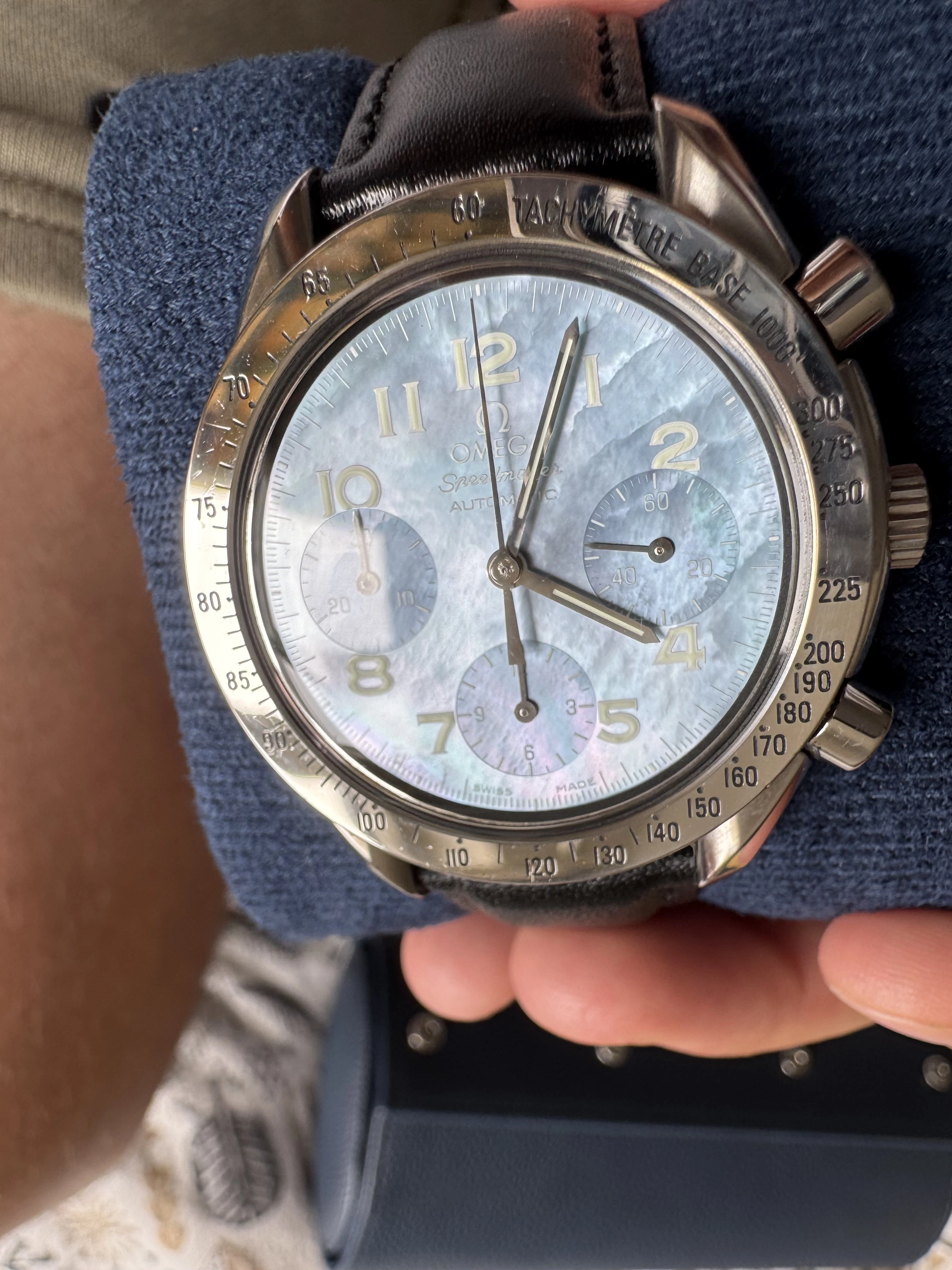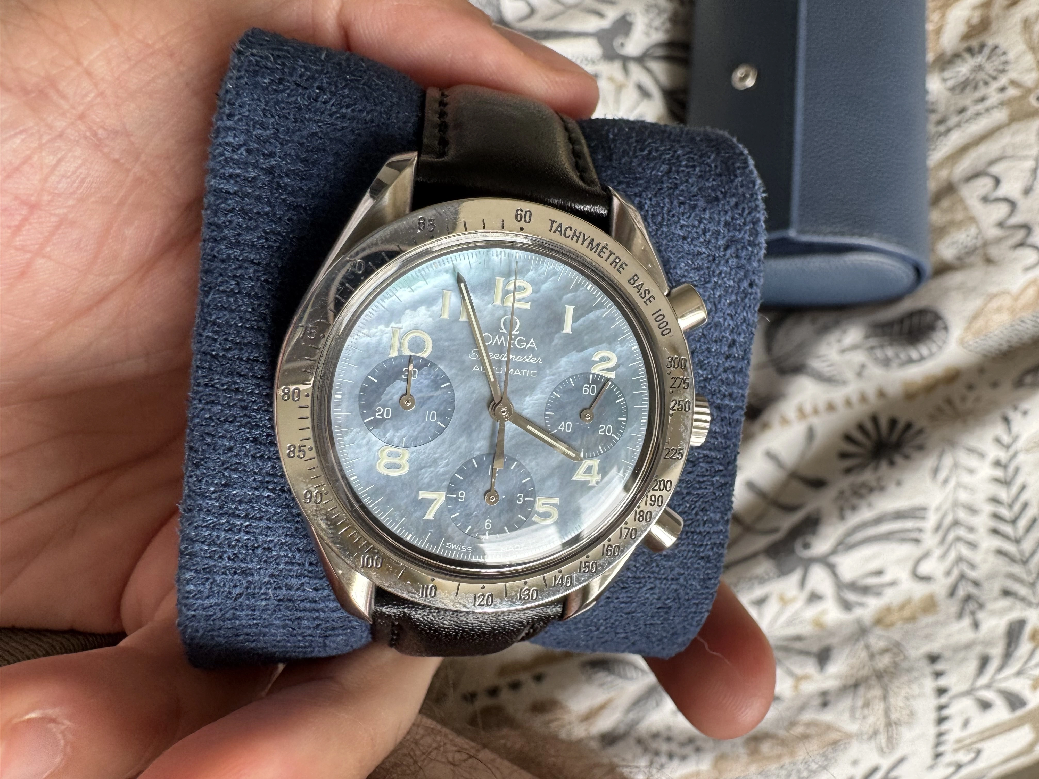 It’s a blue mother of pearl Speedmaster Reduced with reference 3502.73 from around 1998/9