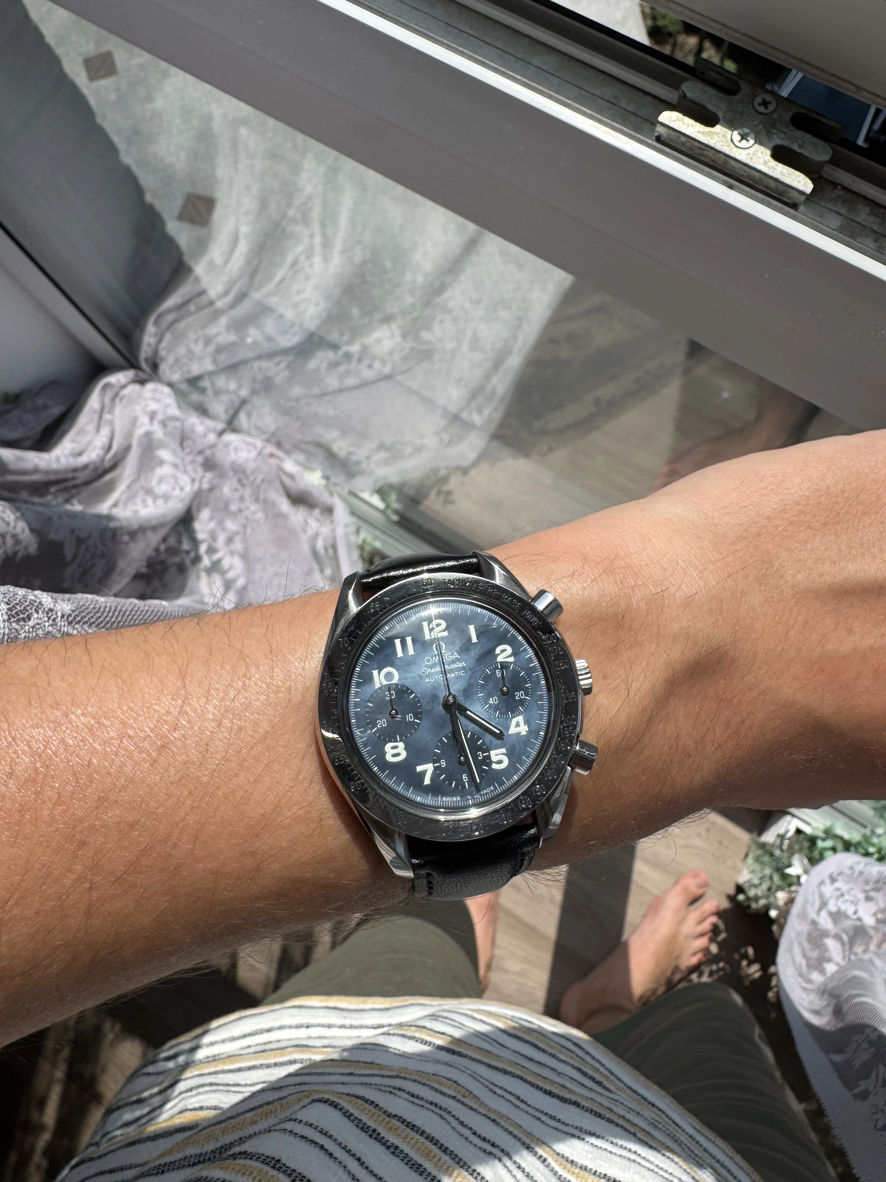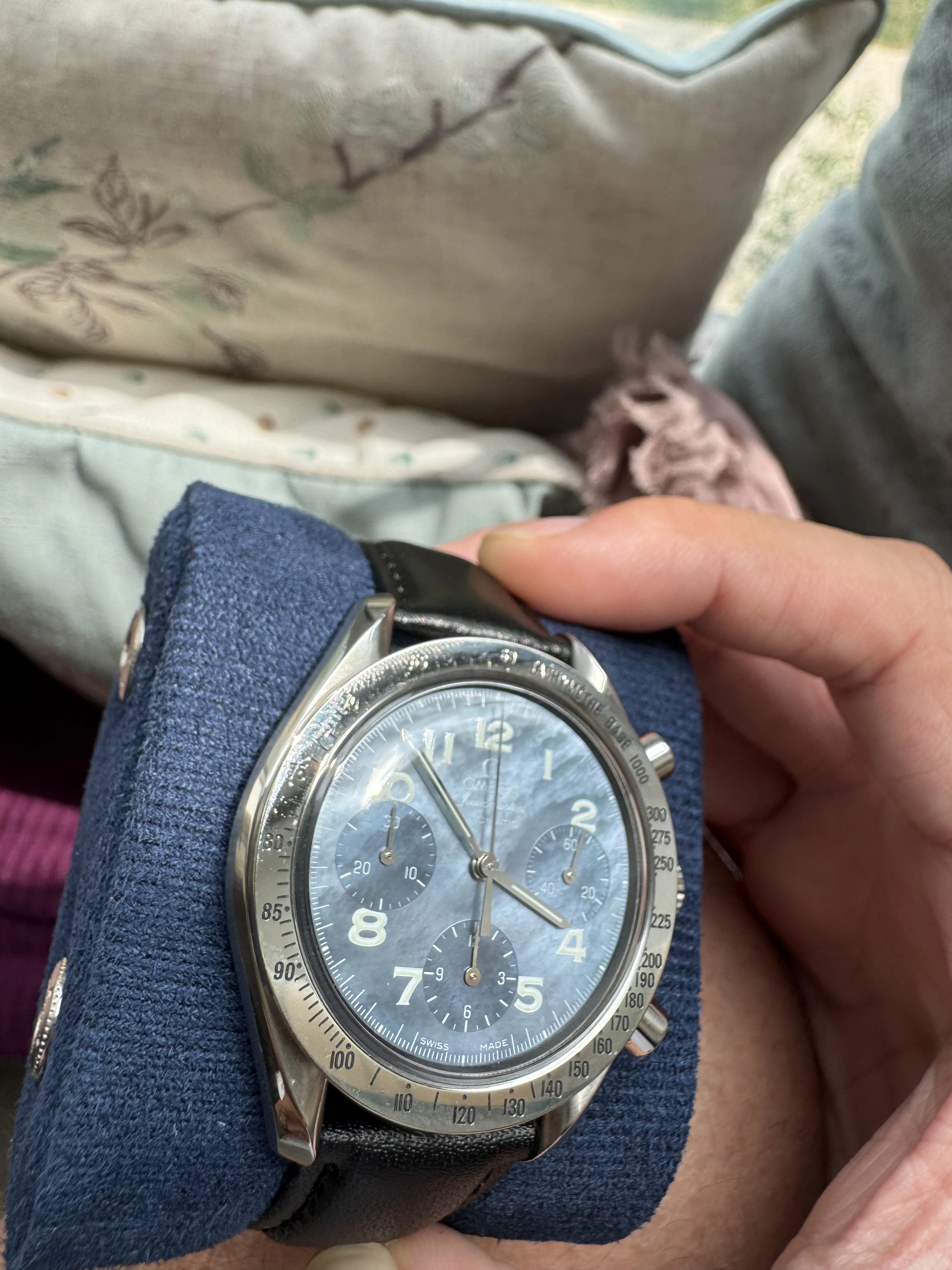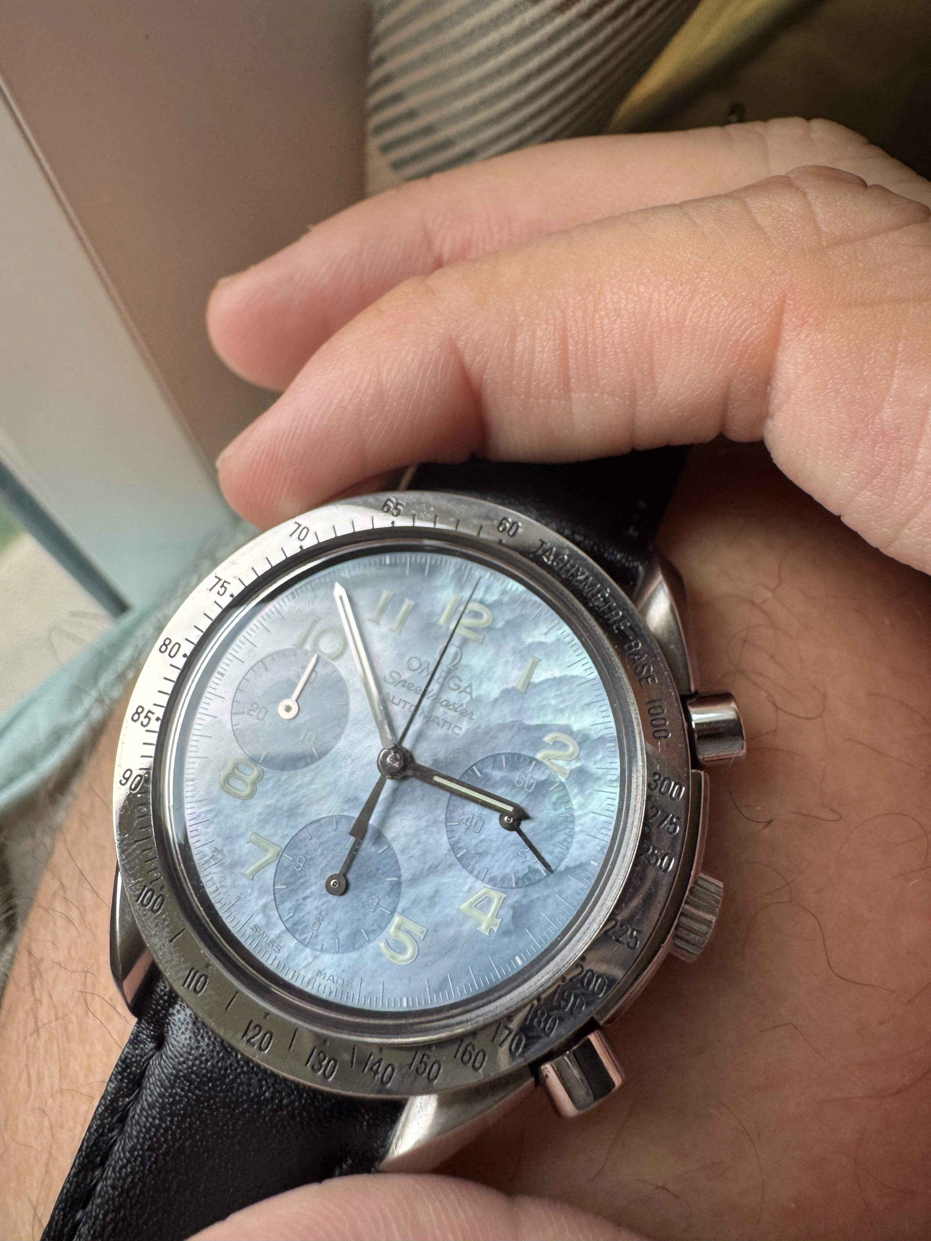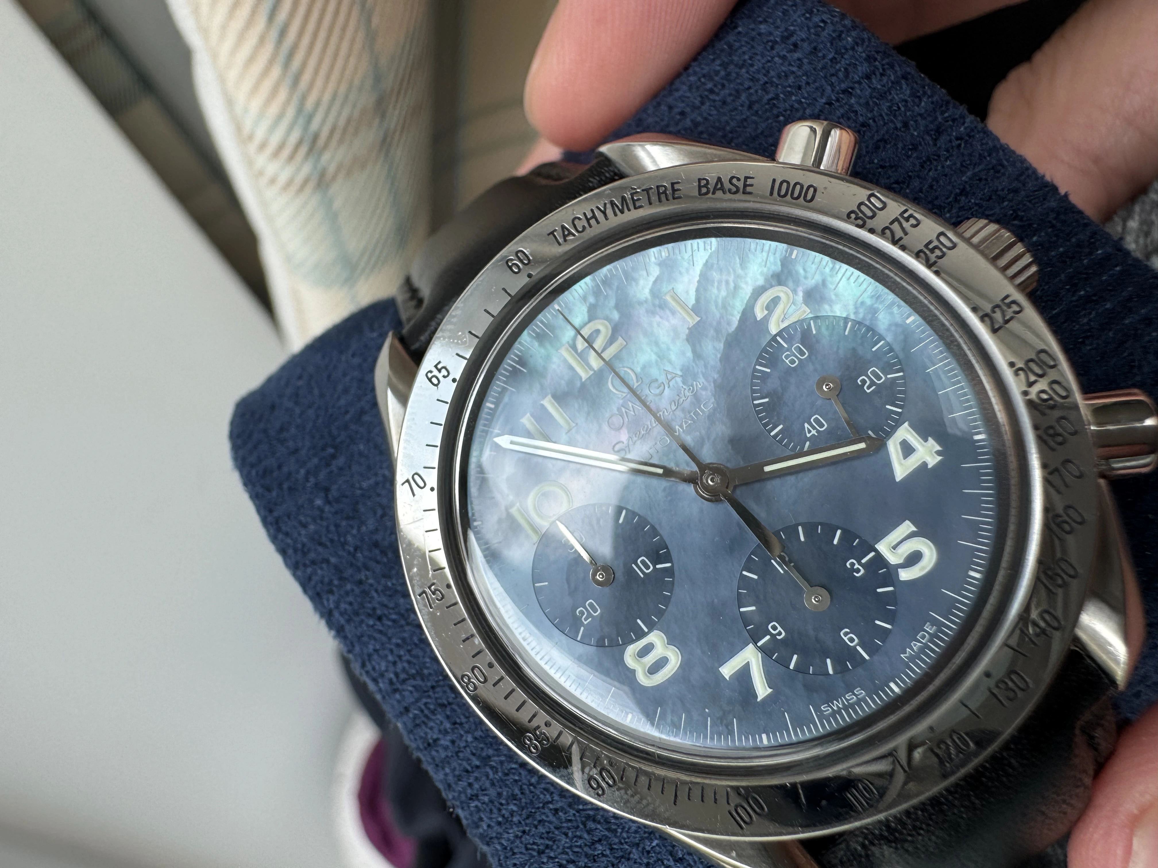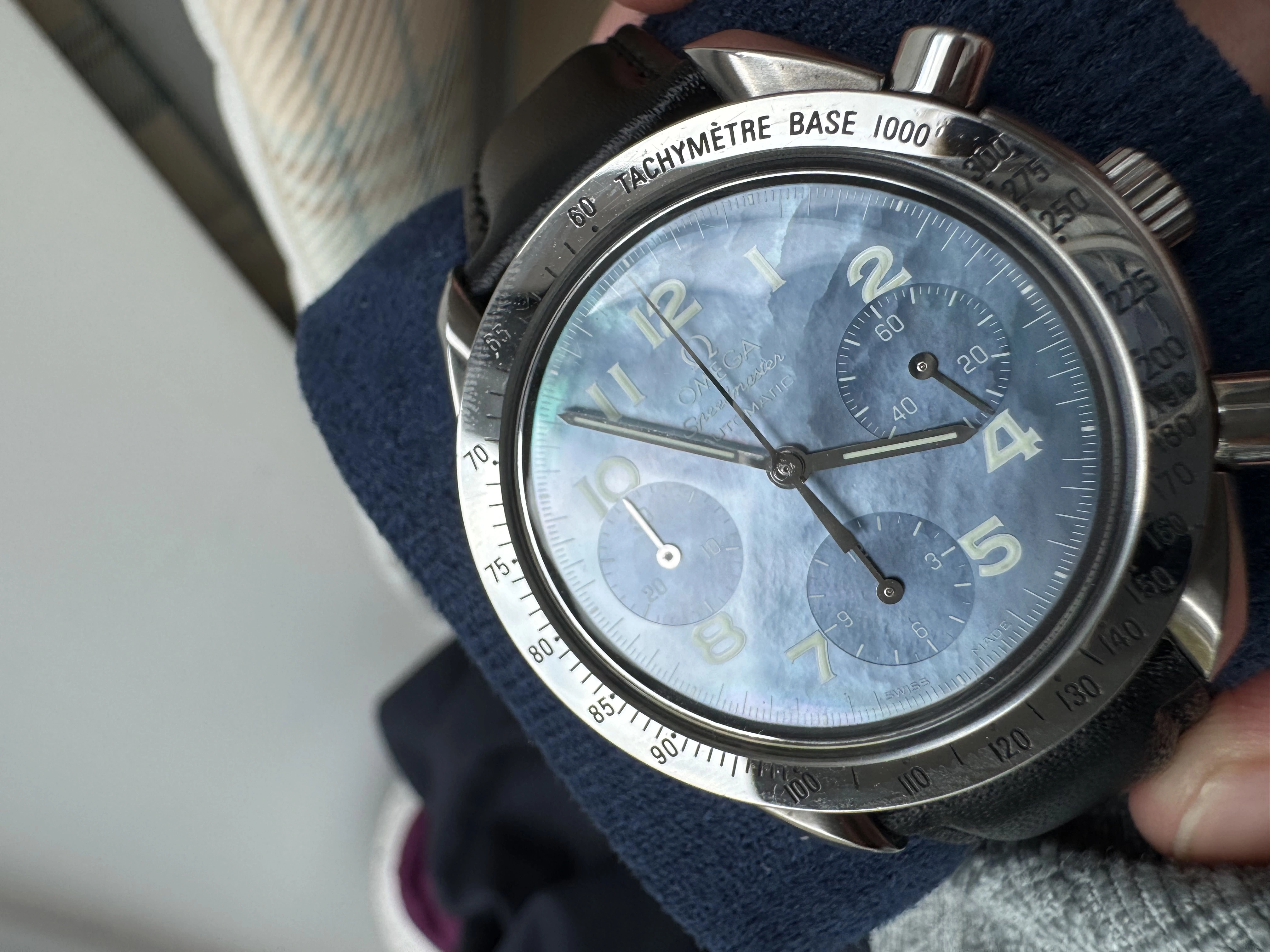 It’s a blue mother of pearl Speedmaster Reduced with reference 3502.73 from around 1998/9