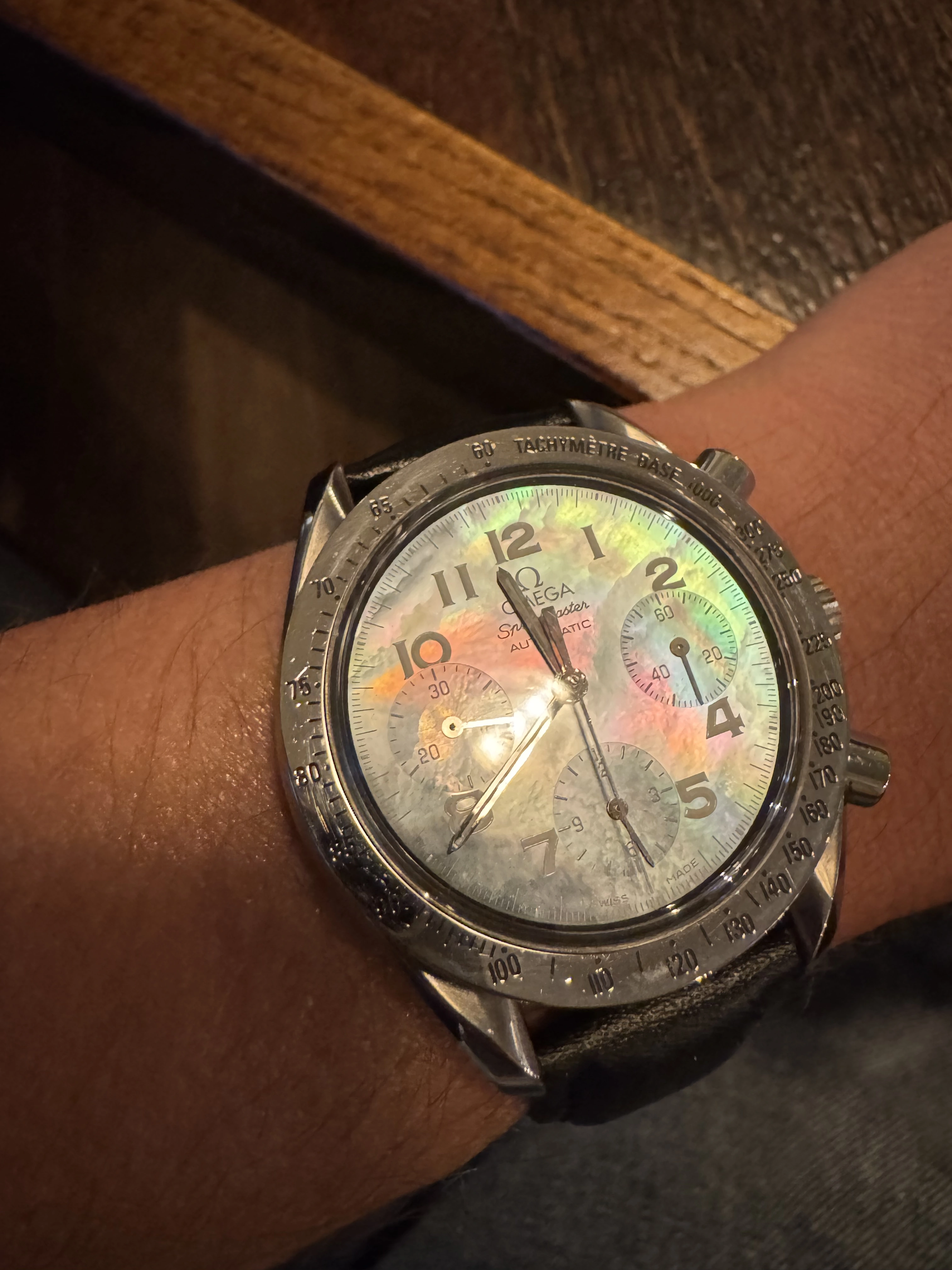 What do we think? A fairly rare bird not being a popular watch at the time of production with few sold. It catches the light in the most stunning way, with flashes of light blue, deep blue and pink. I’m thrilled with it. It won’t be for everyone of course, being a reduced and a striking one to boot.