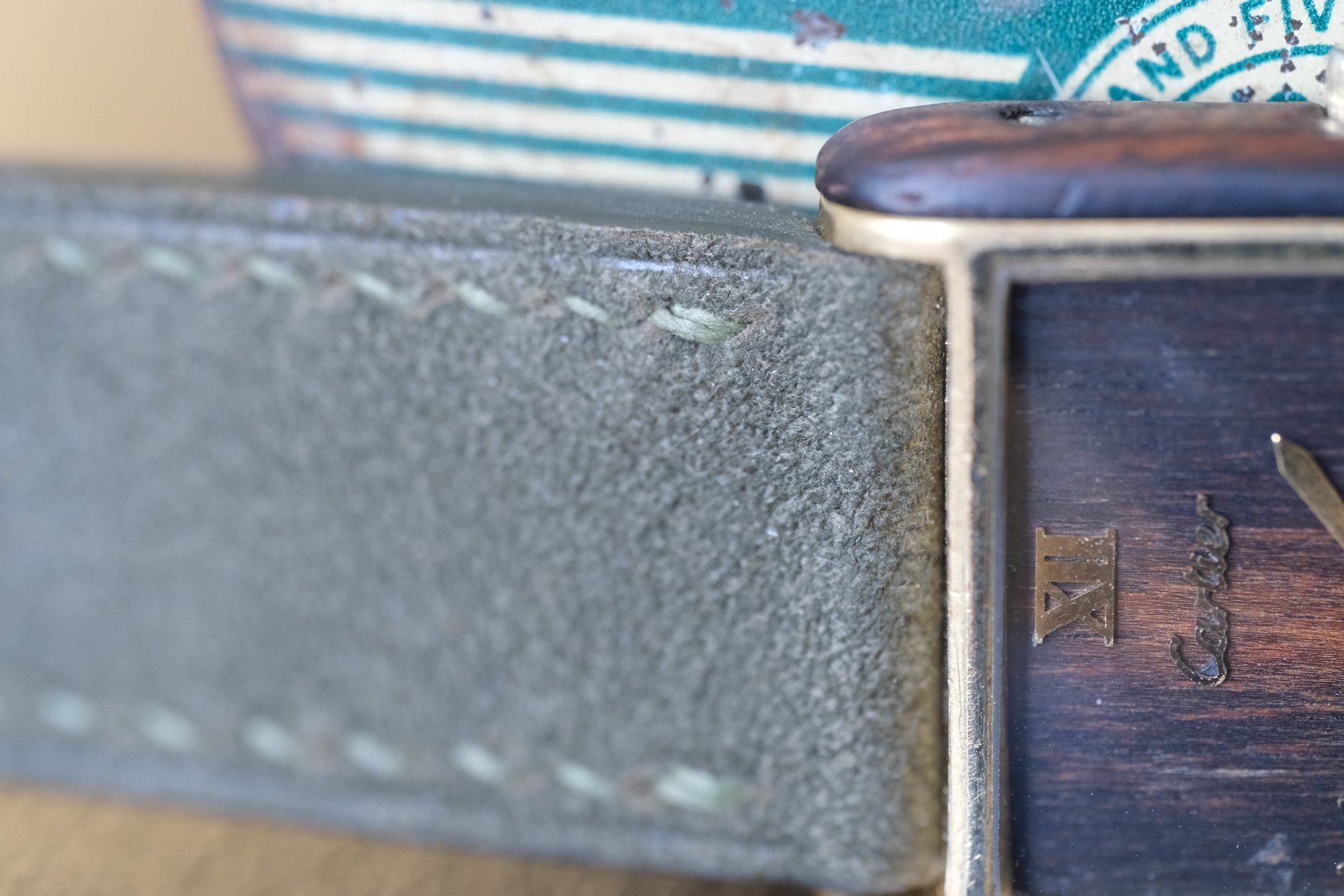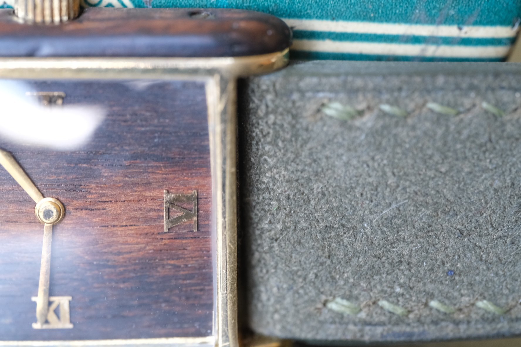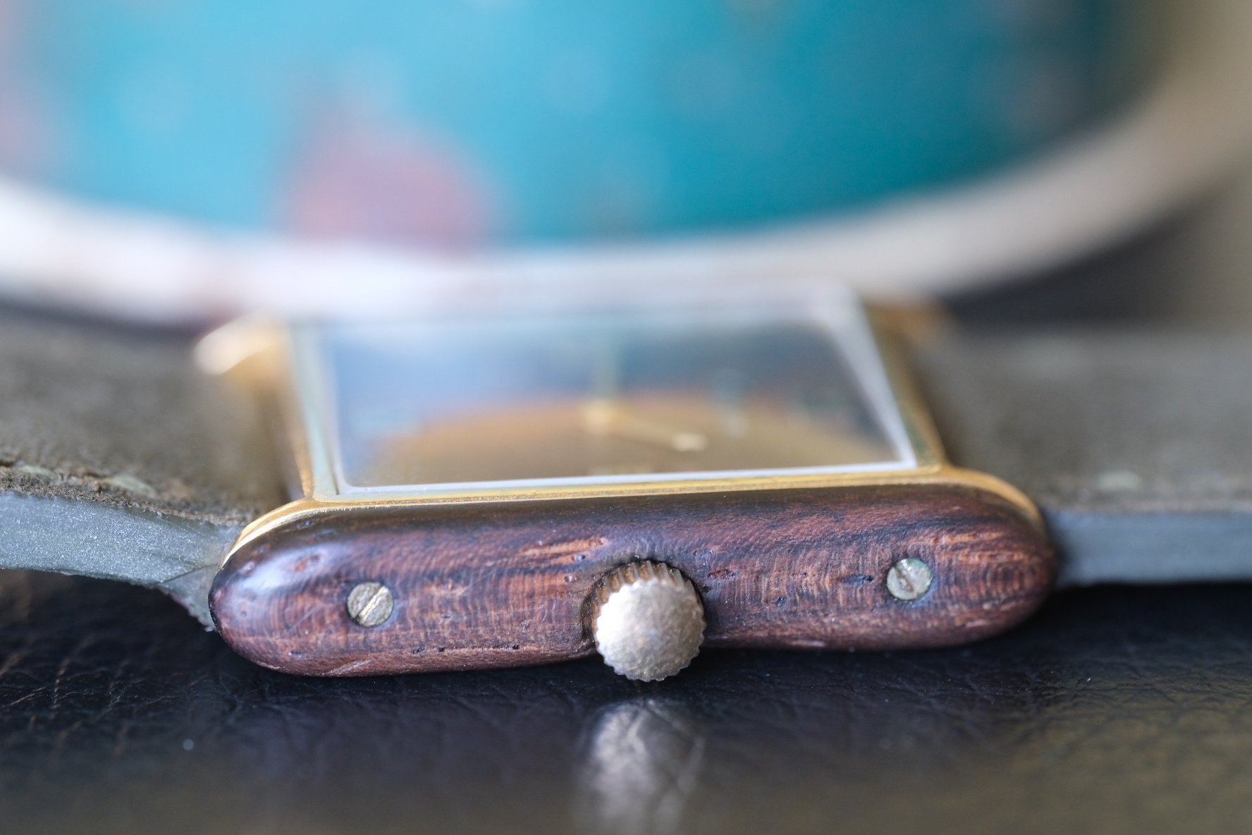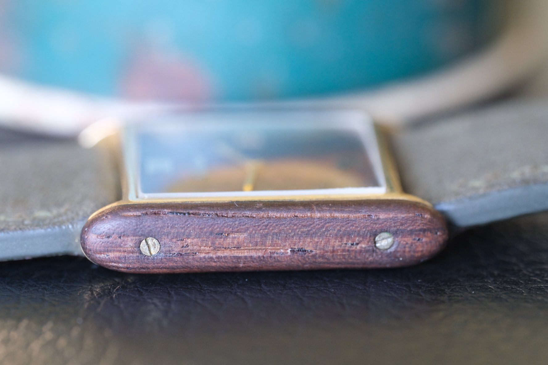 CASE: This is slightly wider than your average vintage men’s Tank at 24.5mm by 30mm, giving it some nice extra presence as seen on my 6.5 inch wrist. You’ve got more solid Brazilian rosewood on the sides, in darker shade with lighter sections as well, playing off the dial perfectly. Case sides have light natural wear, and the crown was replaced at some point, although this one fits the watch nicely. Also wear to the case back, which is common with these. All in presents beautifully!