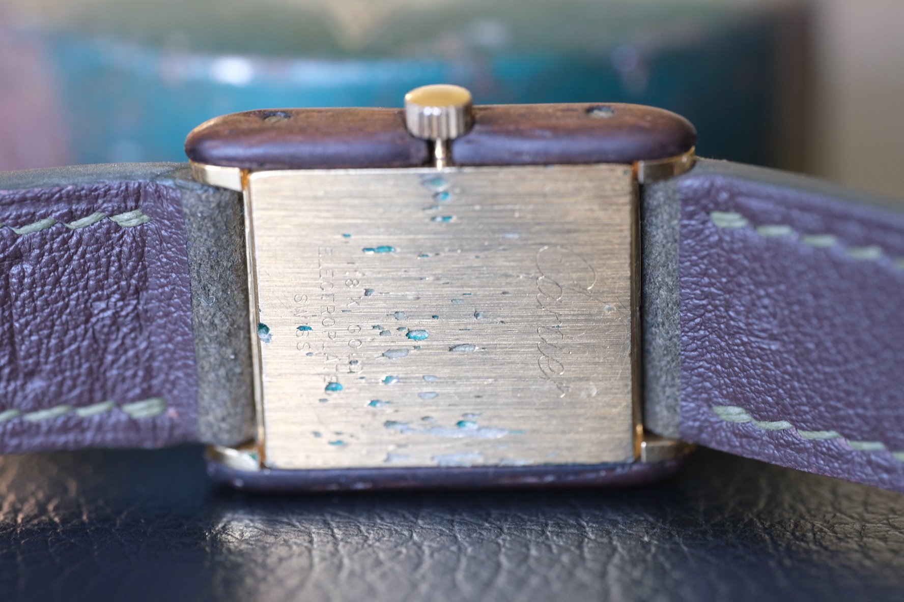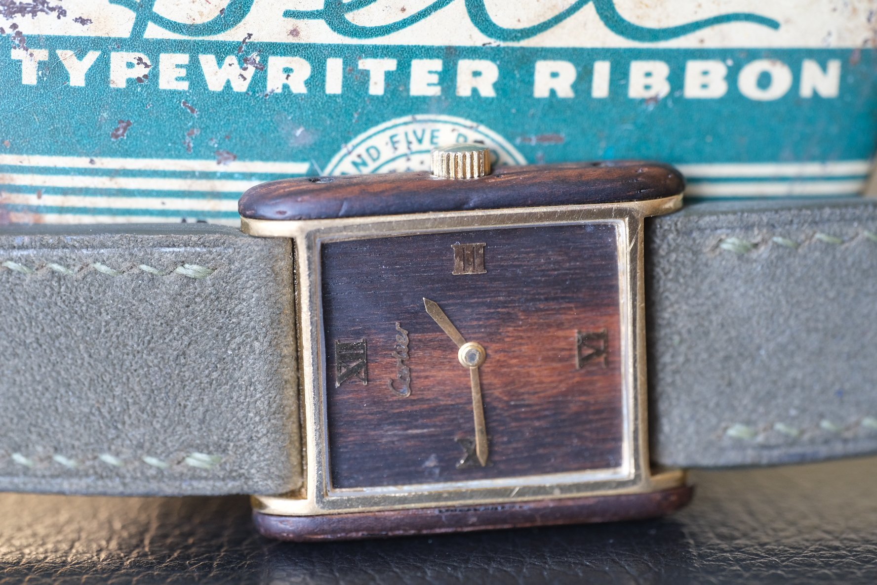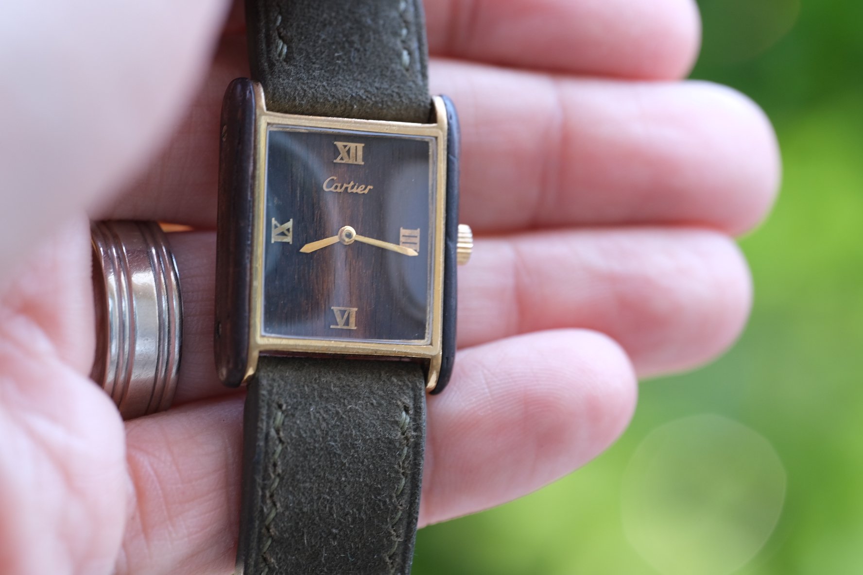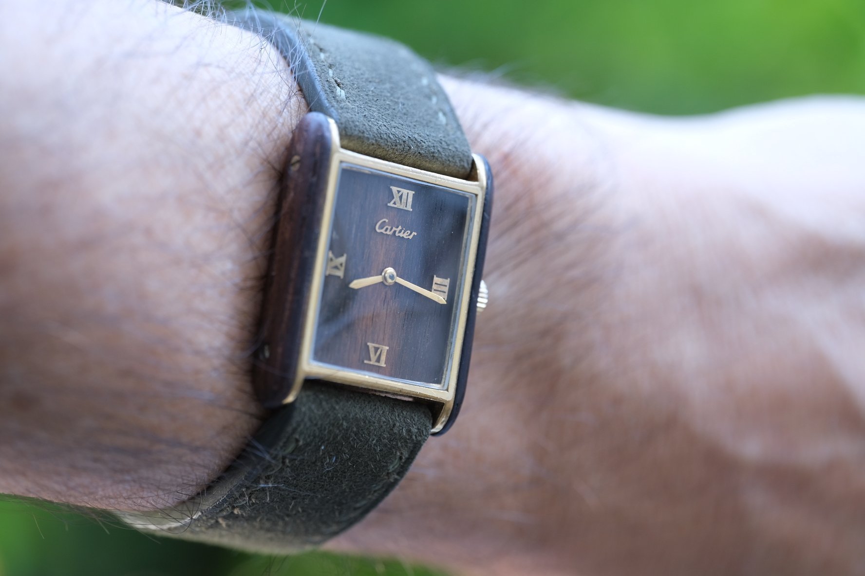 STRAP: Comes on a brand new dark green hand made suede strap, adding to the organic look (ya get the whole tree!) also comes with its original Cartier buckle, with light plating wear.