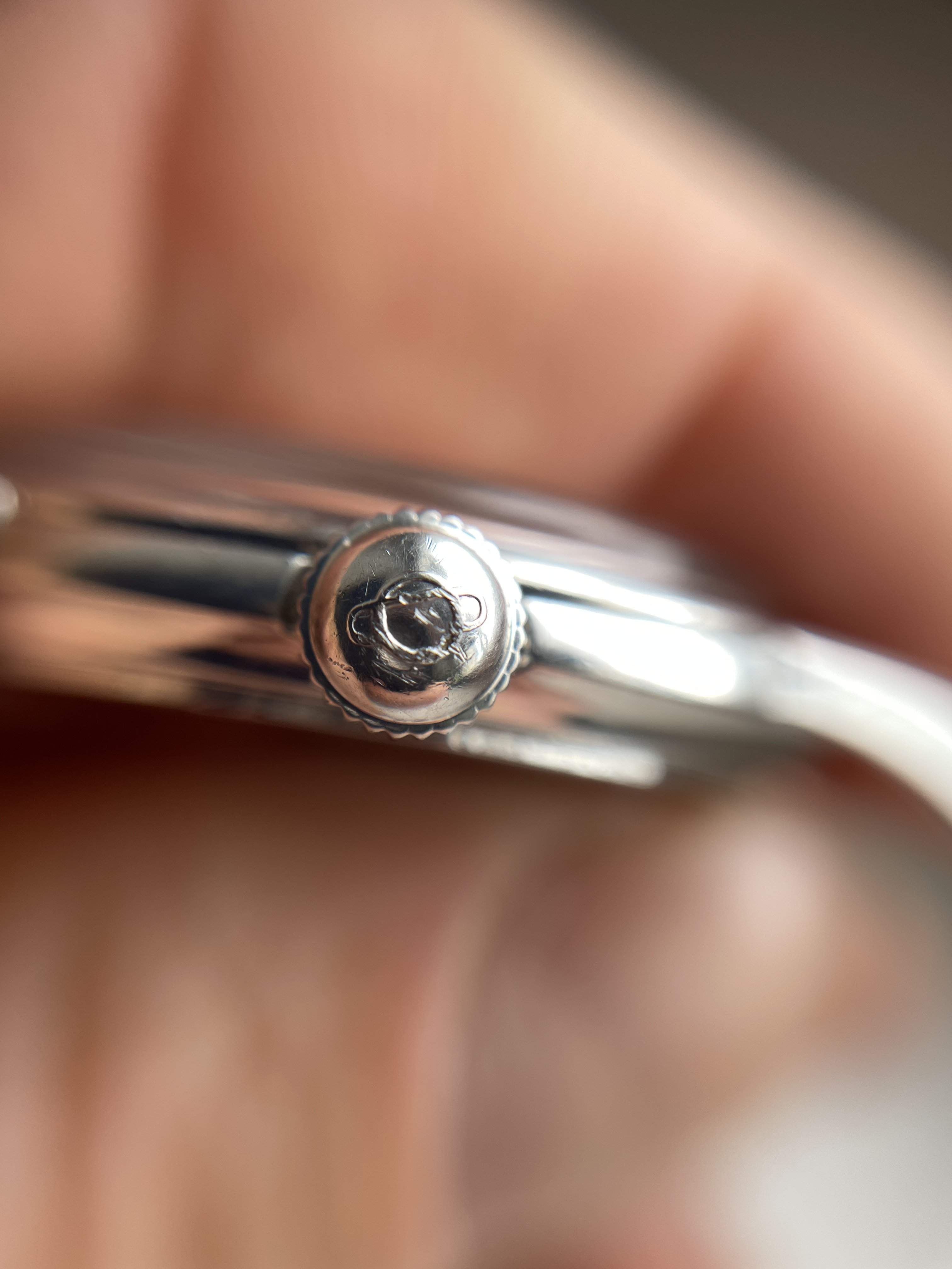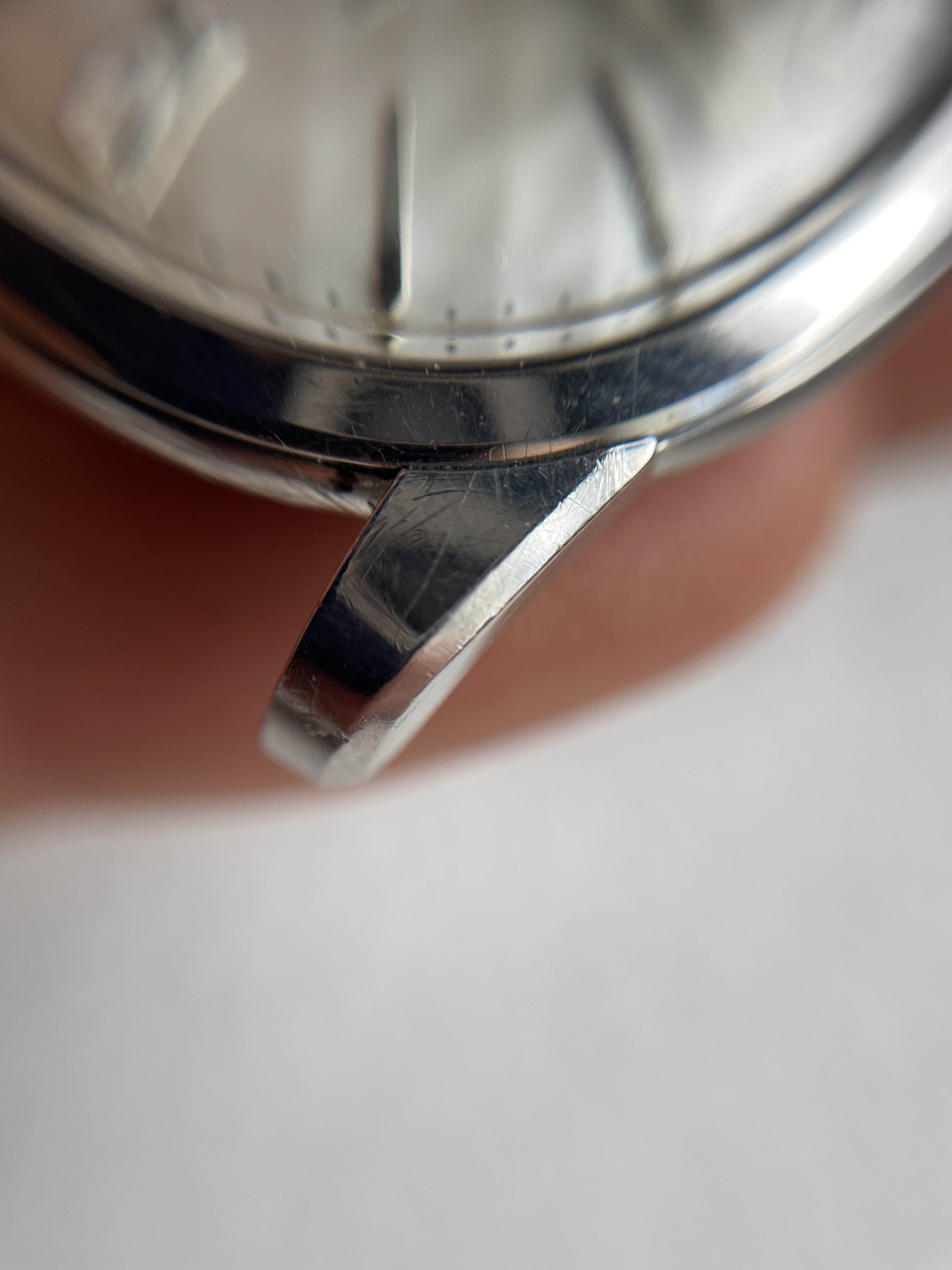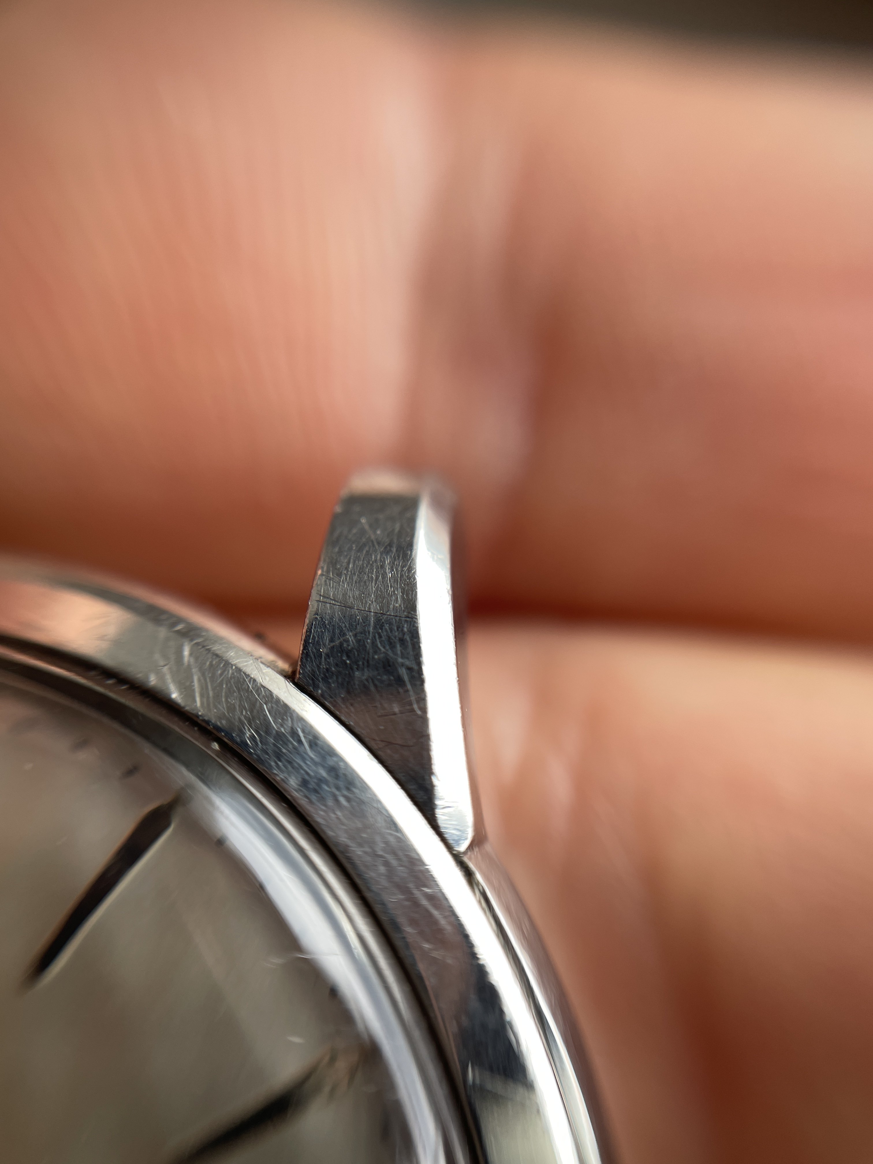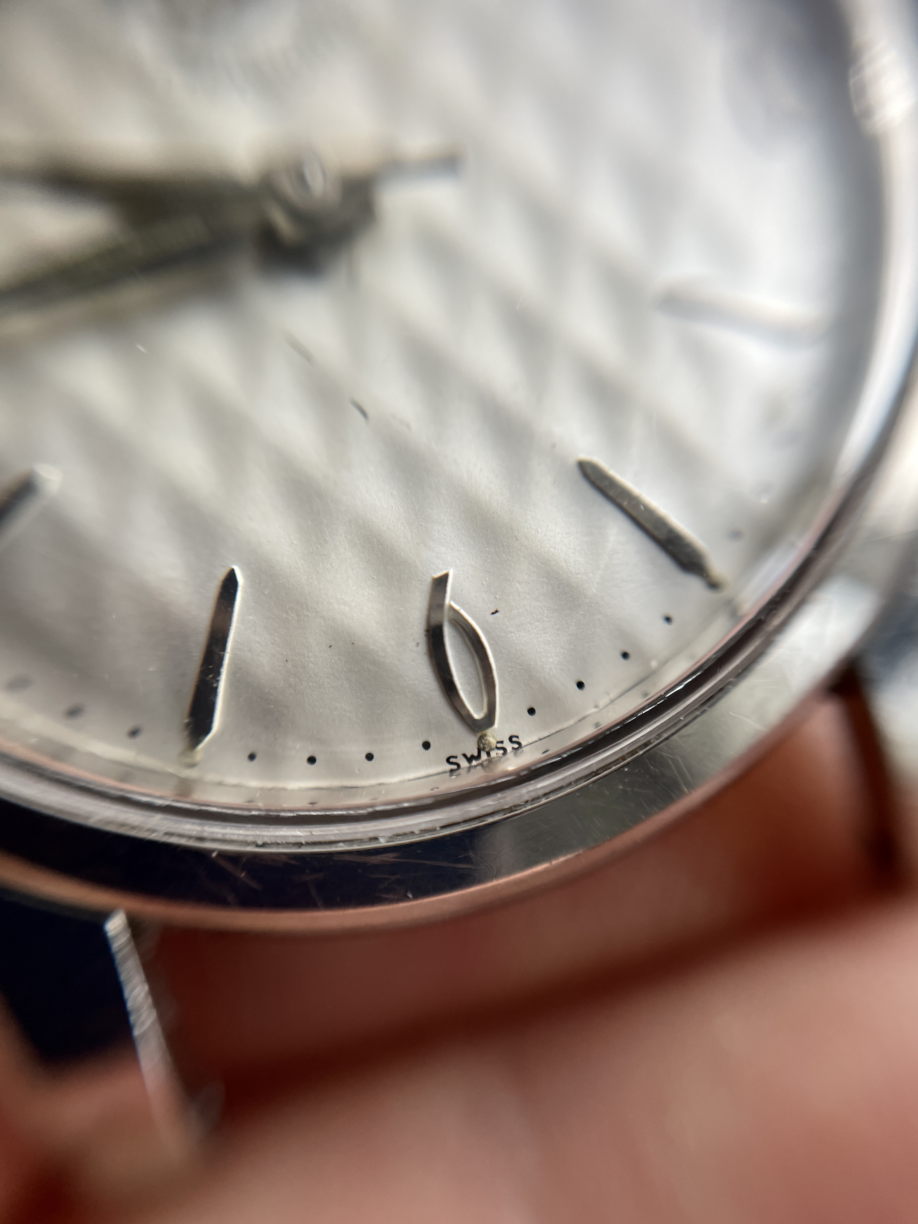 The case is super sharp and have very distinct bevels, only minor scratches can be found. It measures around 34mm excluding the original signed crown (that has some scratches, see macro photos). Patened waterproof EPSA compressor, I don't have the proper tools to open the caseback up unfortunately.