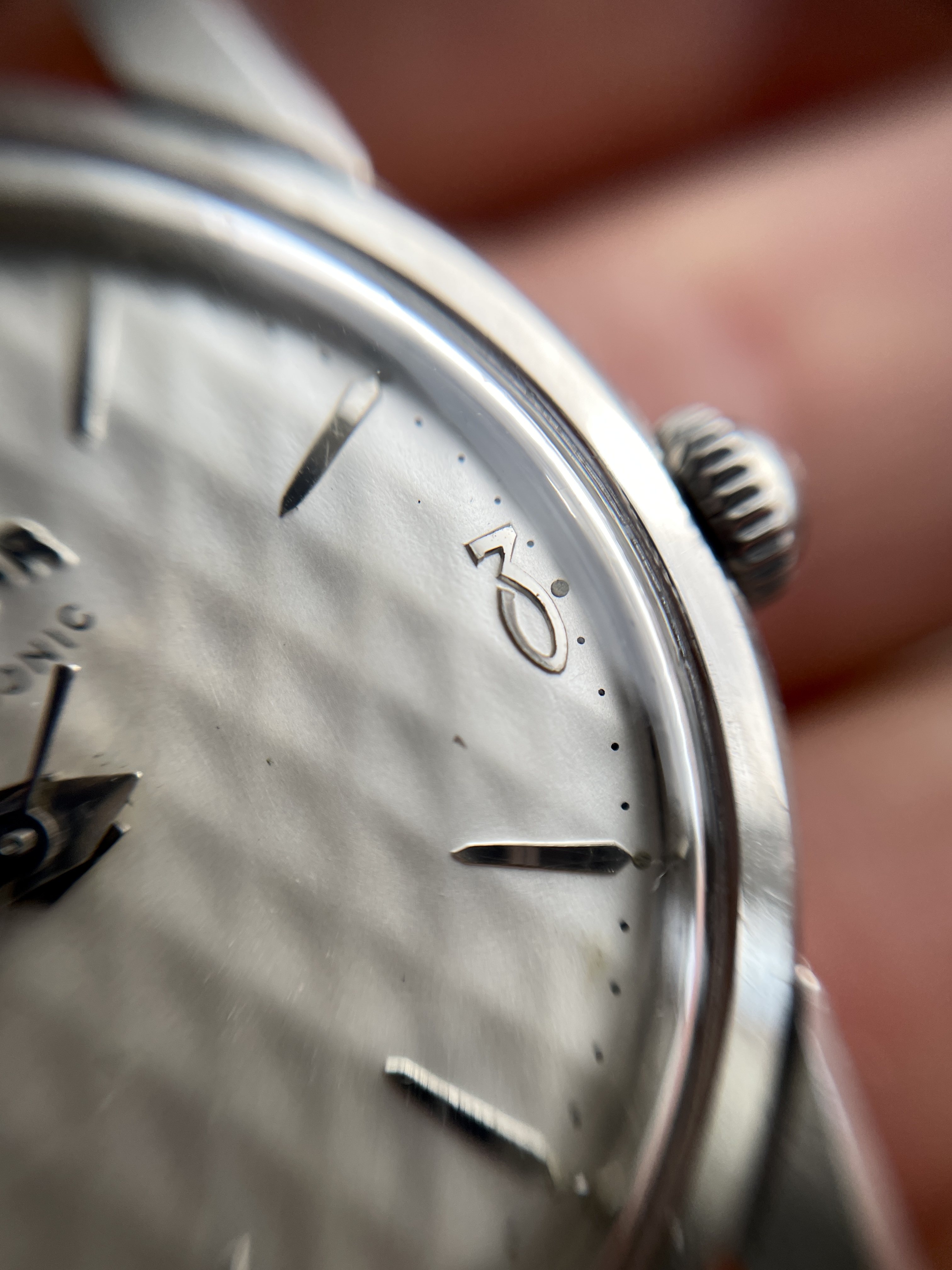Dial is nicely preserved except a few scratches under the center and one small at 3 o'clock (see macro photos) they are not something that is bothering to much IRL. Cool numerals and indices in silver, lume has turned more to the green-grey ish colour.
