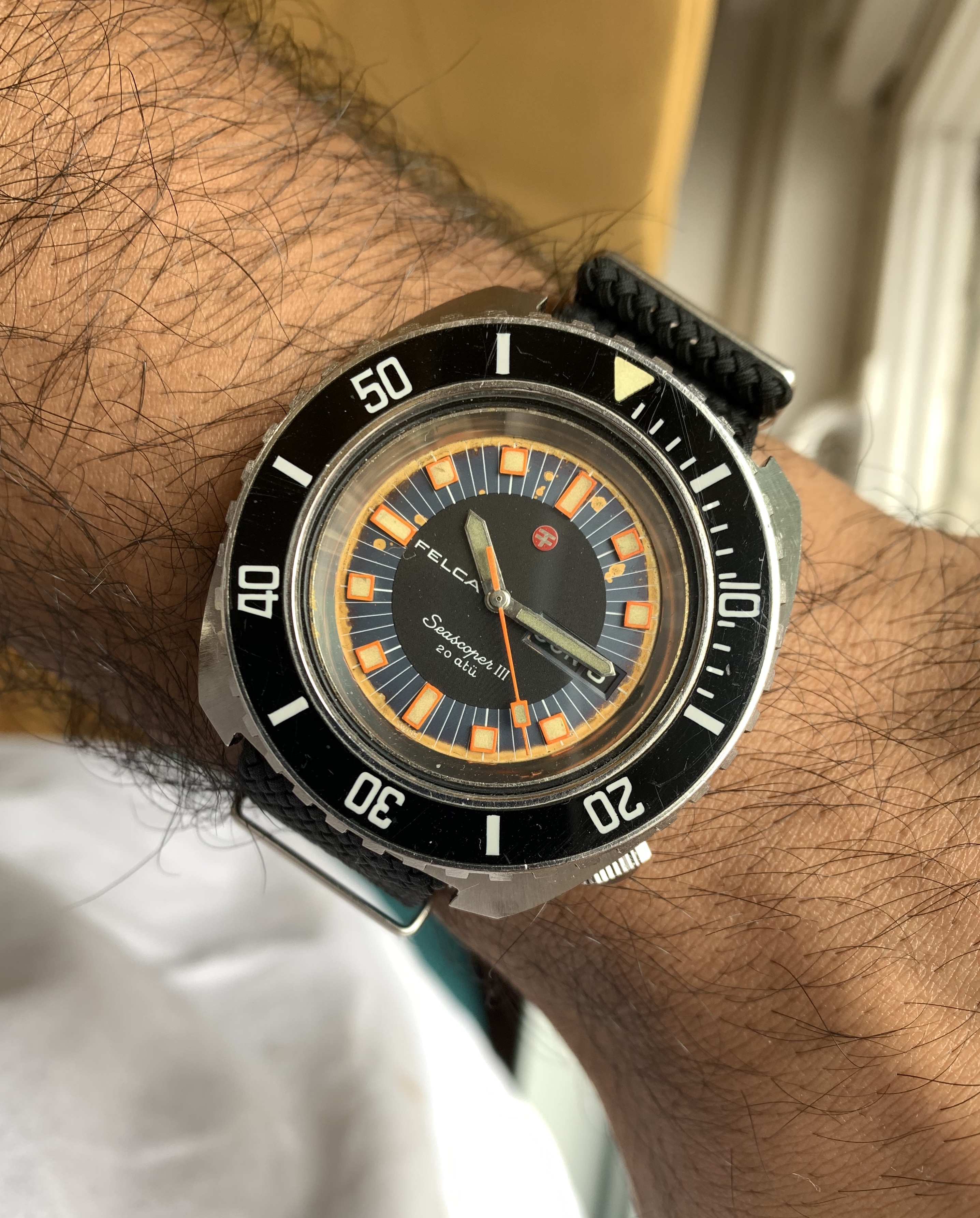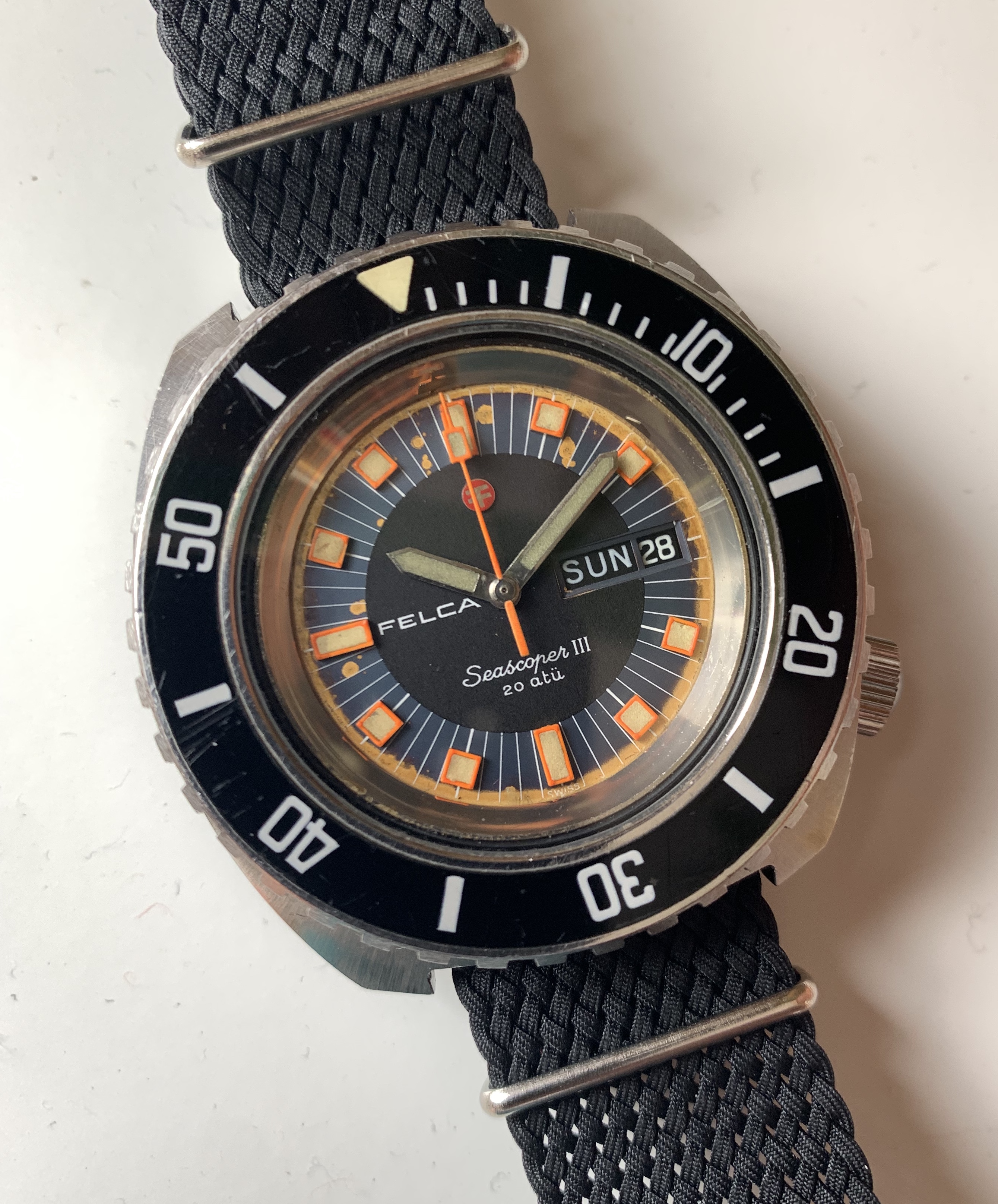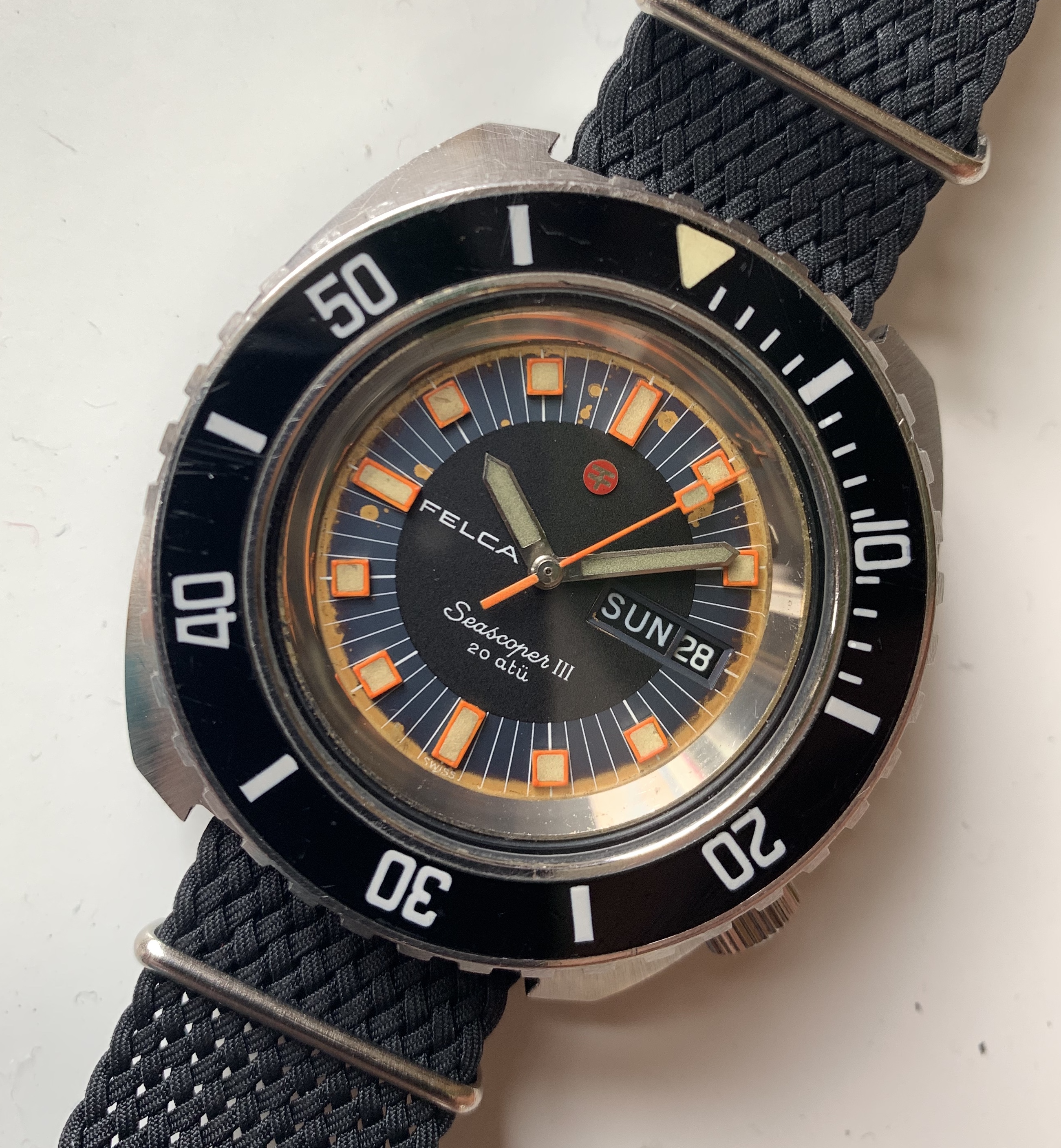 The dial has characteristics of aging consistent with other Felca Seascoper dials (see images below); notice the orange on the edge of the dial (as well in the grey ring). You don't really notice it when wearing (kind of goes with the watch, to be honest...)