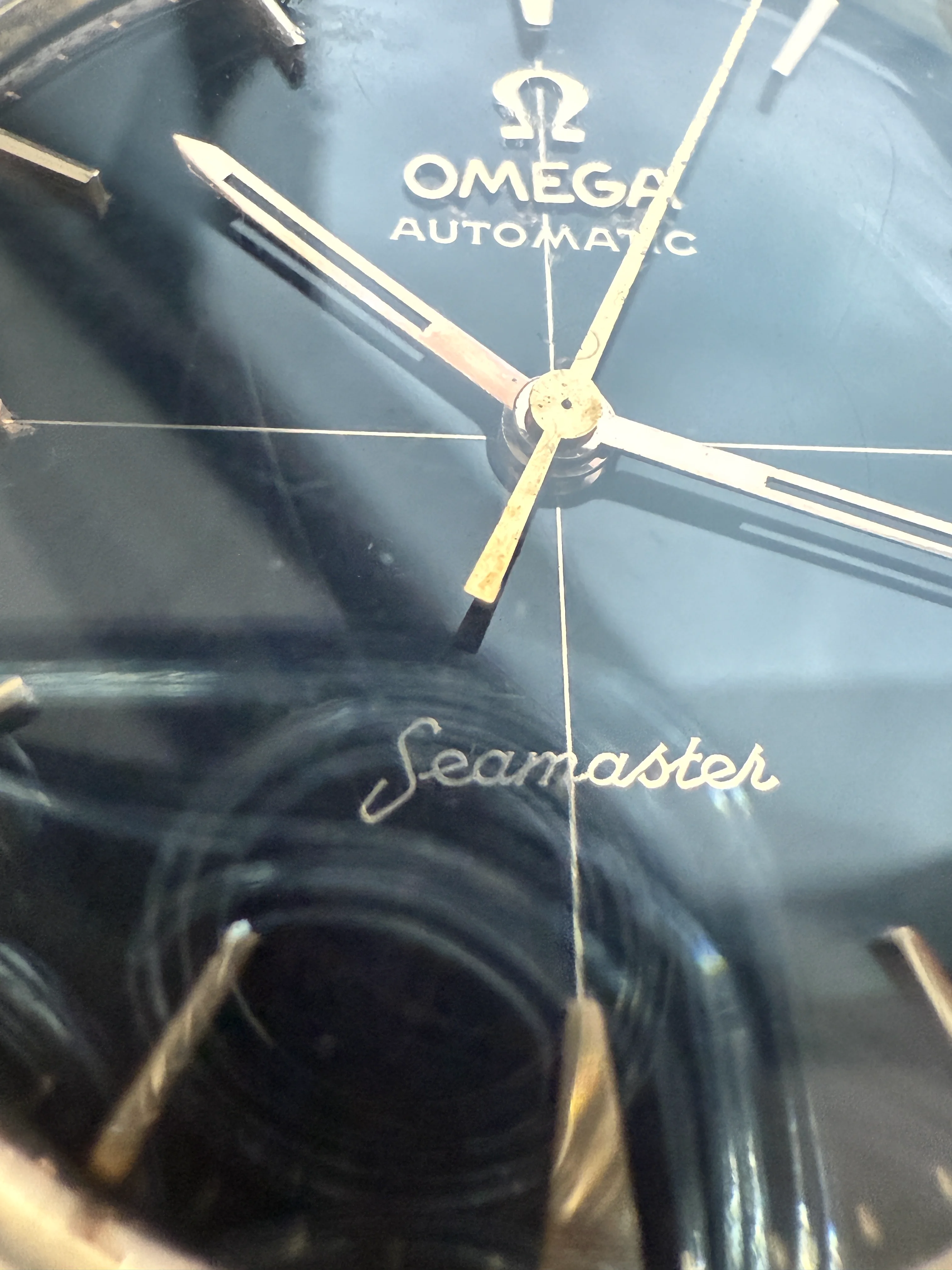 - Dial: Original black lacquer cross hair dial; gold tone hands and hour markers; all lume on hands and hour markers are lost; no date; pencil hands; prints, hands and hour markers are all good; some signs of age aroud the applied logo and hour markers, which is typical to black lacquer dial.