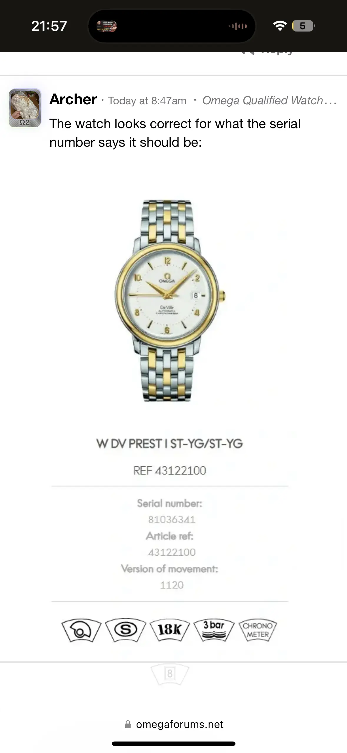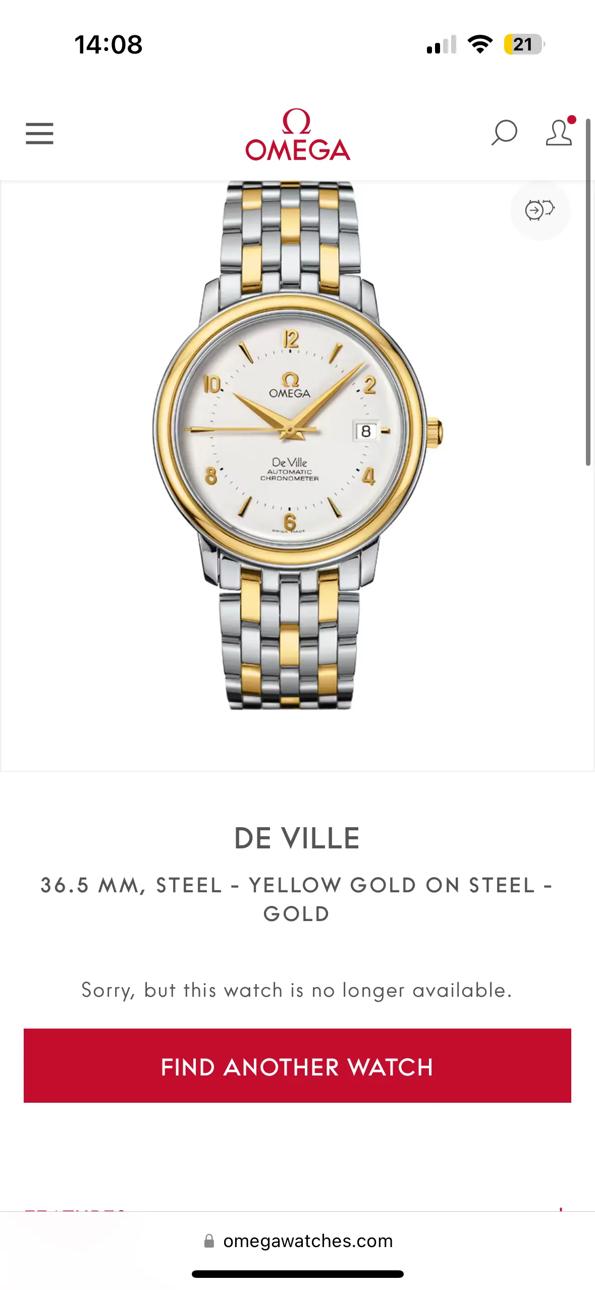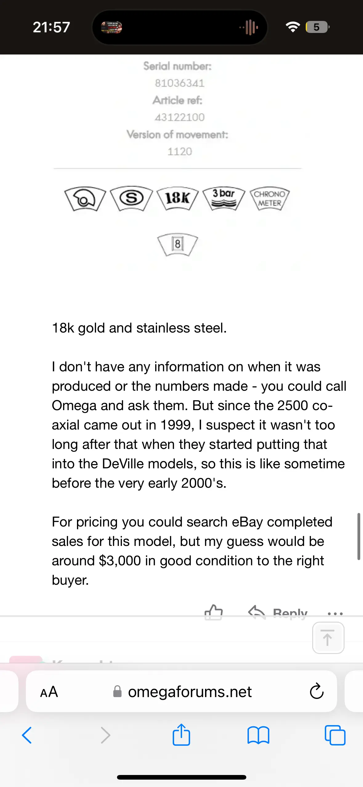 ·Hello I have difficulty times finding anything about this watch Omega 18k Yellow Gold Stainless Steel De Ville Prestige Ref: 4312.21.00 Men's Wristwatch 36.5 mm. All I found was out of stock in marketplaces long time ago. But never saw anything like this selling online or history for sells. Found site that looks not much promising and it’s Chinese or Japanese language site, and no pciture just screenshot from page and it’s 3.5 k + abroad stuffs that’s puts about 5.5 k in total.