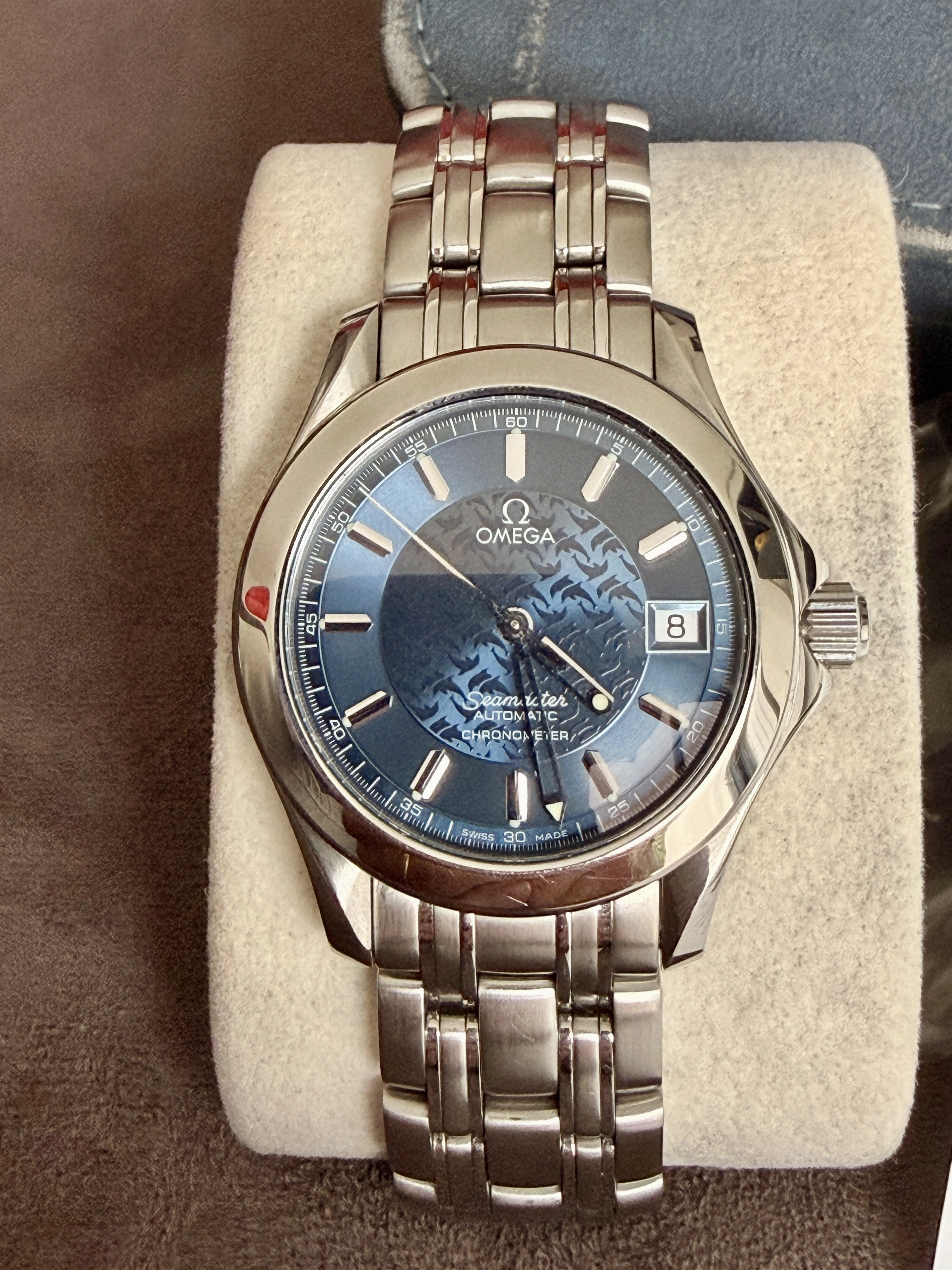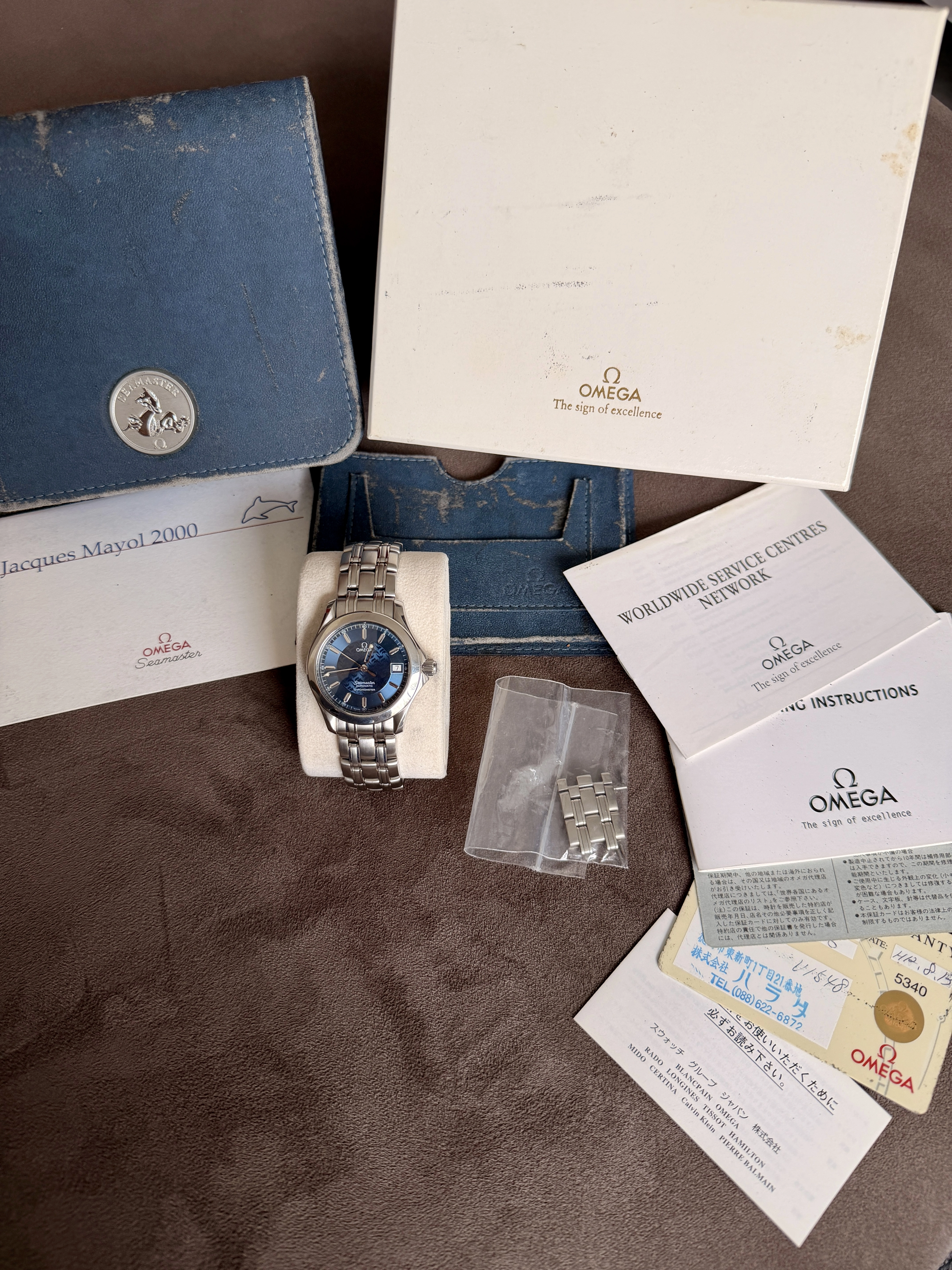Full set: box, outer box, Japanese warranty, exclusive Jacques Mayol card, and all Omega booklets.