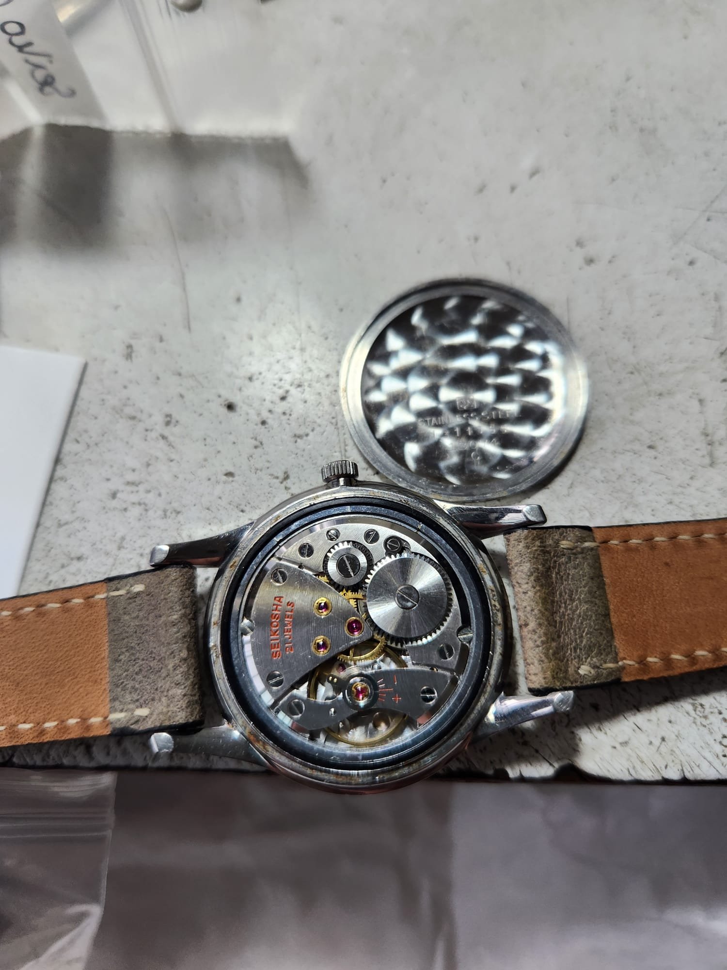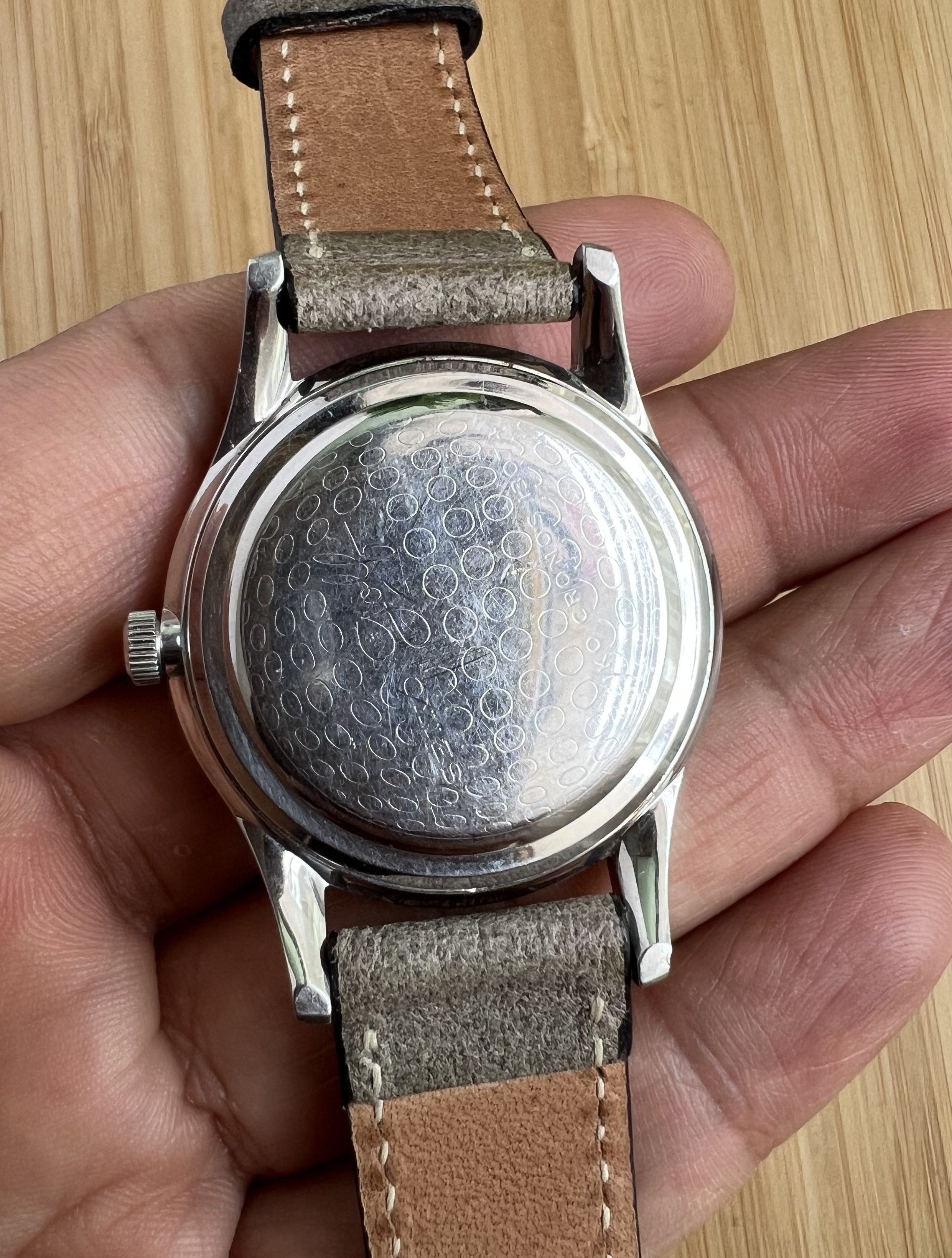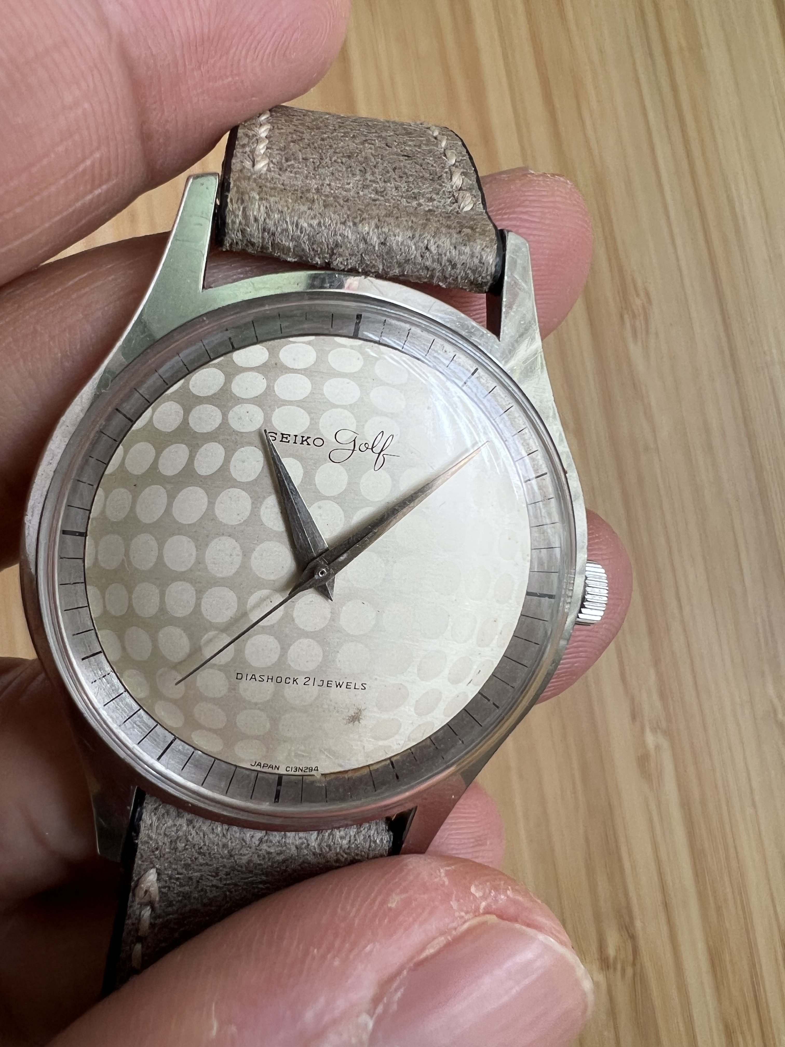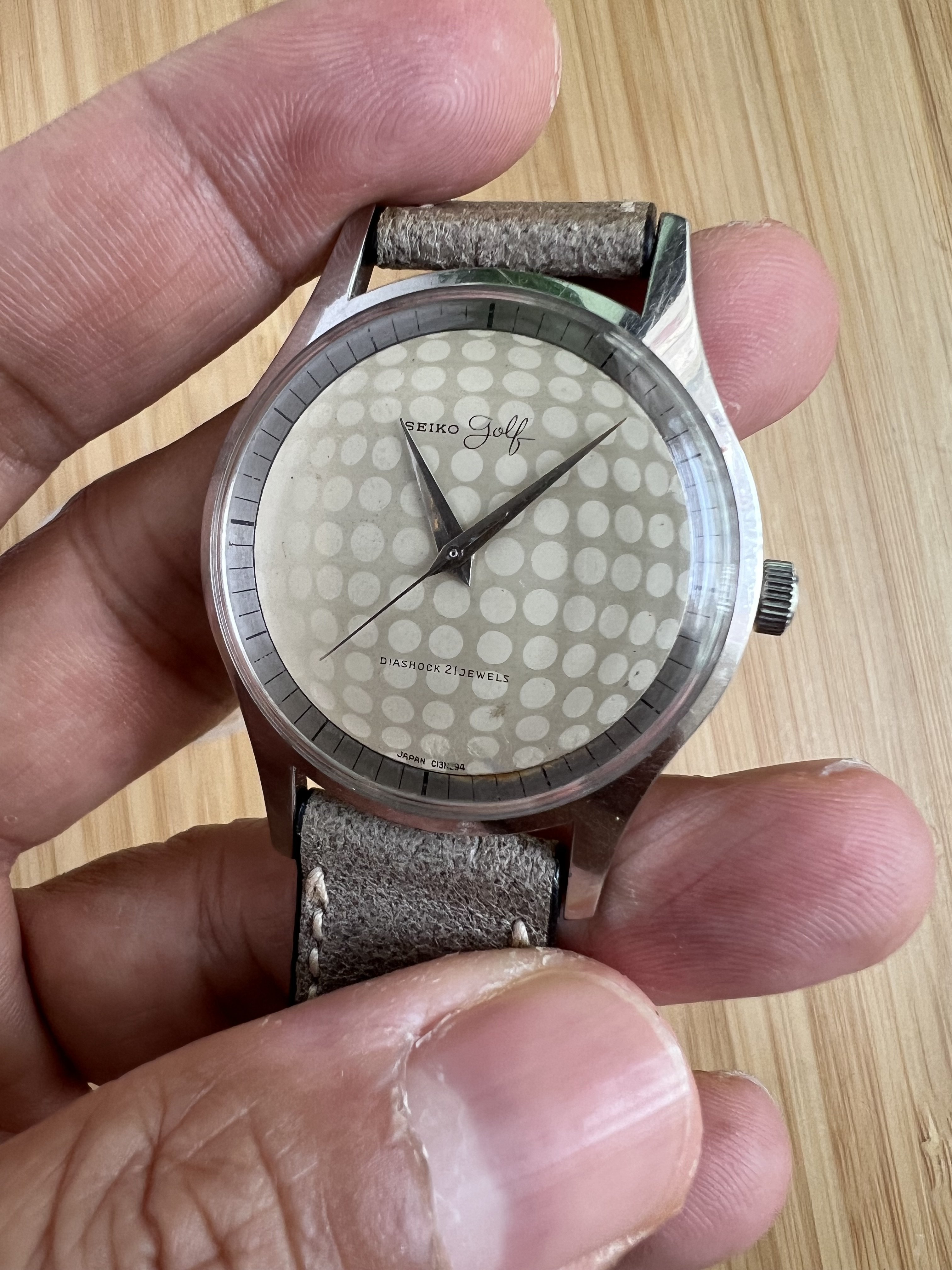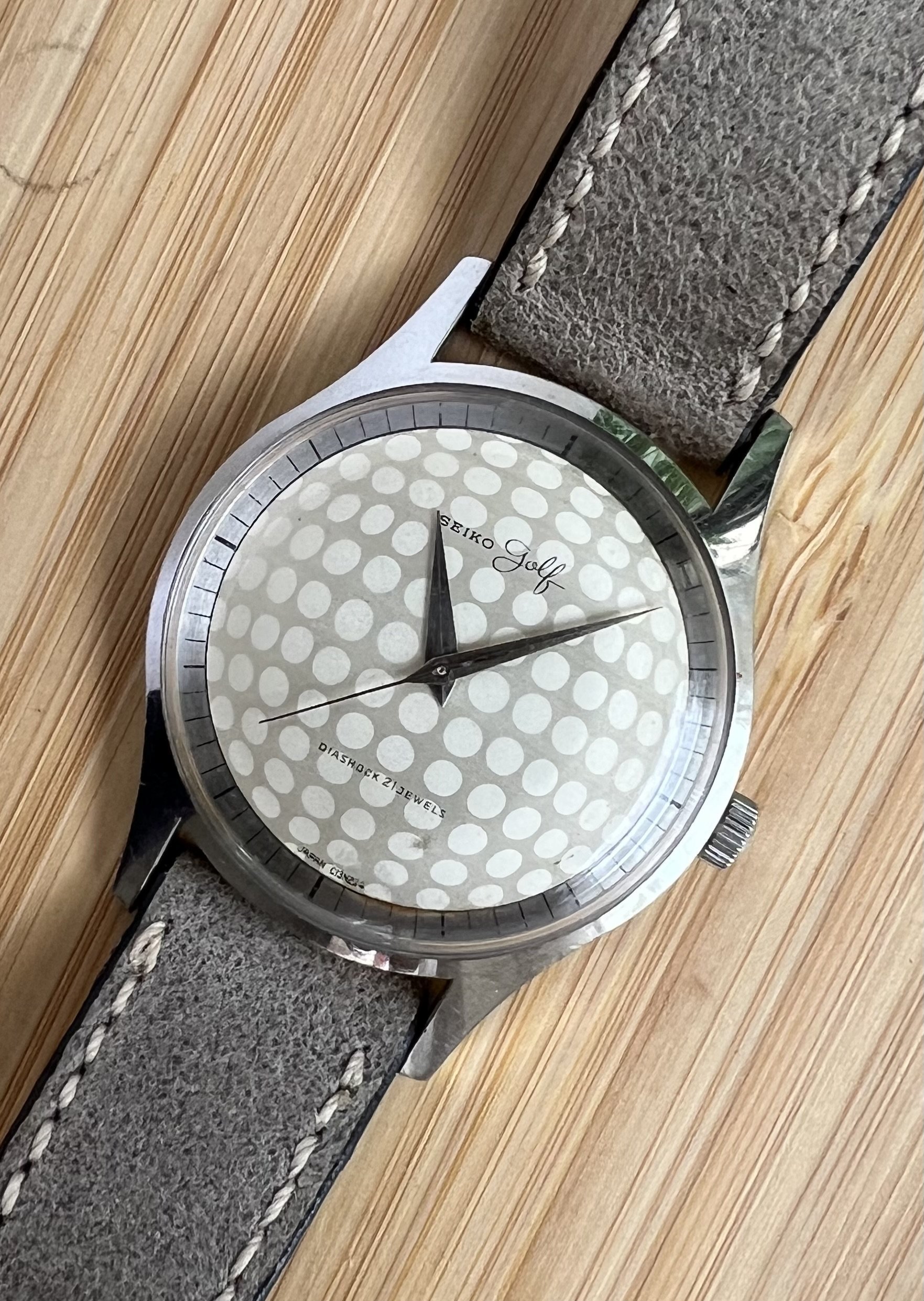 It features a golf ball face on both dial and on the case back and is powered by the Manual winding 21J Diashock movement. Case is sharp and IMO is unpolished. It measures approx 35-36mm but wears larger due to the long lugs. Watch was recently serviced and is keeping time. A complete mint set was recently offered and sold by the tokie club for $2800.