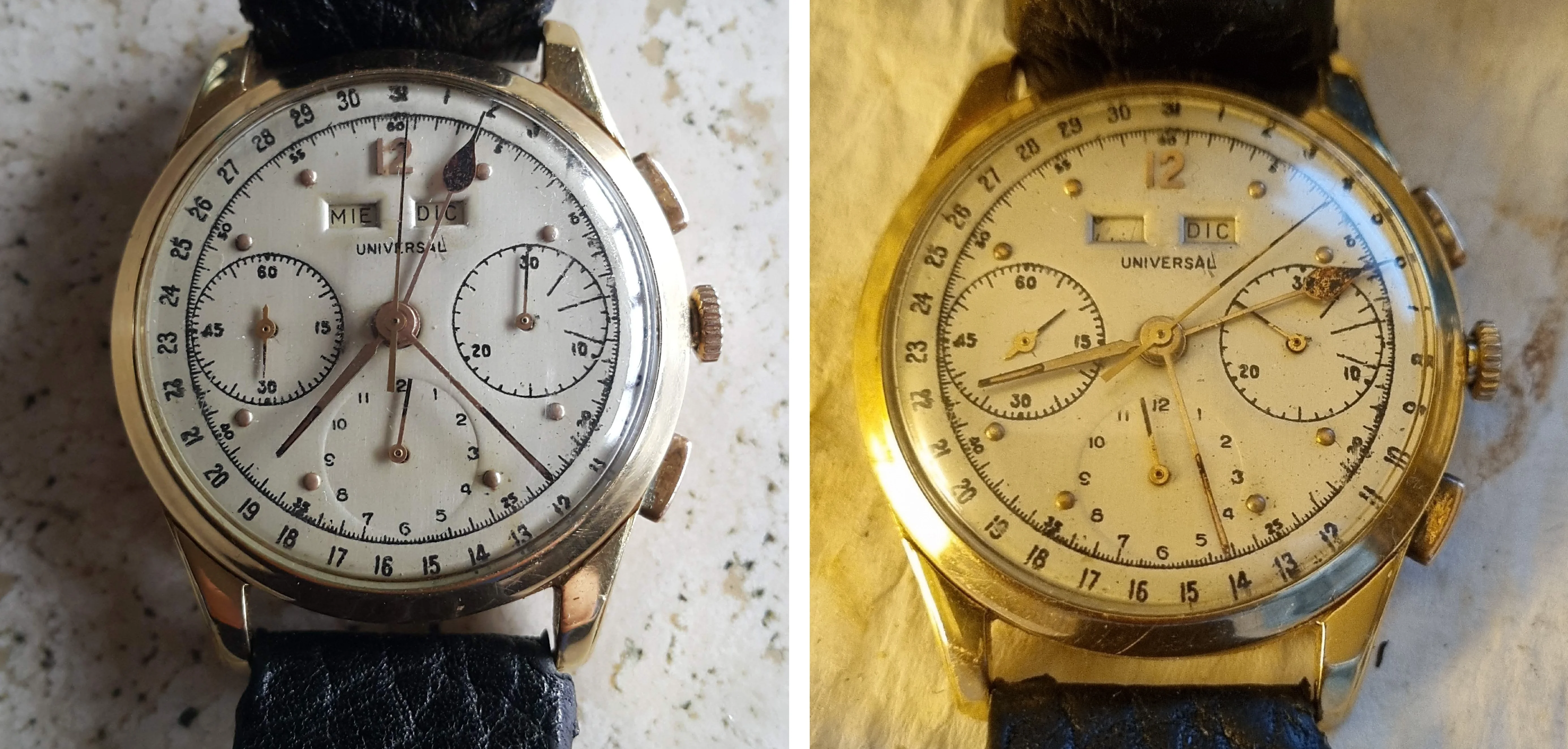I am seeking historical information on a very early Universal Genève Triple Calendar Chronograph that has a peculiar mix of components. I am trying to determine if this is a documented factory assembly or a later repair/frankenwatch.