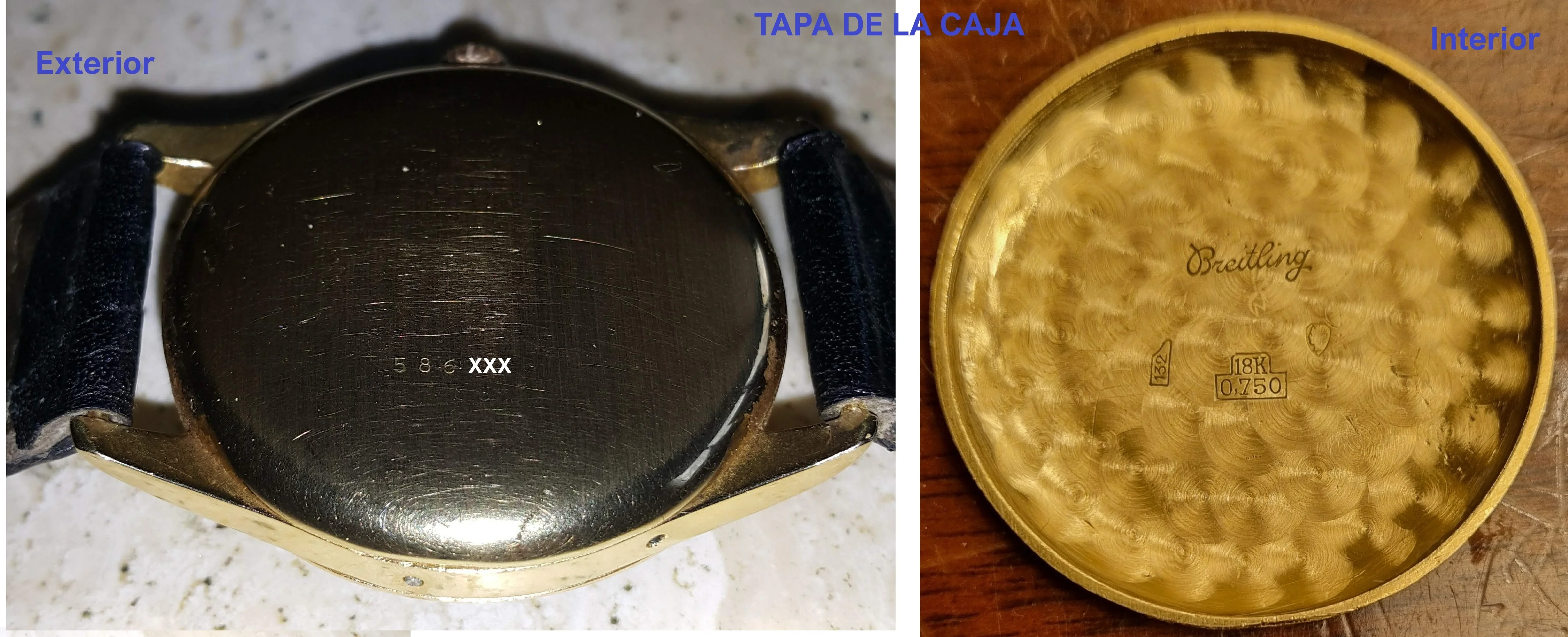 - Caseback Interior: The inner caseback is stamped and clearly signed "Breitling". It also bears a second number: 132.