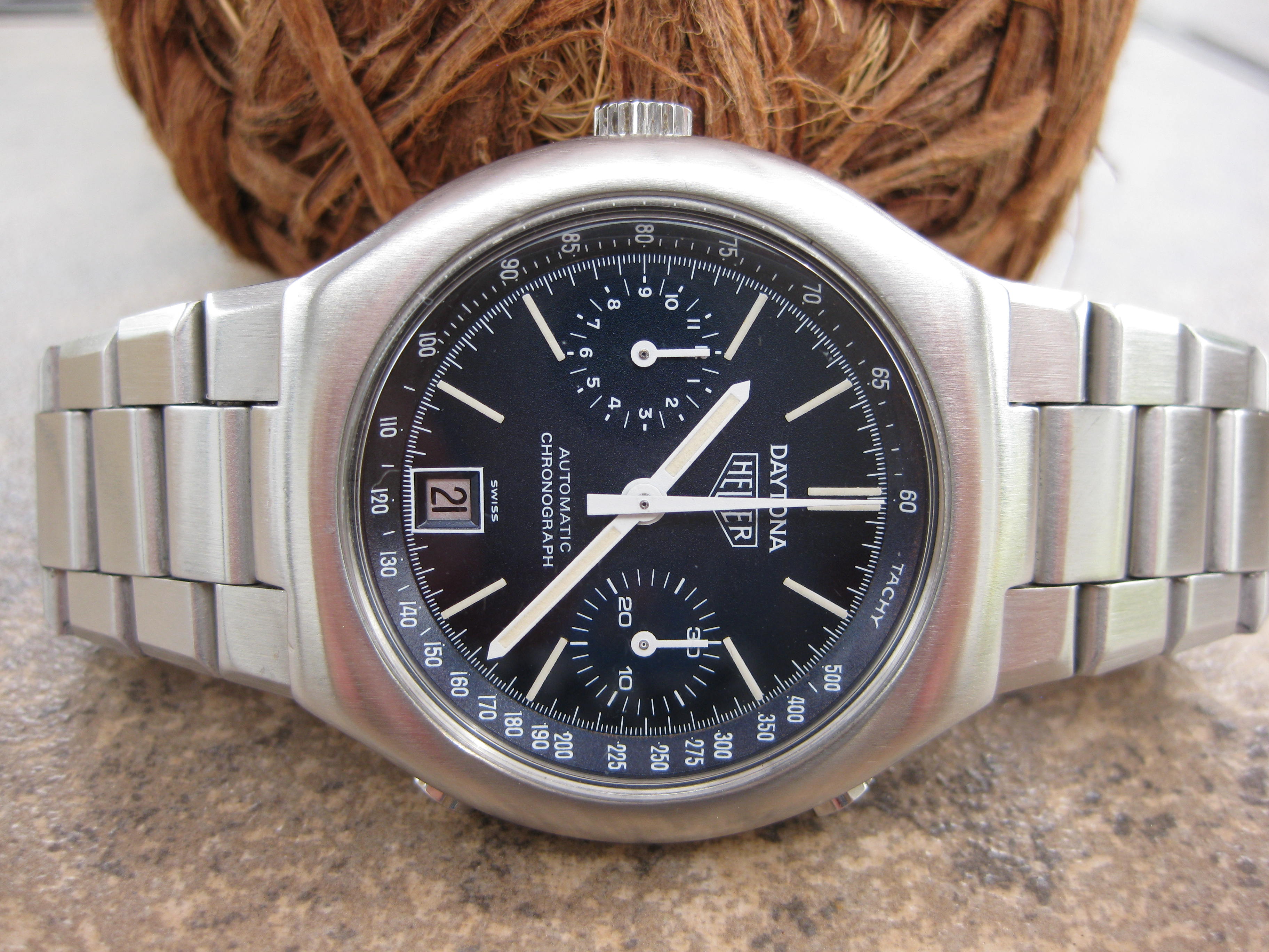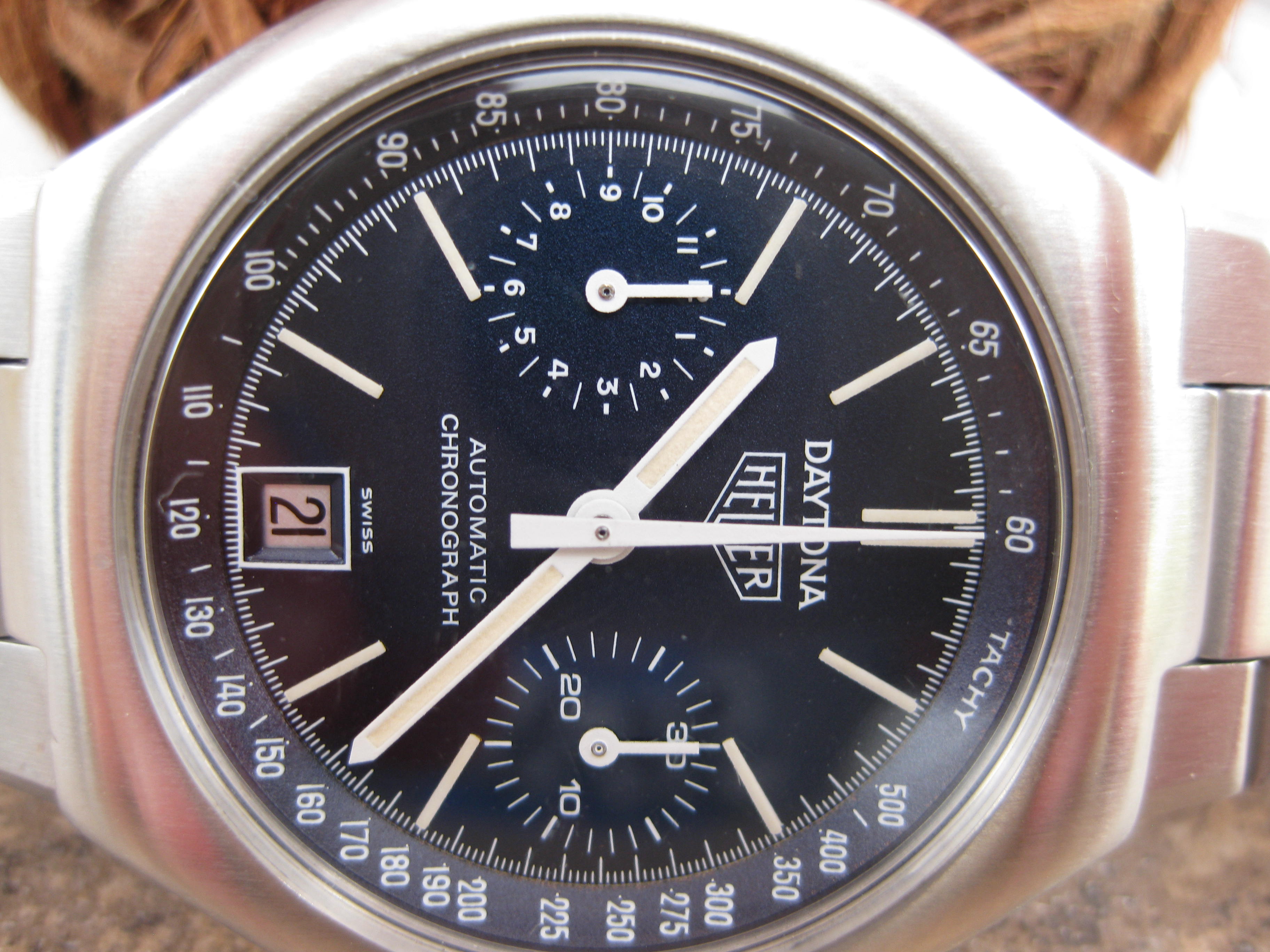 ·For sale is my absolutely stunning Vintage Heuer Daytona Chronograph. The watch is in absolutely beautiful condition, and functions flawlessly. This model was produced in the 1970's, and runs on a automatic self winding movement. Original dial and case are in excellent condition. Original band has very little stretch and fits appox. a 7 1/2 wrist. Great example of a Heuer Daytona Chronograph, and the price is the best around.