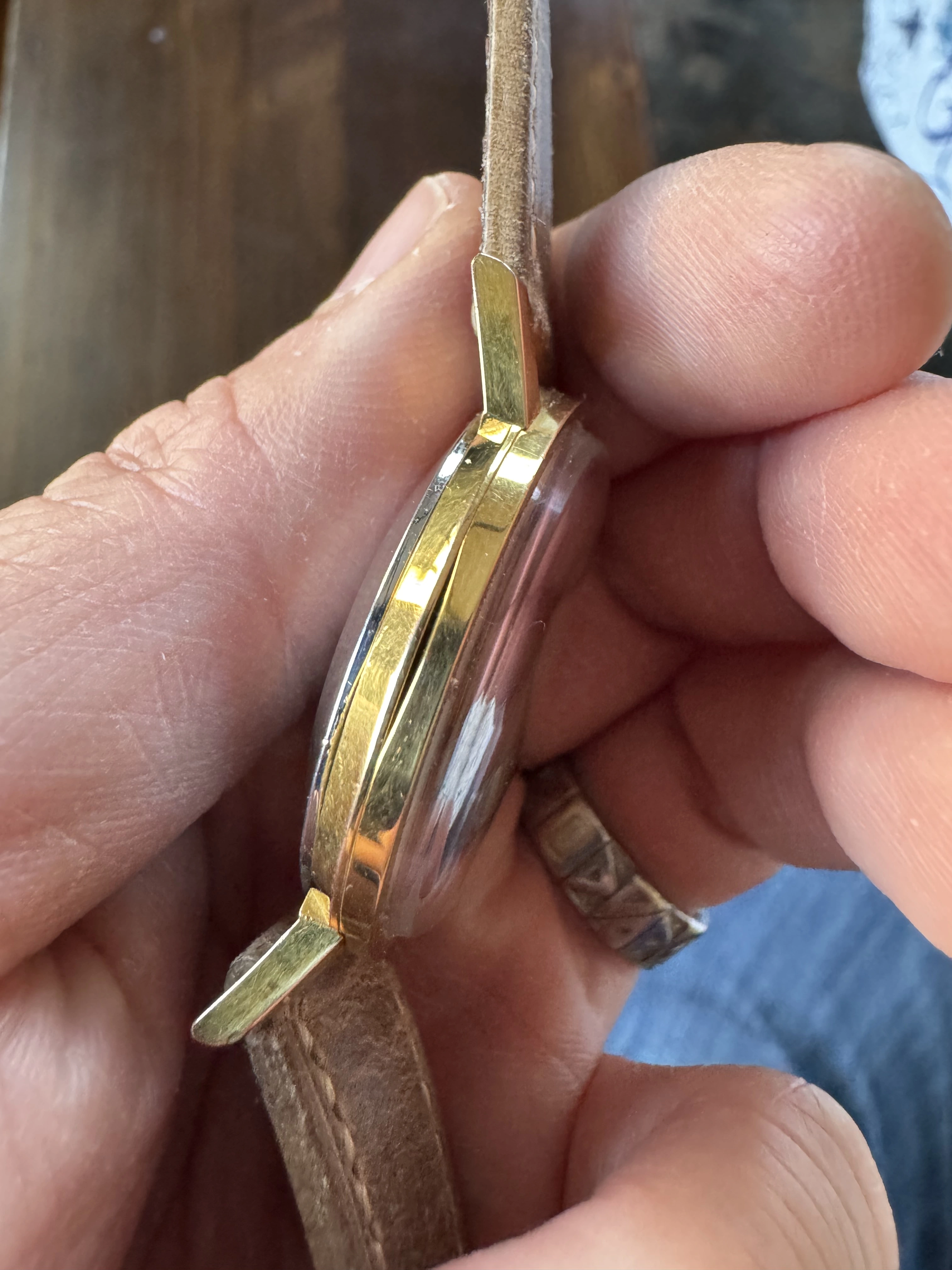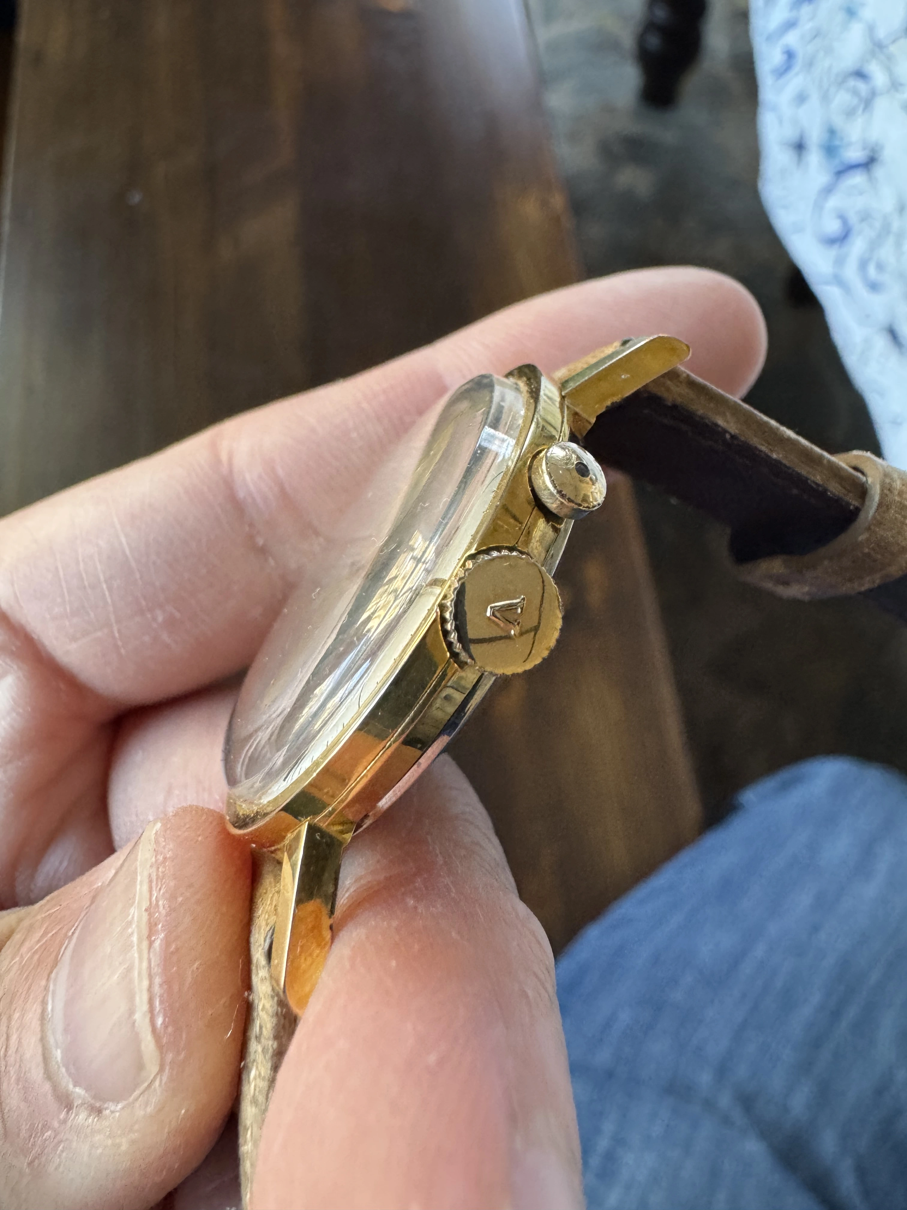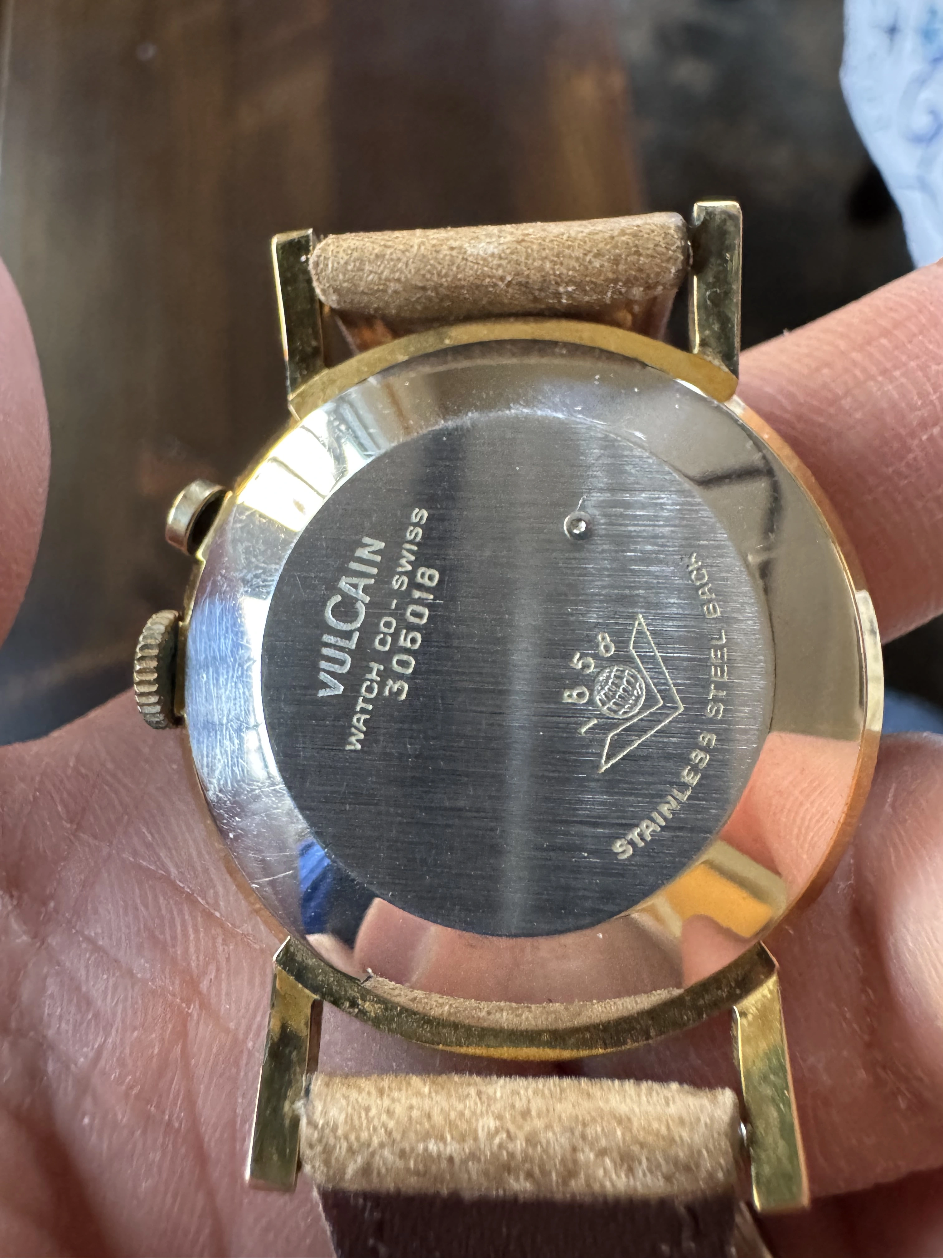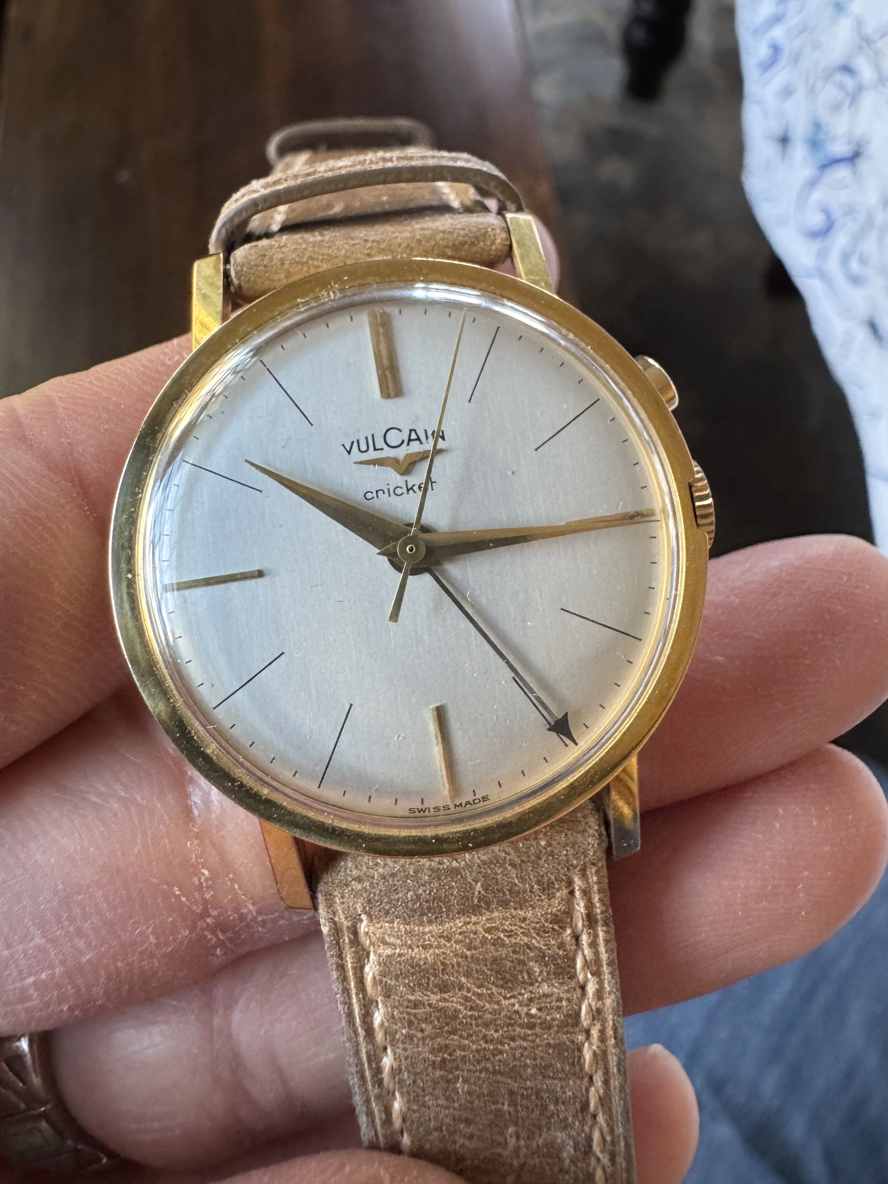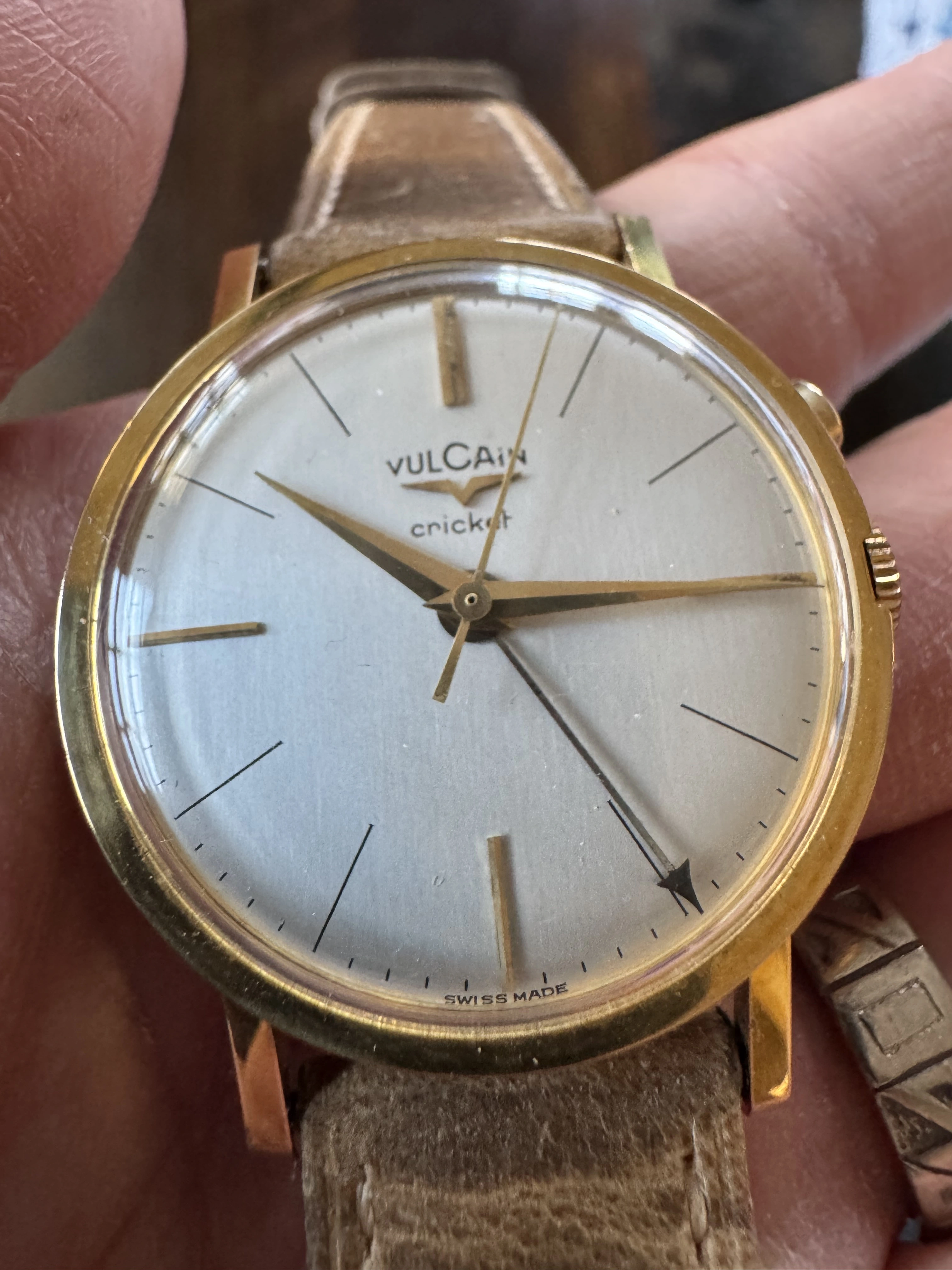 ·This is a rare Vulcain Cricket. It’s the large size 35 mm with the hidden button. It’s a beautiful dress watch with a clean and elegant design. Gold plated with stainless steel back. All functions including alarm are working, has not been tested for accuracy but I haven’t noticed any major issues while wearing it. Most vintage vulcain crickets are 34 mm but this one is larger and wears larger due to the large dial relative to the bezel and the length of the lugs.