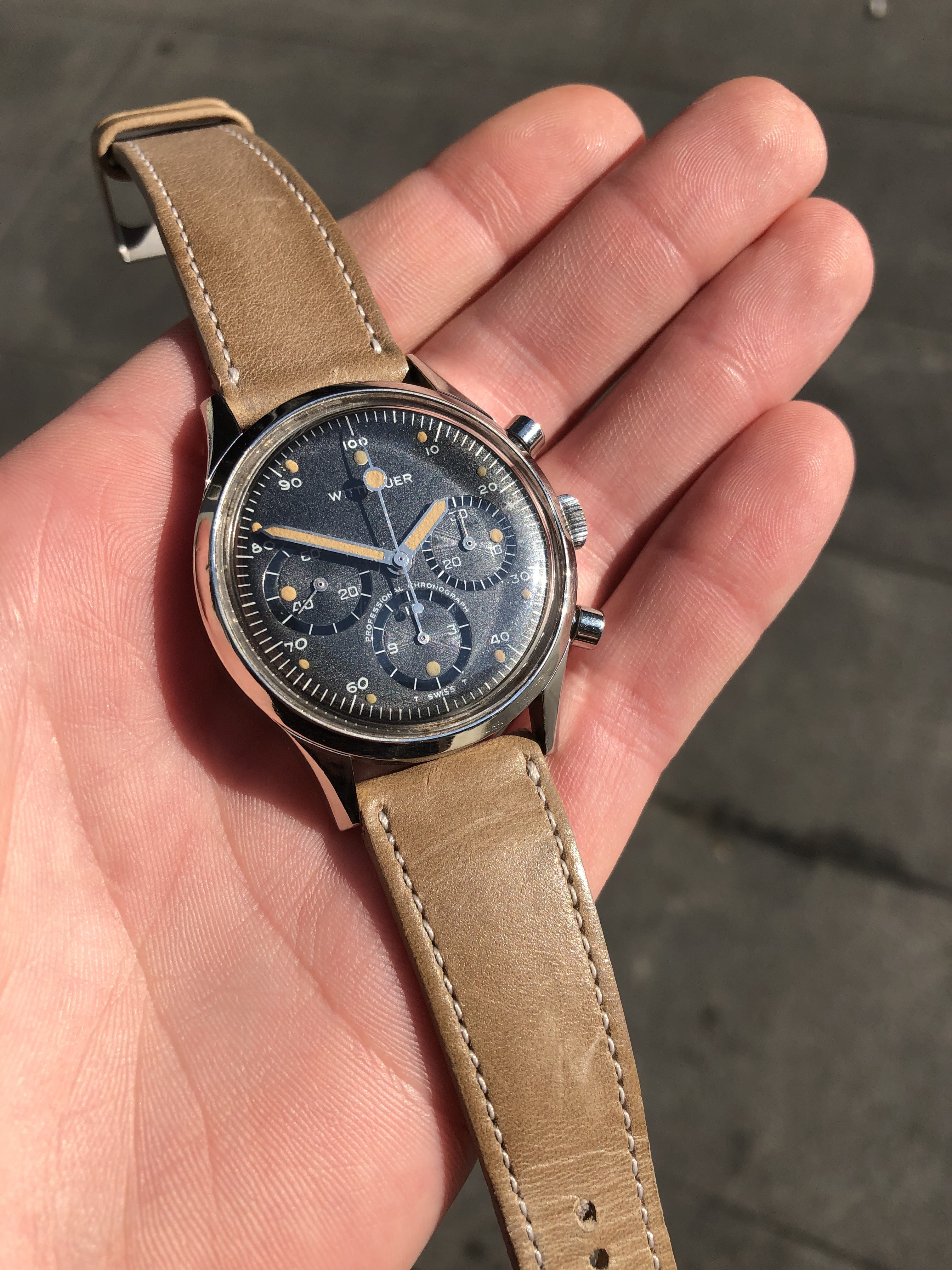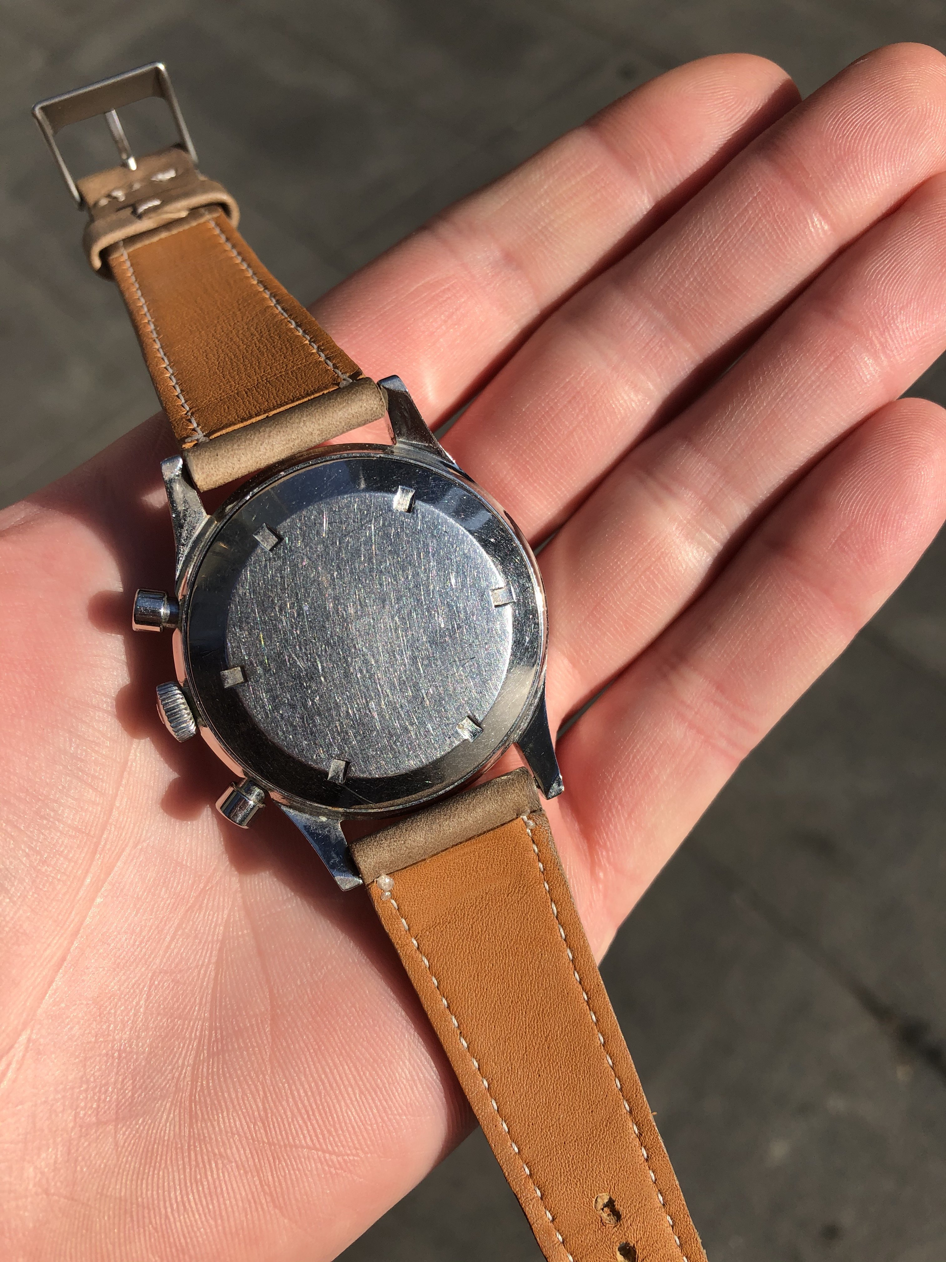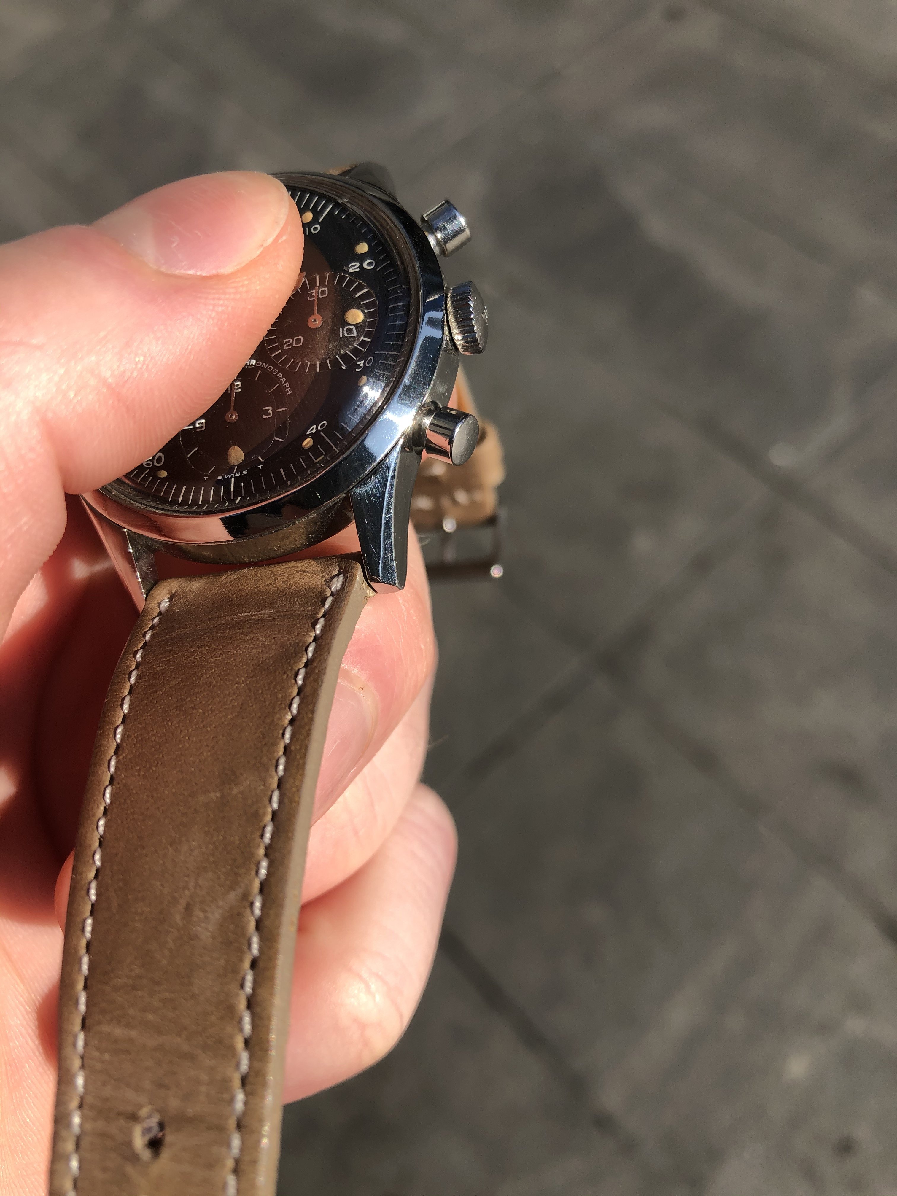 Movement: Powered by the famous Valjoux 72. The watch was regulated in my possession, but prior service history is not known. It is running and keeping good time presently, and the chrono is functioning as expected.
