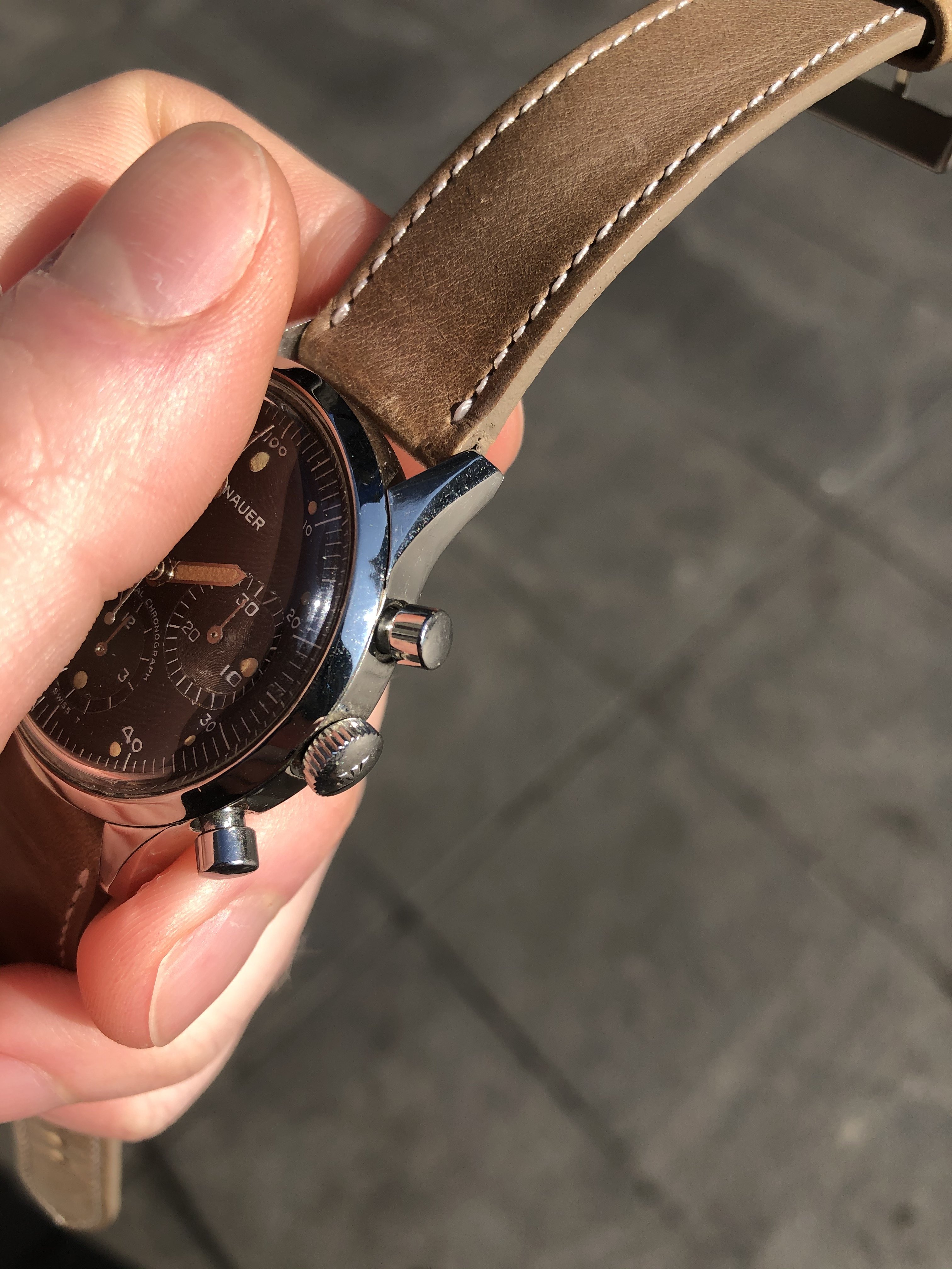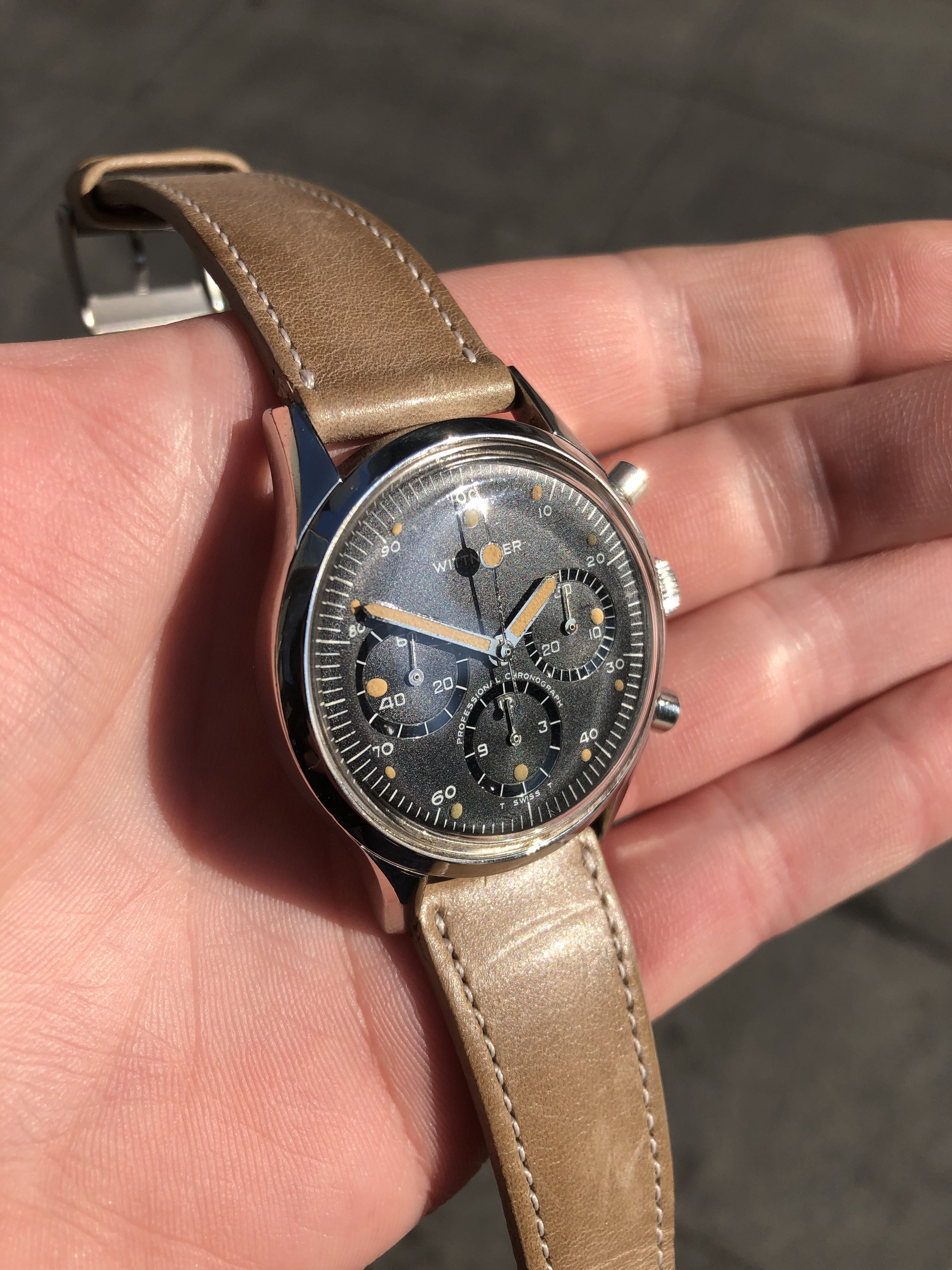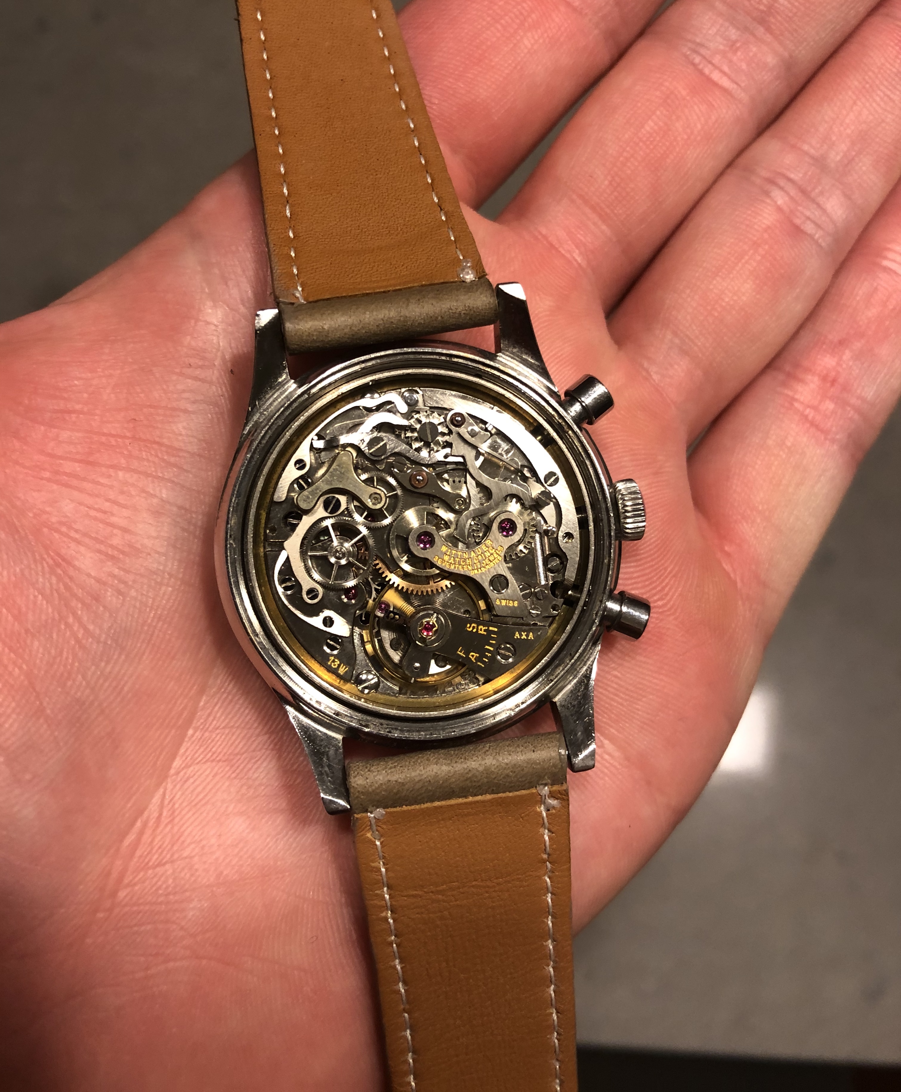 Movement: Powered by the famous Valjoux 72. The watch was regulated in my possession, but prior service history is not known. It is running and keeping good time presently, and the chrono is functioning as expected.