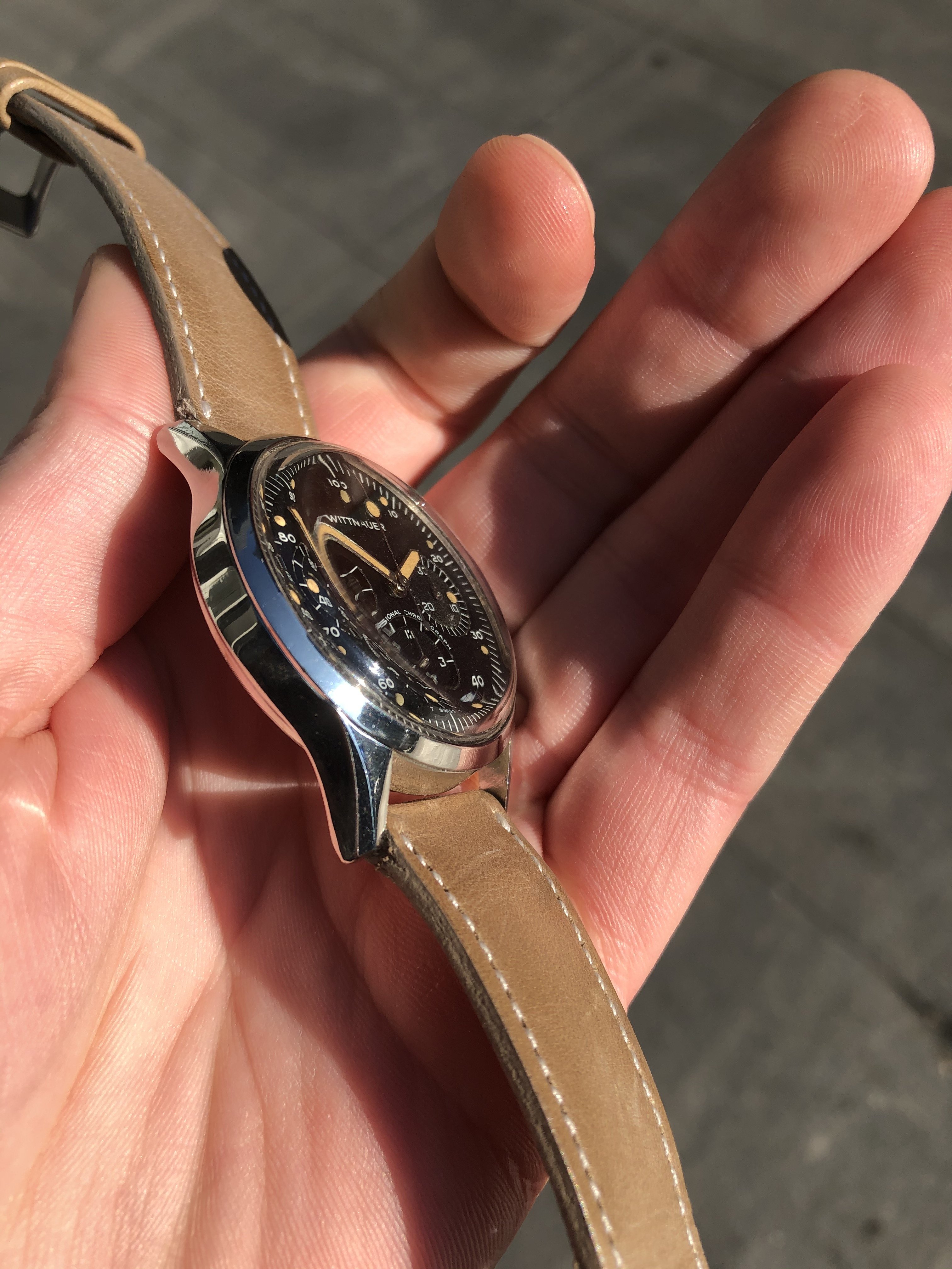 Dial/Hands: Excellent condition, with only a small spot of wear in the 6 o'clock position of the minute subdial. Awesome, warm patina to the lume dots (all of which are intact) and hands. Lume glows under UV but falls off rapidly (no residual glow).