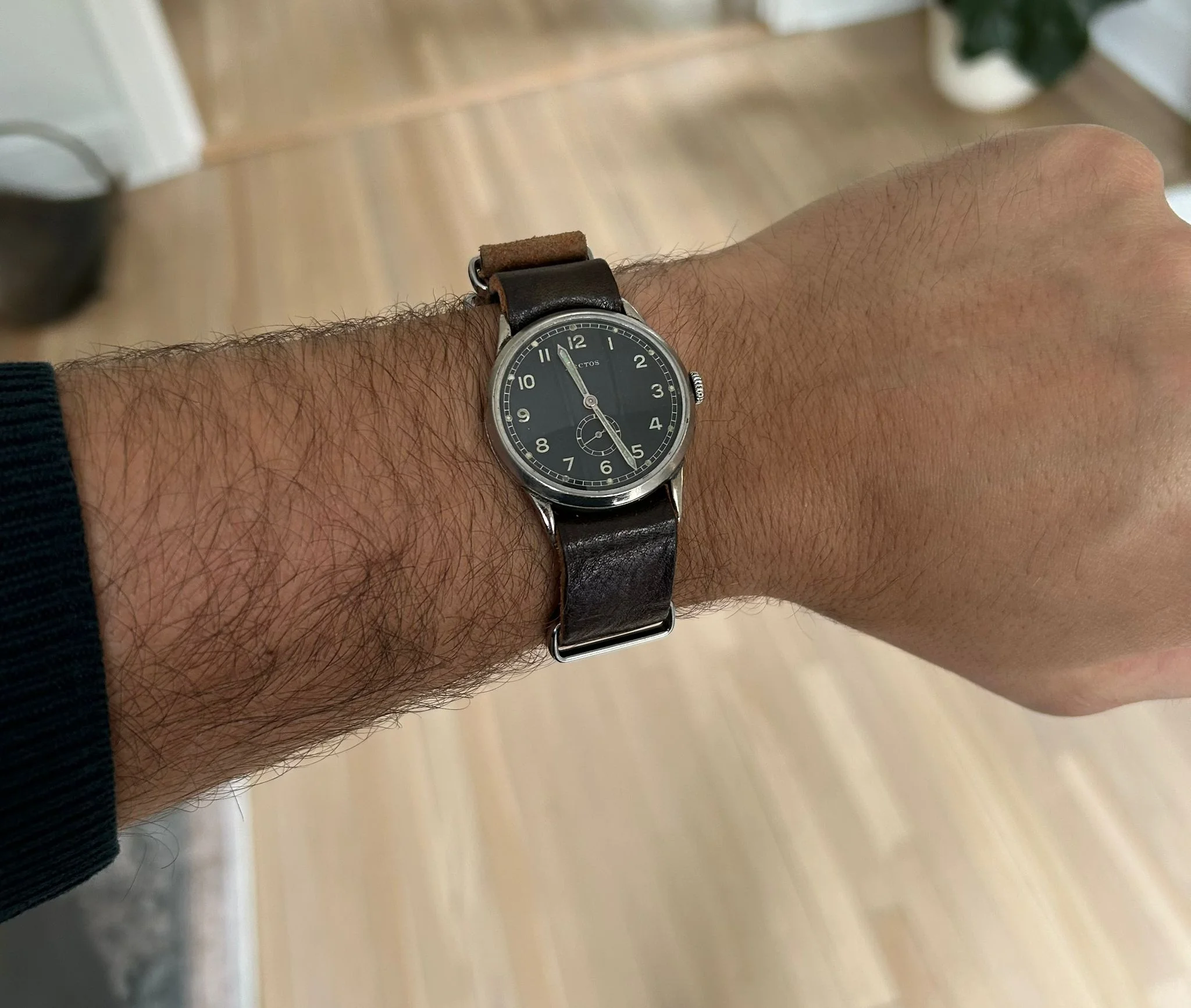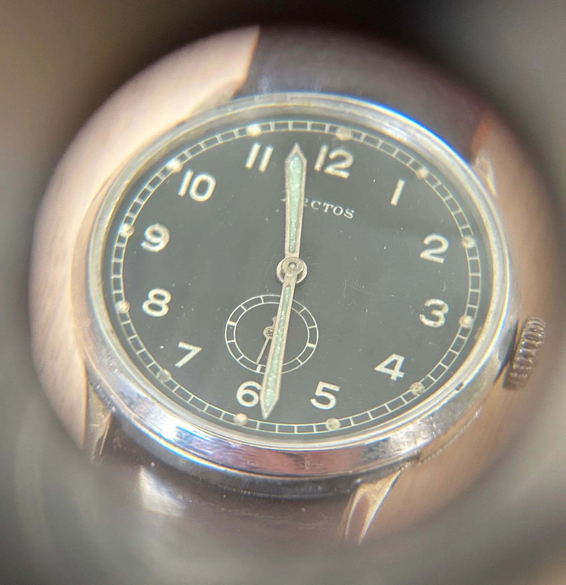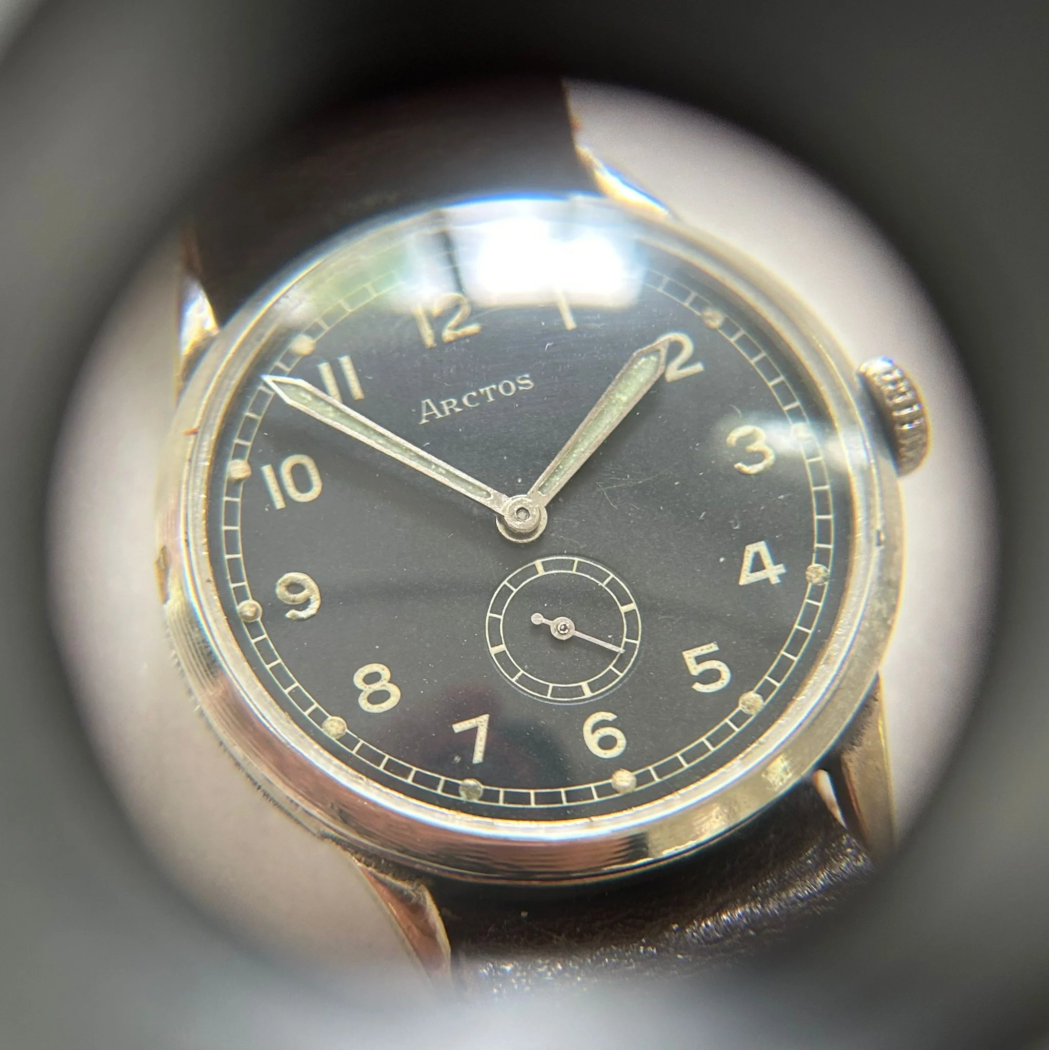 The movement inside is a UROFA (Uhren-Rohwerke-Fabrik Glashütte) Caliber 58, a correct and period-appropriate caliber for Luftwaffe-issued Arctos watches. That said, this particular movement is possibly a wartime or immediate post-war replacement—entirely plausible and common in issued military watches that saw field service and depot-level maintenance.