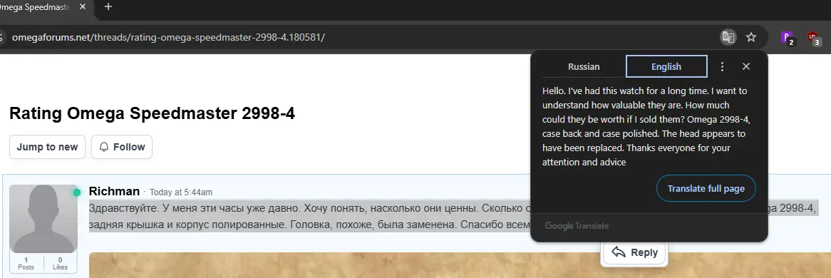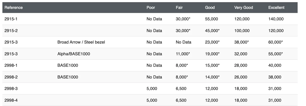 As to the watch itself; it looks well-worn, but honest. Apart from the crown, which is later, it appears largely original. Somewhere between 'Fair' and 'Good' would be my quick assessment, which makes the values listed above interpretable. Bear in mind that the values do not include the bracelet and no. 6 end links which are worth a fair bit on their own. Certainly not bad to own something like this!
