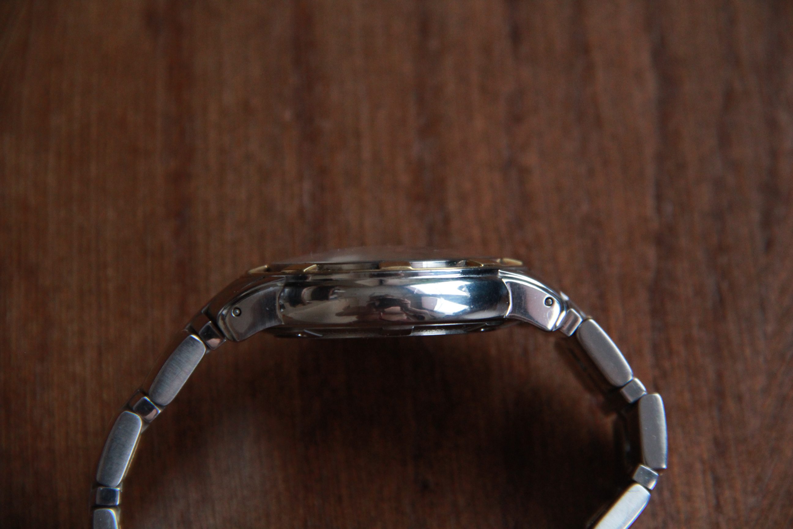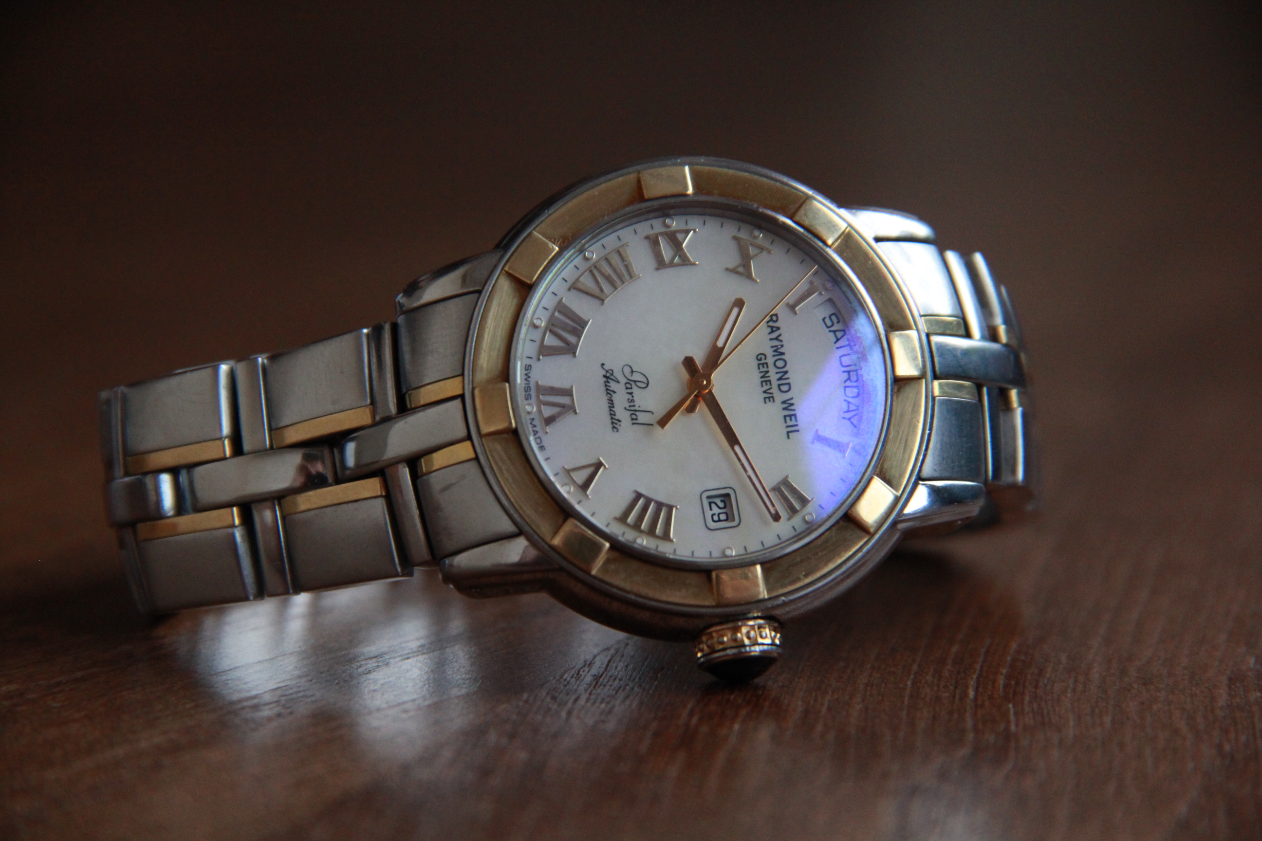 ·Raymond weil 2844 PARSIFAL 2844-STG-00908 Case: steel with 18K yellow gold inserts. Case height: 11.15 mm. Case size: diameter 39.5 mm. Mechanism: automatic. Caliber height: 5.05 mm. Bracelet: steel with 18K yellow gold inserts. Clasp: The clasp of the bracelet with a double protection system. Dial: mother-of-pearl, Roman relief numerals. Date window: at 3 o'clock. Water resistance: 100 m, 330°F, 10 atm. Glass: sapphire. Crown crown: Decorated with blue sapphire. Case back cover: transparent, sapphire crystal, with screws. The service was at a local jeweler in 2021. Bracelet 19 cm. There are no documents and no box. Price 750 euros
