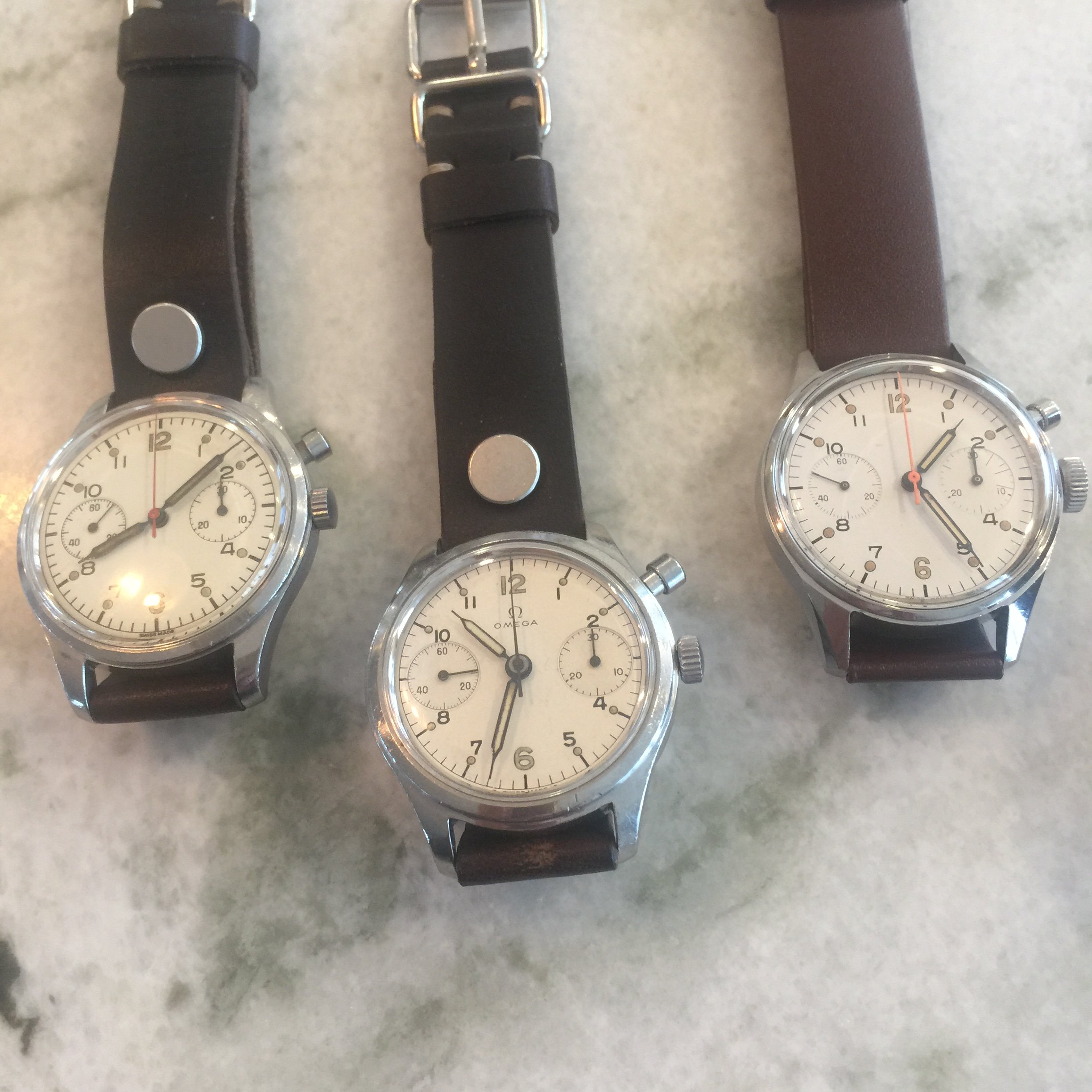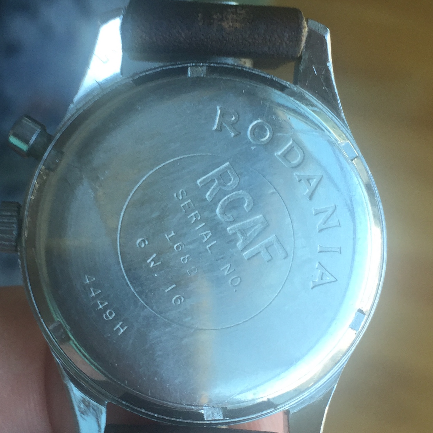 ·I have 3 of the RCAF single button chronographs, the Omega, Breitling and the Rodania. On the Omega and Rodania thre is a clear (lacquer?) coating around the lume for the hour markers and the 6&12. I heard the RCAF removed the radioactive markers and originally this is what I am seeing, a not very good relume. But if it was relumed why the clear coating?