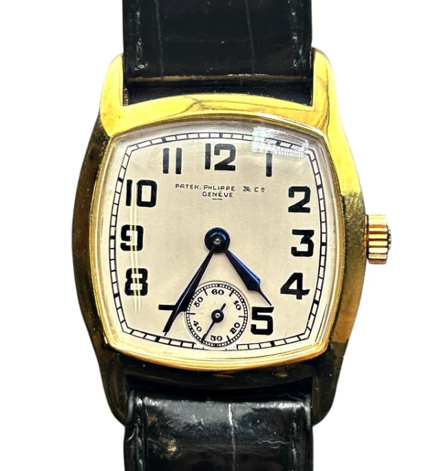 An extremely rare 1926 Patek Philippe 18k tonneau gents dress watch with 'mis-spelt' (original factory error) dial, 32mm case, cream gilt dial with subsidiary second dial, blue gun metal hands and Arabic numerals, signed 'PATEK PHLIPPE & CO', movement no 810483, case no 290595, Patek leather strap, on 18ct gold Patek Philippe pin buckle, in perfect working order. This is an extremely rare watch, it comes with Sotheby's horology catalogue of 17th December 2002. Also a letter of provenance from Alexander Barter who was the head authenticator for watches worldwide at Sotheby's at the time of sale. With Patek Philippe box and Archive Papers.