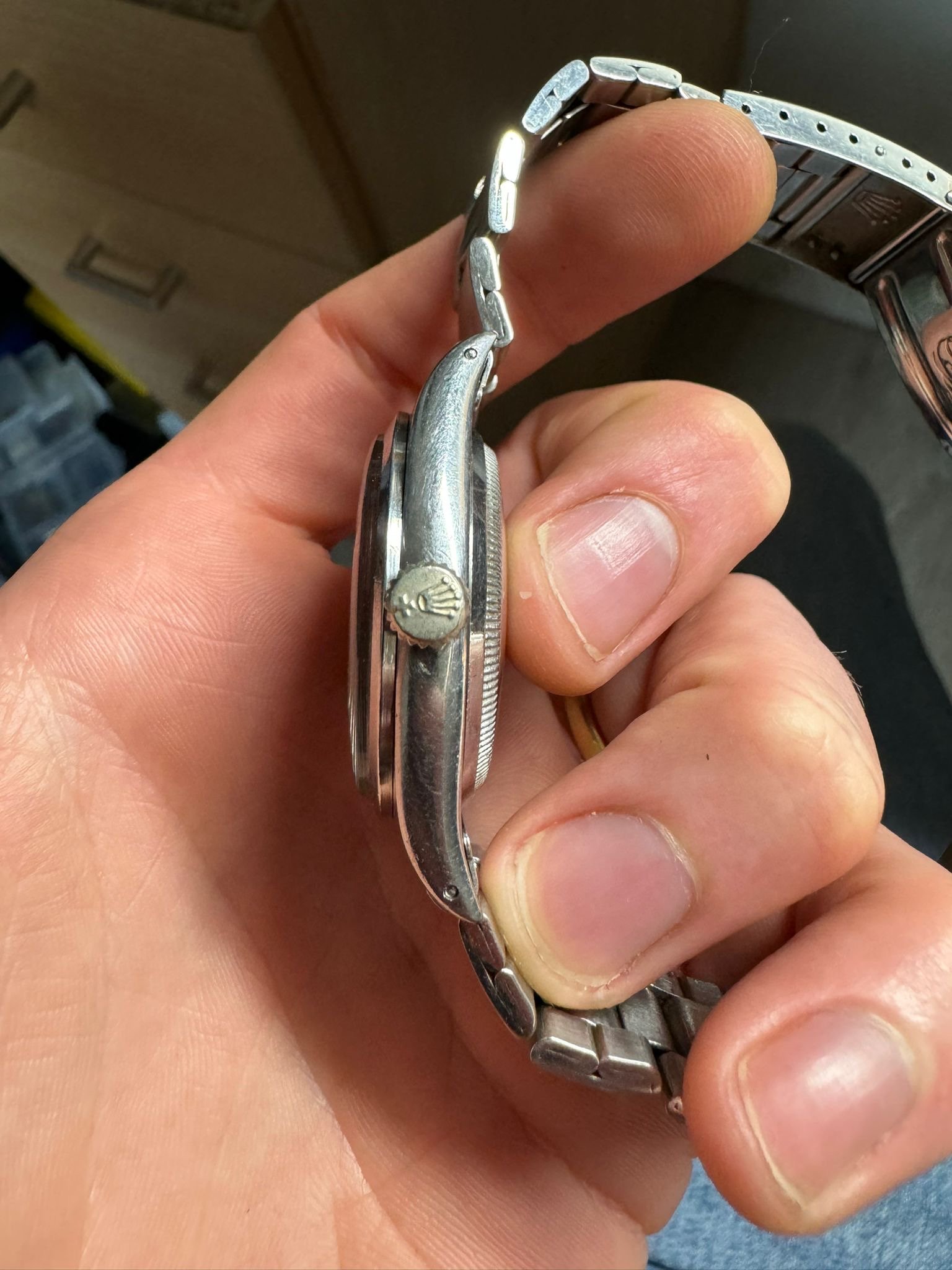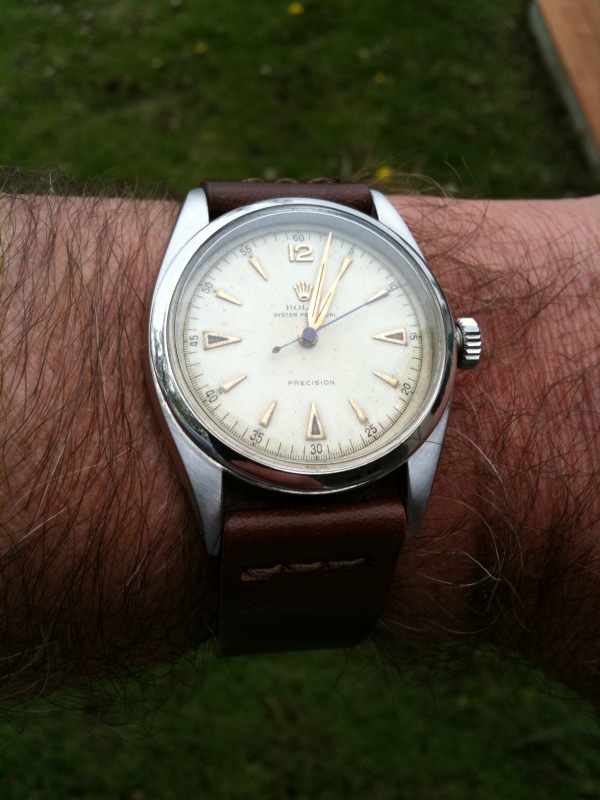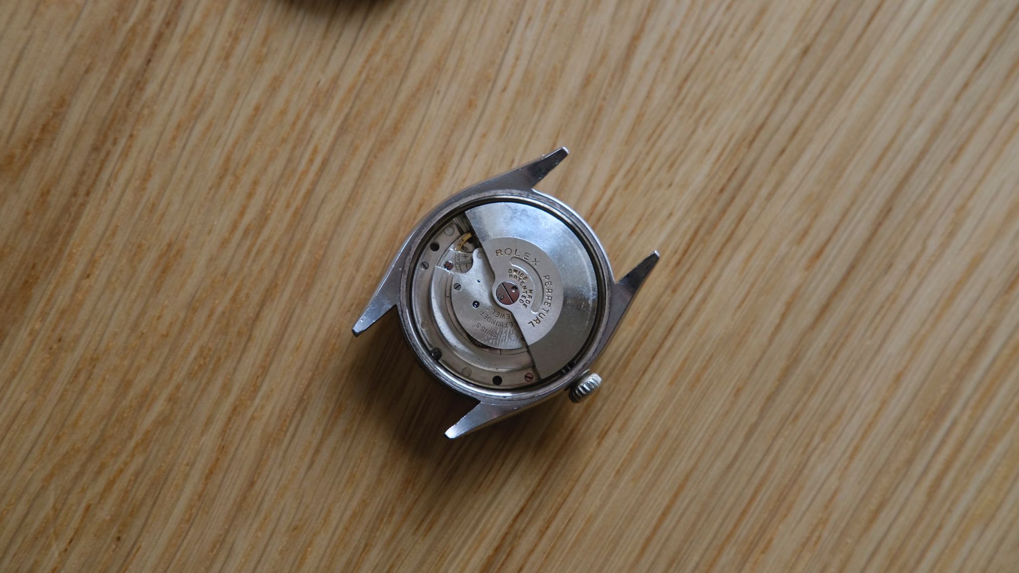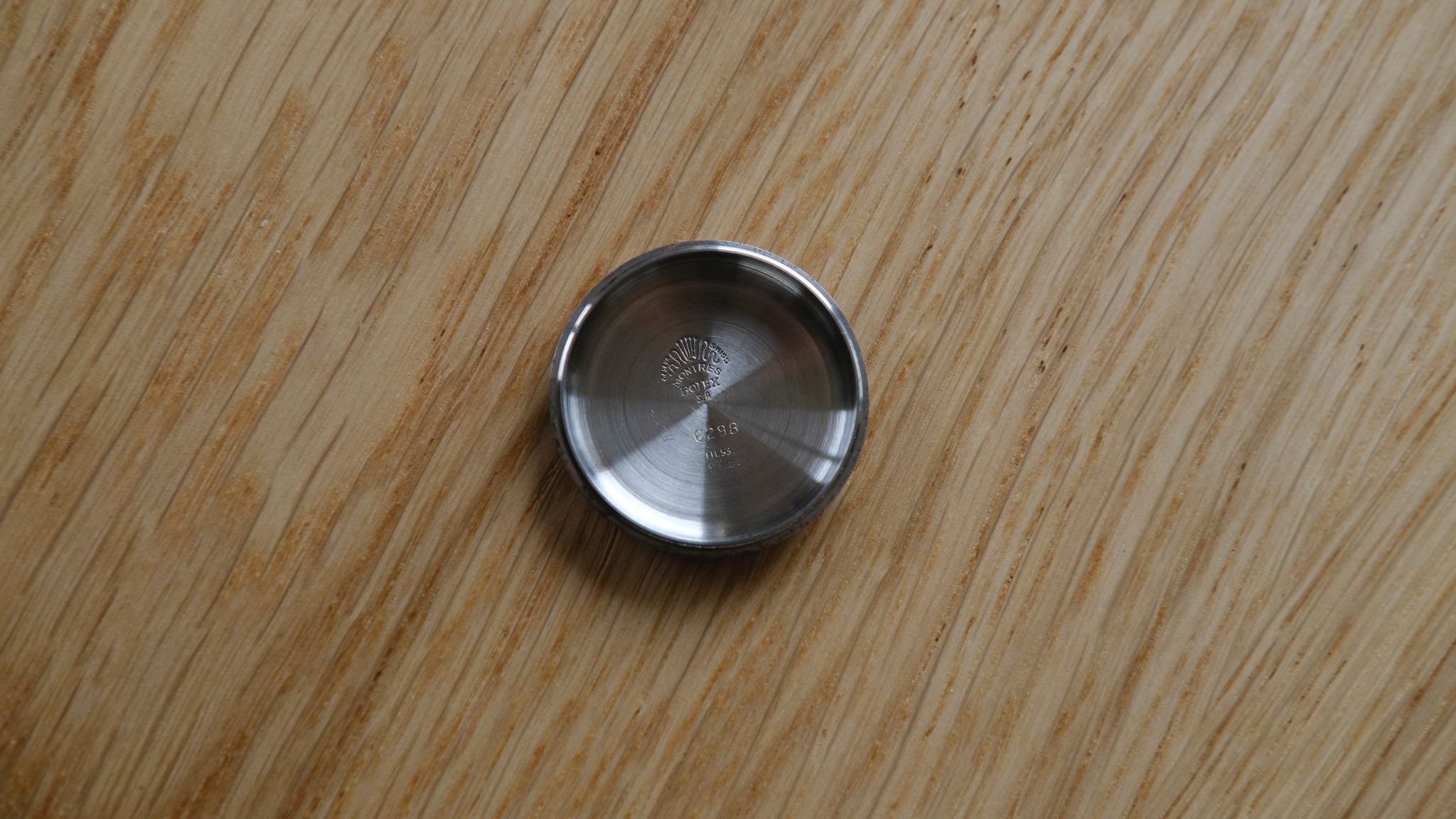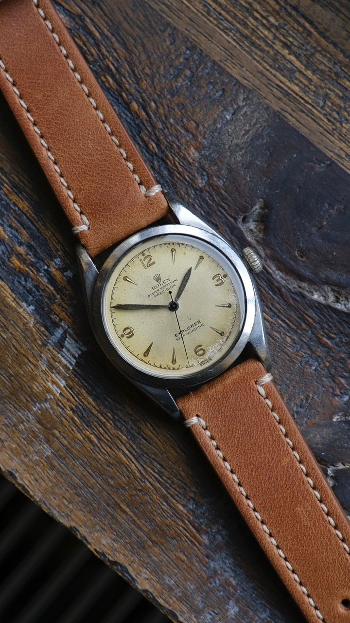 This 29mm.OYSTER EXPLORER (by ROLEX) is the FIRST EXPLORER EVER produced by ROLEX! Despite what you read anywhere on the net, this boy’s size EXPLORER was the FIRST EXPLORER EVER to appear and dates to 1940. ONly manufactured for the Canadian market; this watch is extremely rare and only the second we have owned in 25 years collecting ROLEX watches. The stainless steel ref. 3121 case has a gold bezel. The original gold OYSTER PATENT winding crown is in fine shape. The dial and hands are entirely original to the watch, with gold, reflective outer minute track and sub-seconds. These watches were marketed IN CANADA only (as were the first dress Explorers in 1953). The OYSTER series watches such as the Raleigh, Lipton, Junior sport, Dudley, Commander, Centregraph etc. were market in the Canadian PX stores to soldiers going overseas in WW2. We purchased this watch from the owner’s wife in New Brunswick Canada-never polished or altered and in its original state. The correct caliber 59 movement is signed ROLEX under the dial.