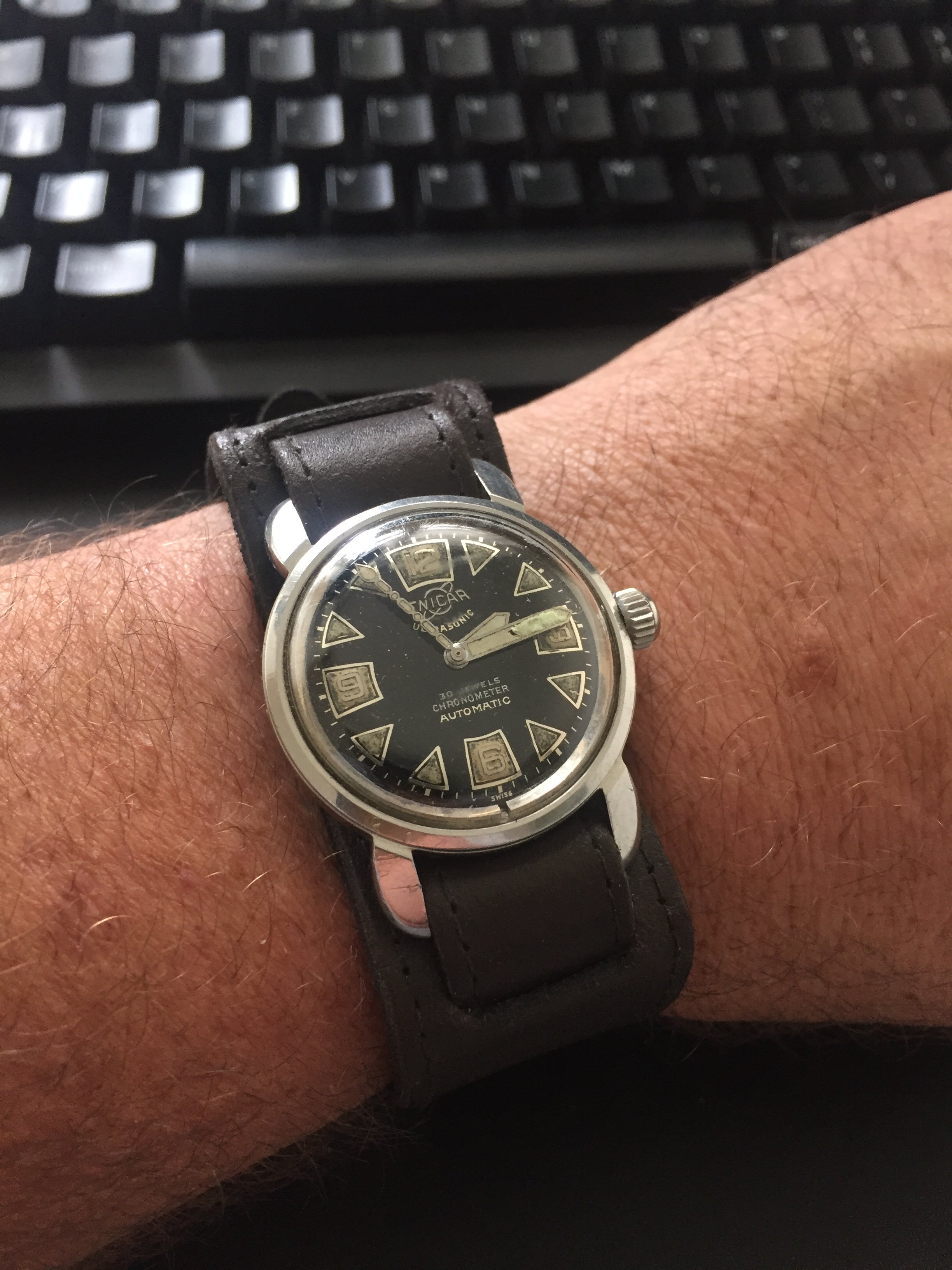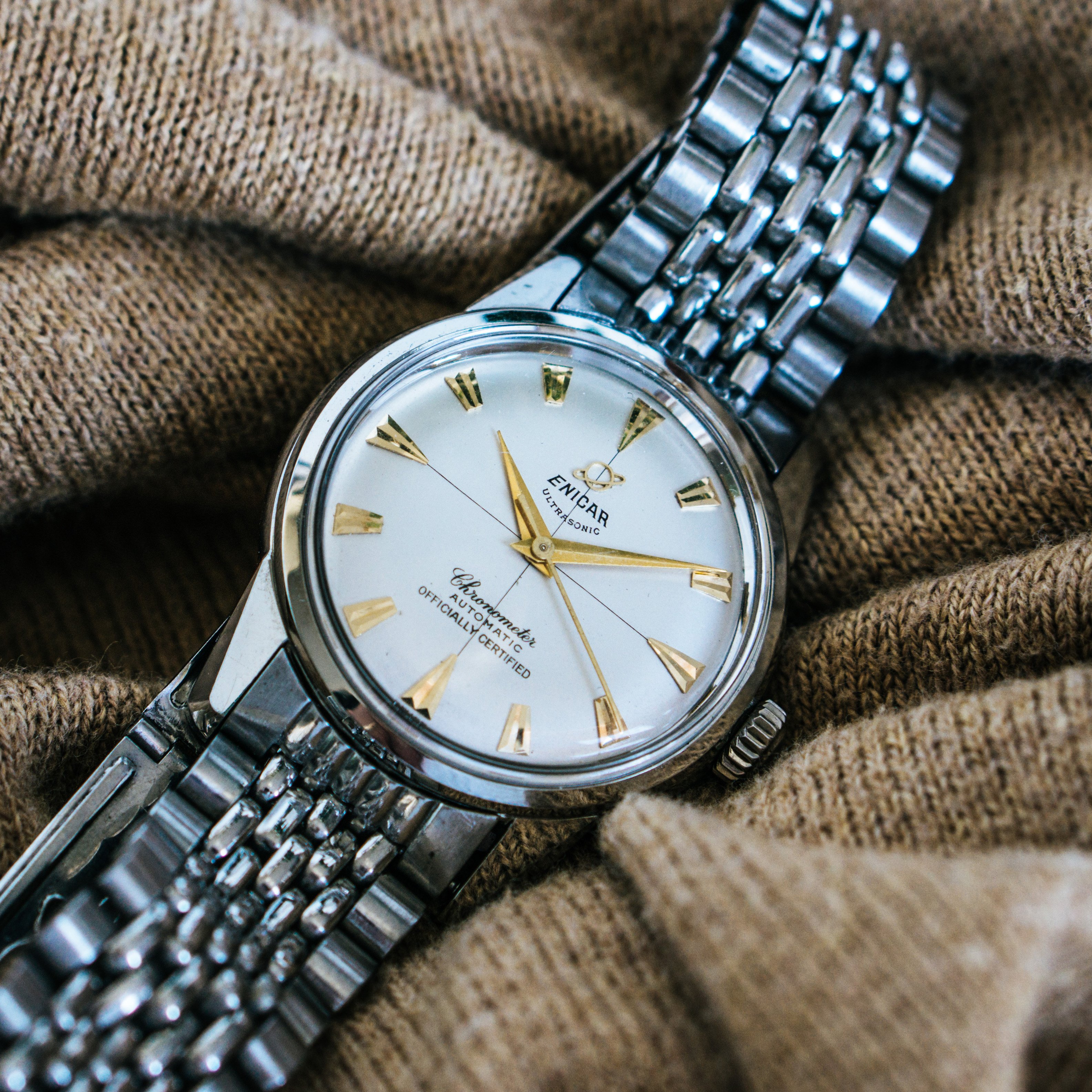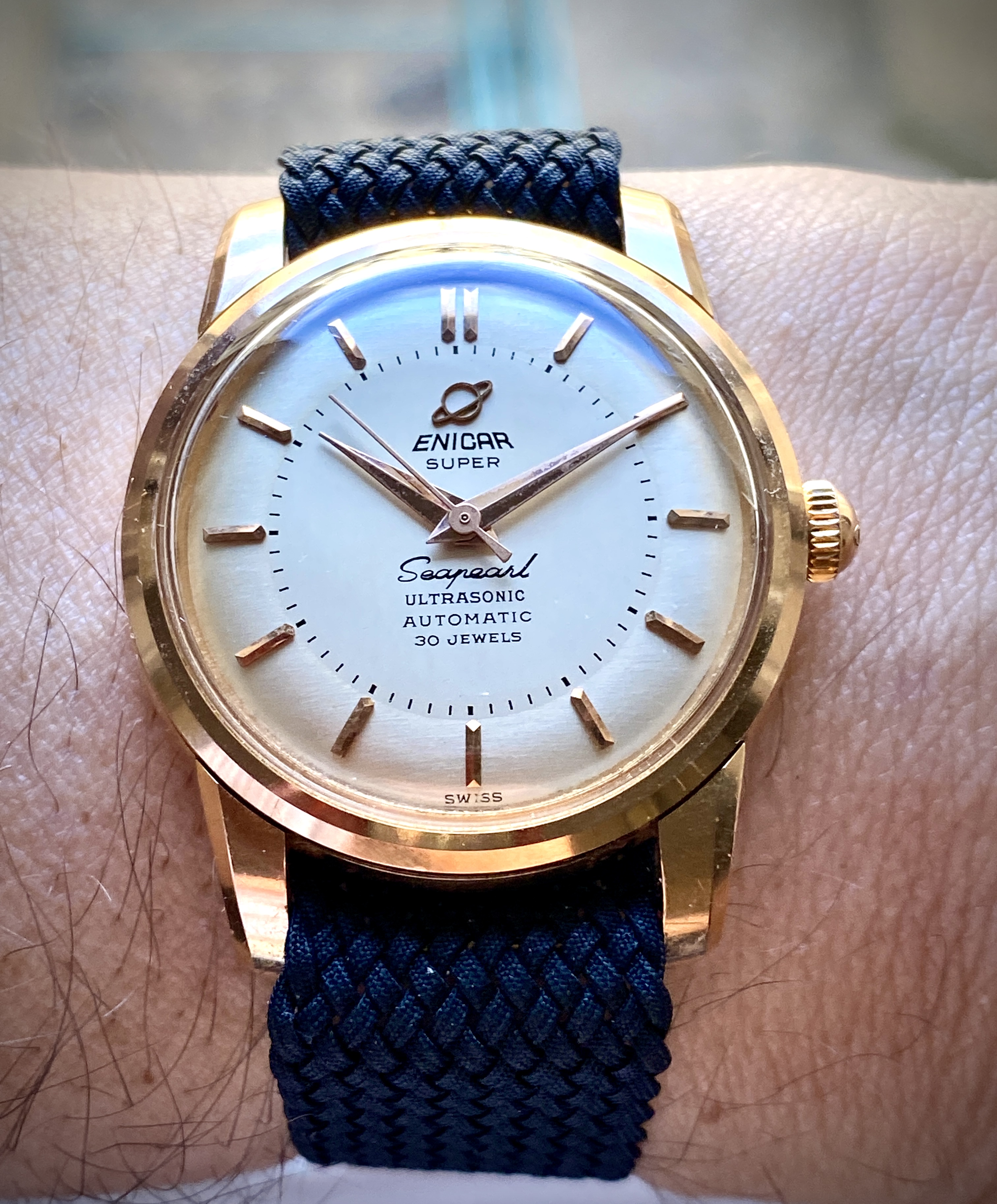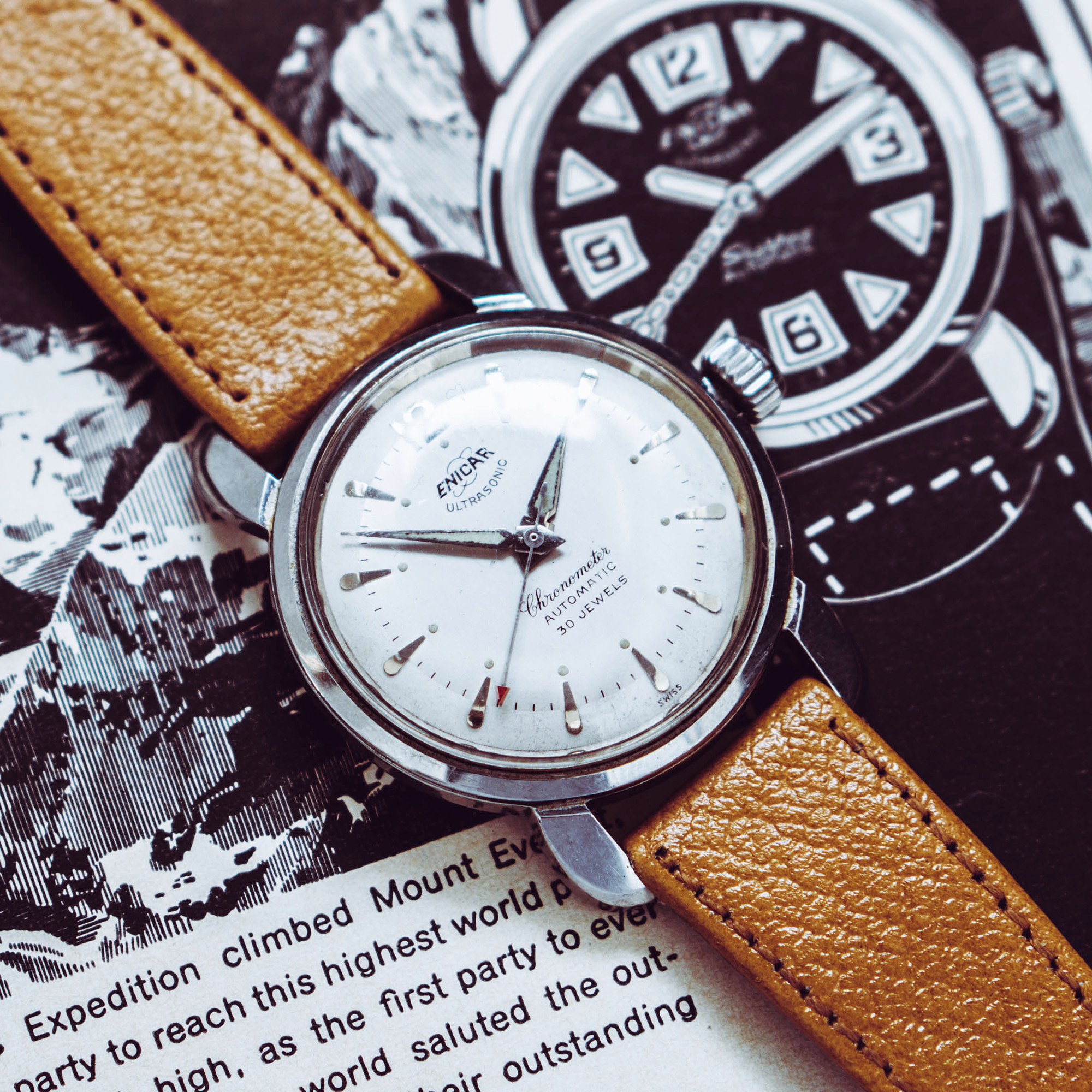 Your watch reminds me of the original Zodiac Sea Wolf, but the Enicar would seem to be a bit older.