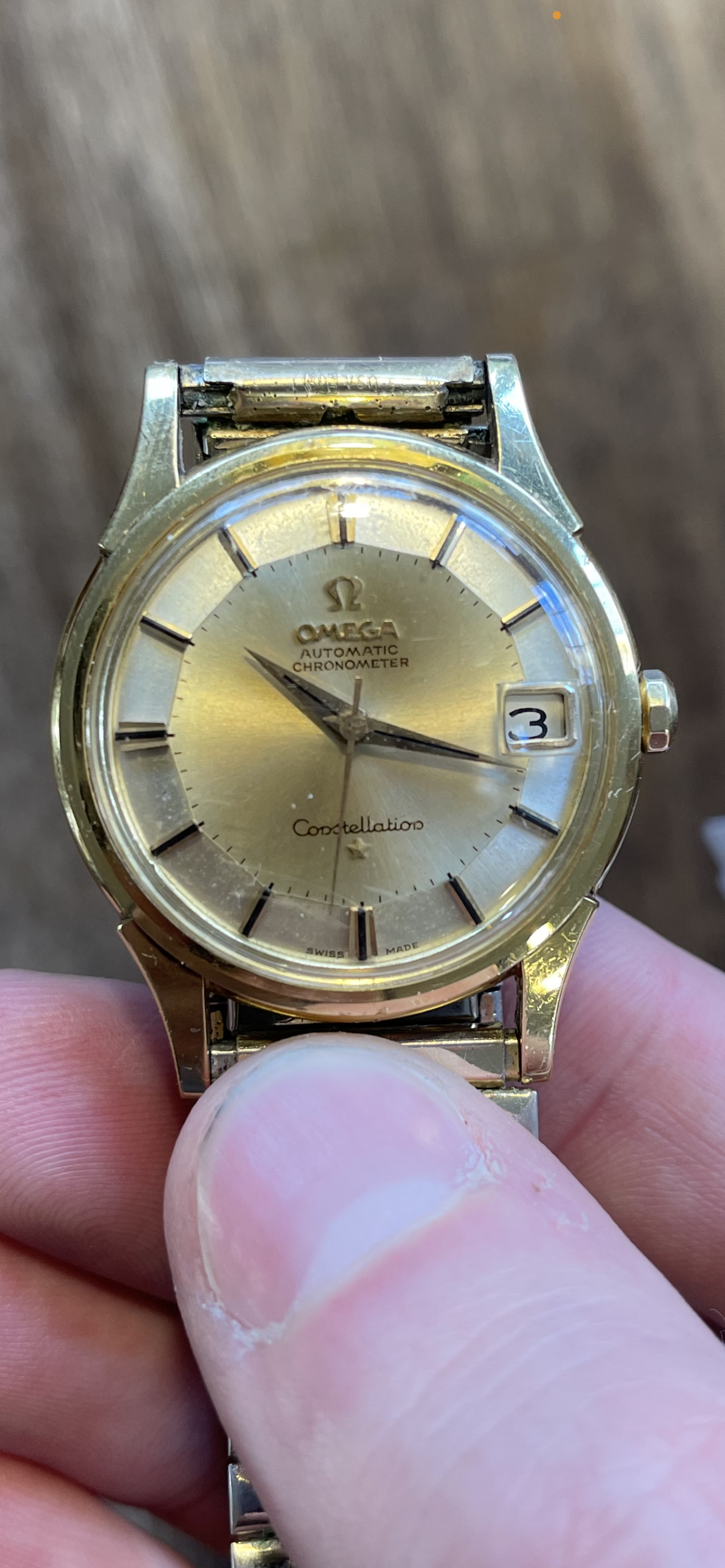·Hi everyone! I am a relative newbie to vintage Omegas and recently acquired a 1962 pie pan constellation (ref 14393 / 4 SC 6 1) from an estate sale and was hoping to find out what something like this might be worth if I were to sell it. The dial is in great shape and the case is solid 18k gold. It has black onyx inserts in the indicators and the original crown. The crystal is either original or a genuine Omega replacement. I think I will put it on a strap and wear it for a long time, but it would be nice to have a rough idea of the value before I did that. Figured this was the best place to ask!