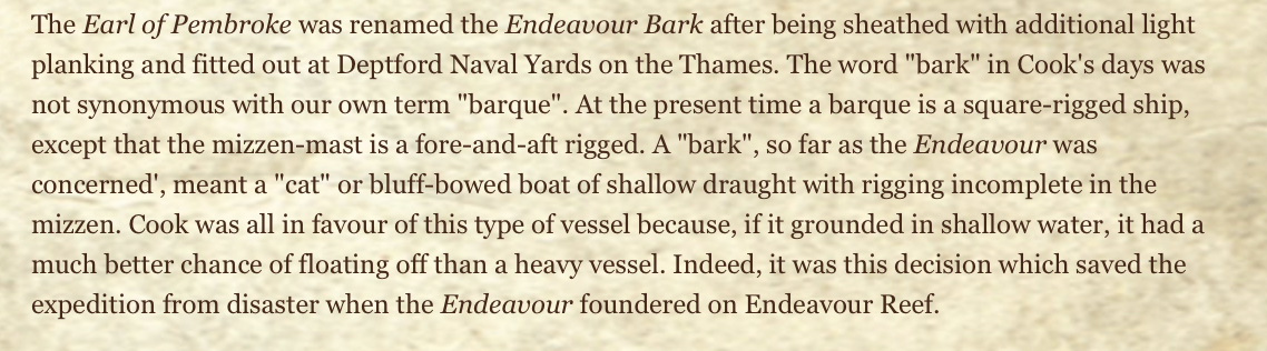 So is the answer related to Captain James Cook's ship "HMS Endeavour", AKA "His Majesty's Bark Endeavour" and Botany Bay, where he first set foot on the Australian continent in 1770?