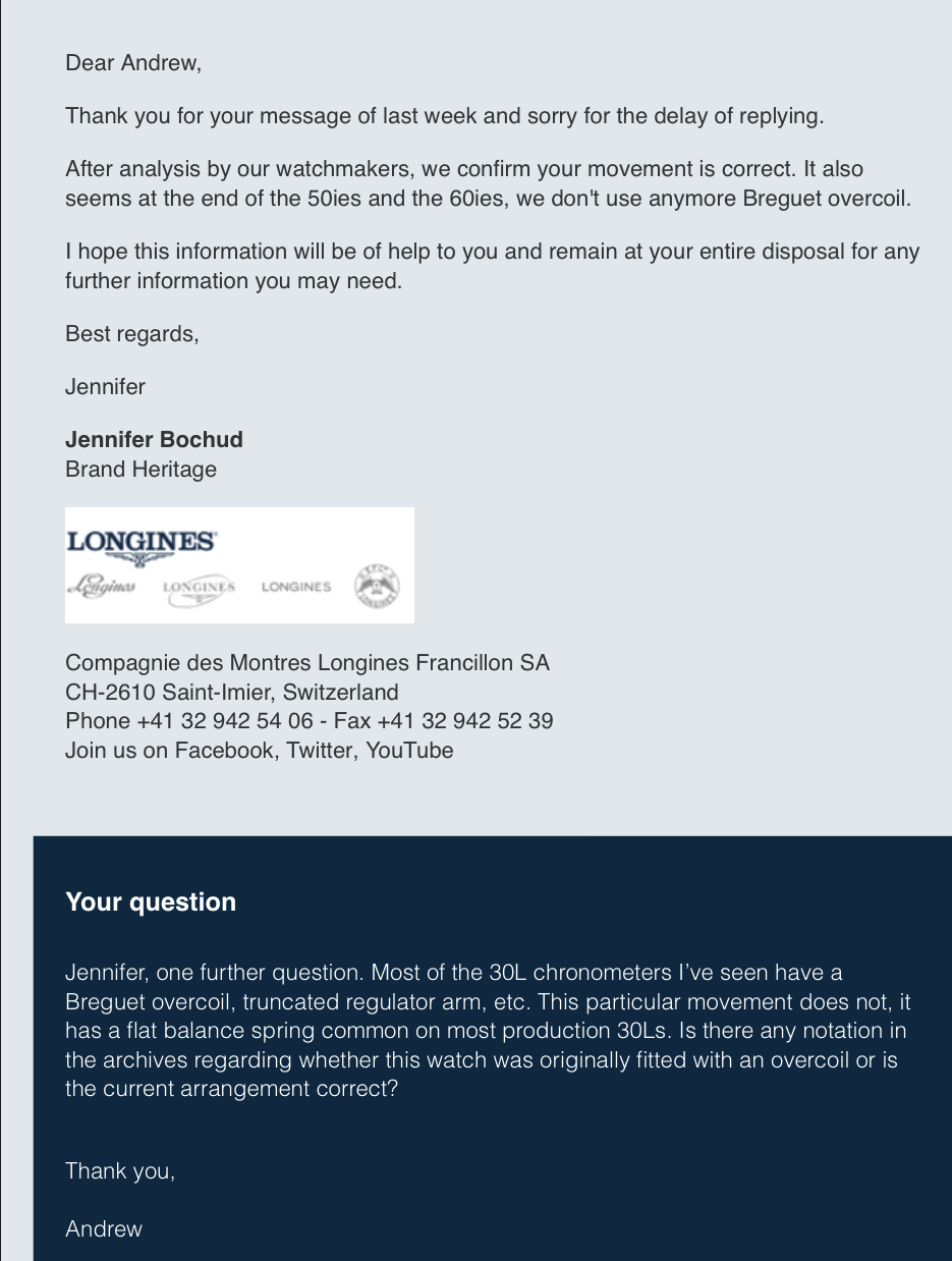 usually had an overcoil, but there were already some exceptions, like the 30LS : I've never seen the center second variant of the 30L with an overcoil, chronometer or not. The 28x/29x family doesn't seem neither to ever had have an overcoil, even in the earliest examples of the late 1950s. Only movements older than the 30L always had an overcoil in their chronometer version (like the 12.68Z or 22AS). But some non certified movements also had the overcoil, so it was impossible to distinguish movements only on this feature (the 27.0 for example looked the same with or without chronometer certification).