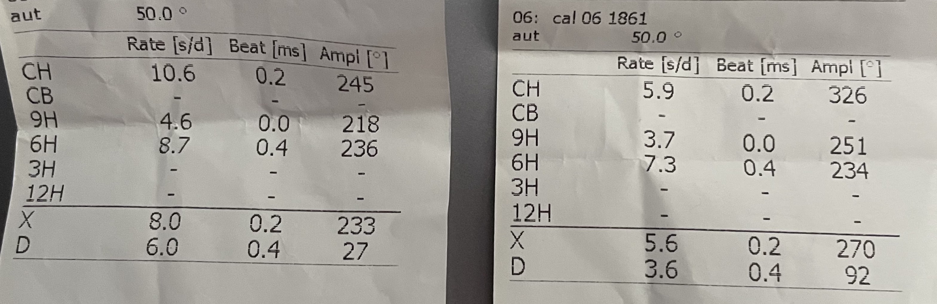 ·Hi everyone, long time lurker first time post. I recently got my 3570.50 serviced and it was running perfectly for the first three months but then started having issues. I had it put on a timing machine this weekend and it looks like it is +5 no matter what but when the chrono is off the amplitude drops considerably and the timekeeping is poor. Does anyone know what the issue could be? My watchmaker is great and has serviced multiple watches for me but for some reason my Speedy has had a few issues since the service. I plan on taking the watch back to him since his work is under warranty but just wanted to see if anyone knew what could cause something like a steep amplitude drop with the chrono on.