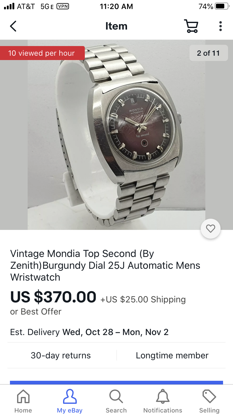 ·Nice looking Eterna in what appears to be white gold filled (looks white to me and not yellow in the not-so-great pics- but could be wrong). The dial is the star here with outer rail track, yellow gold furniture and hands against the grey two-tone sector dial (I love gold dial hardware with stainless/white gold cases). Slap this thing on a burgundy croc or chestnut suede and it’s a showpiece.
