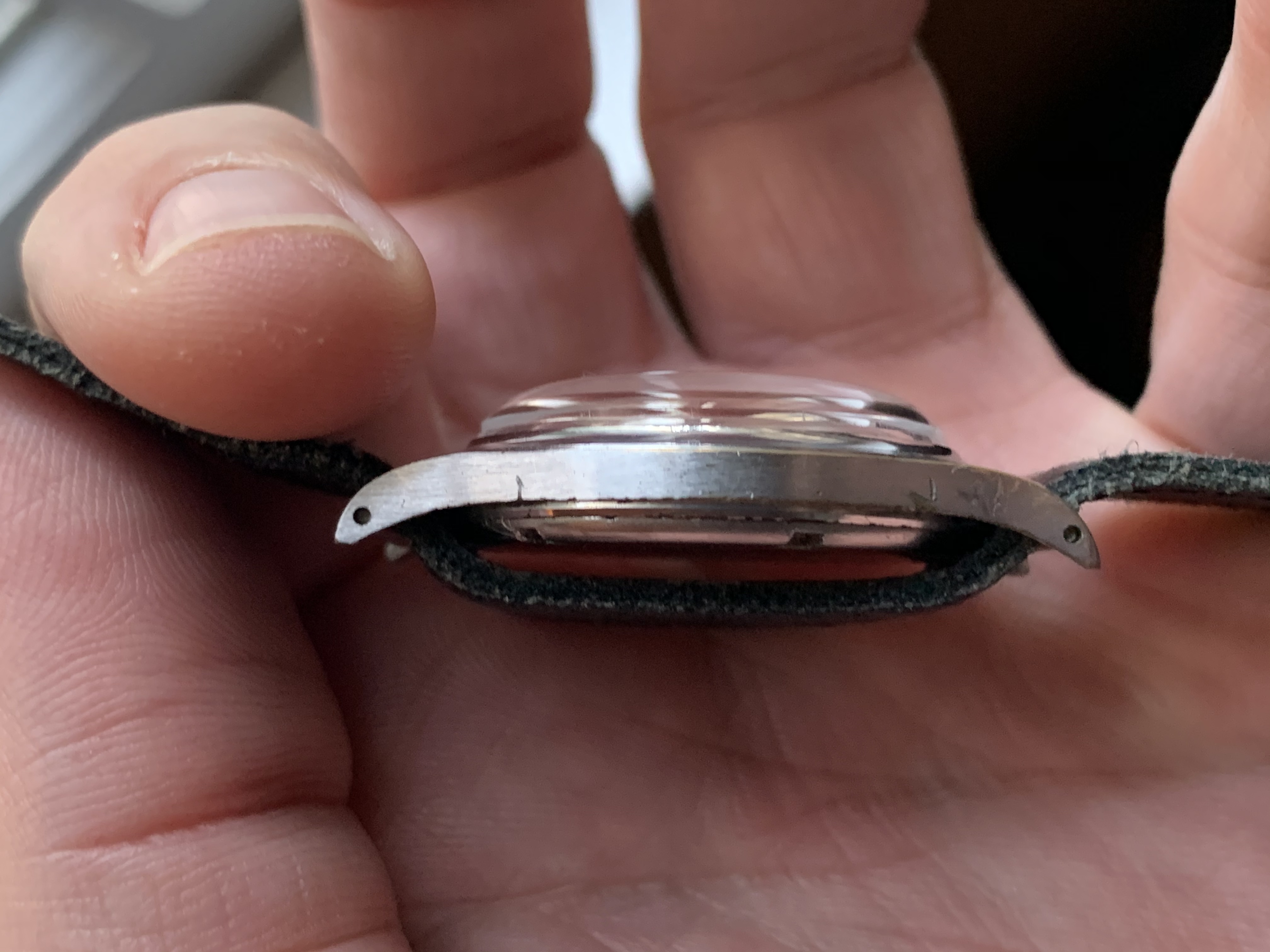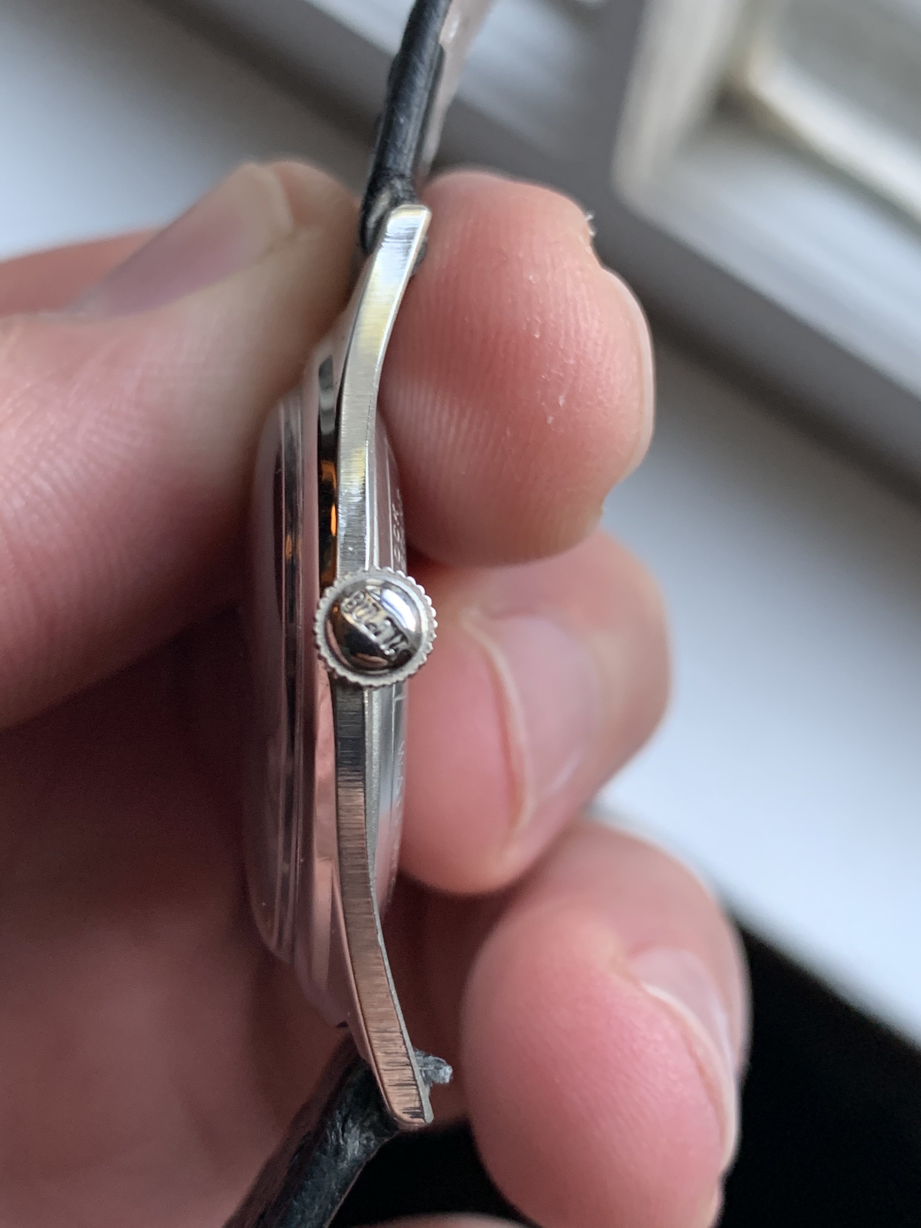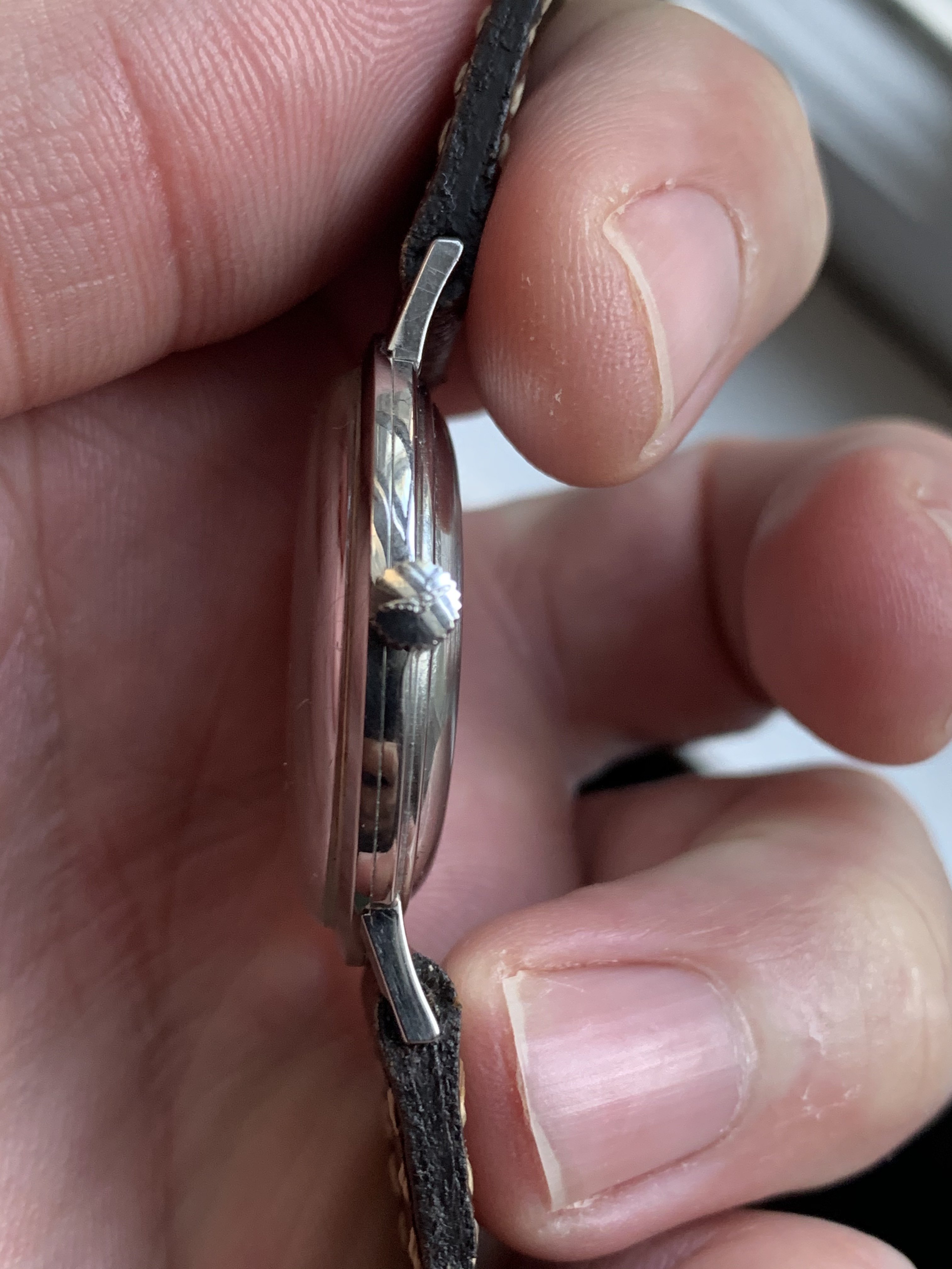 The Gruen is 9.5mm with the high dome crystal, it came with a ratty low dome which wasn’t correct for it so I replaced it with a GS high dome- back to bezel it’s only 6.4 so with a lower crystal it would be fairly slim. I have it on a leather RAF style pull-through right now so it does make it sit a bit higher, but the down-turned lugs make it sit flush with a 2-piece strap