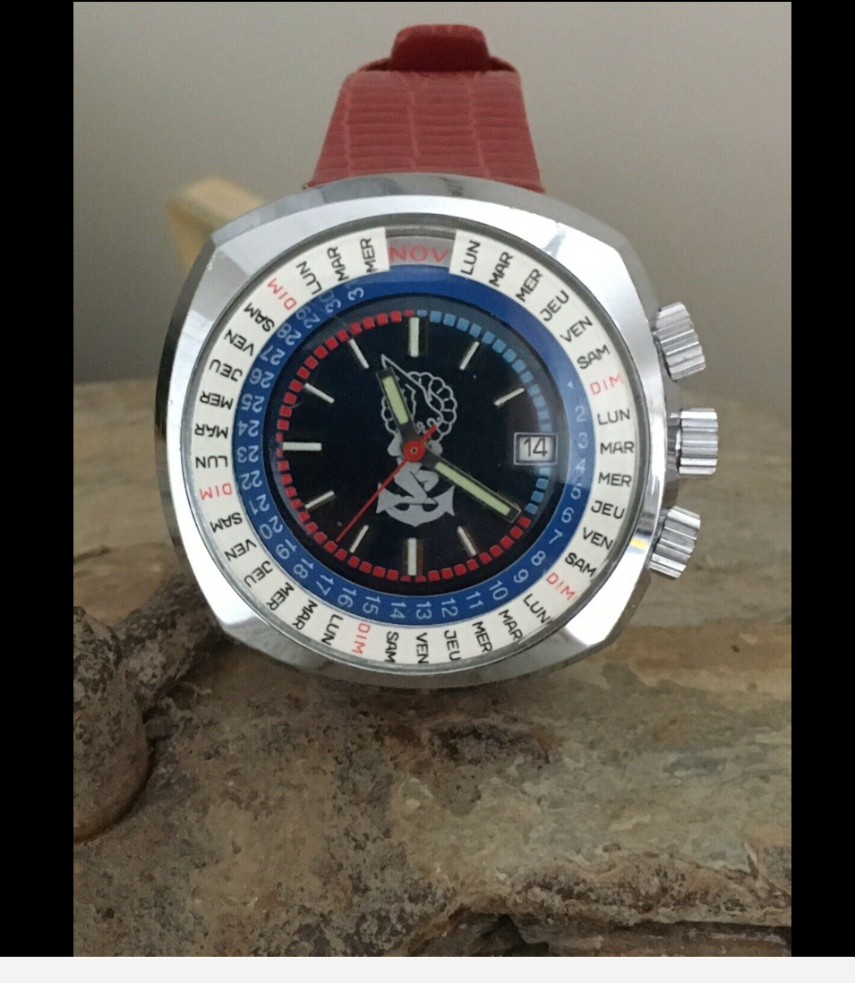 And another wannabe Polerouter- it this one has some fairly nice looking parts. Case is a stainless MLB with twisted lugs, movement looks like an eta- what’s not to like. At 34.5mm it’s about right for a poor man’s Polerouter