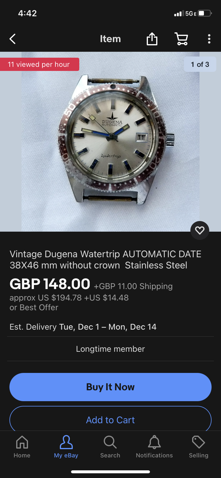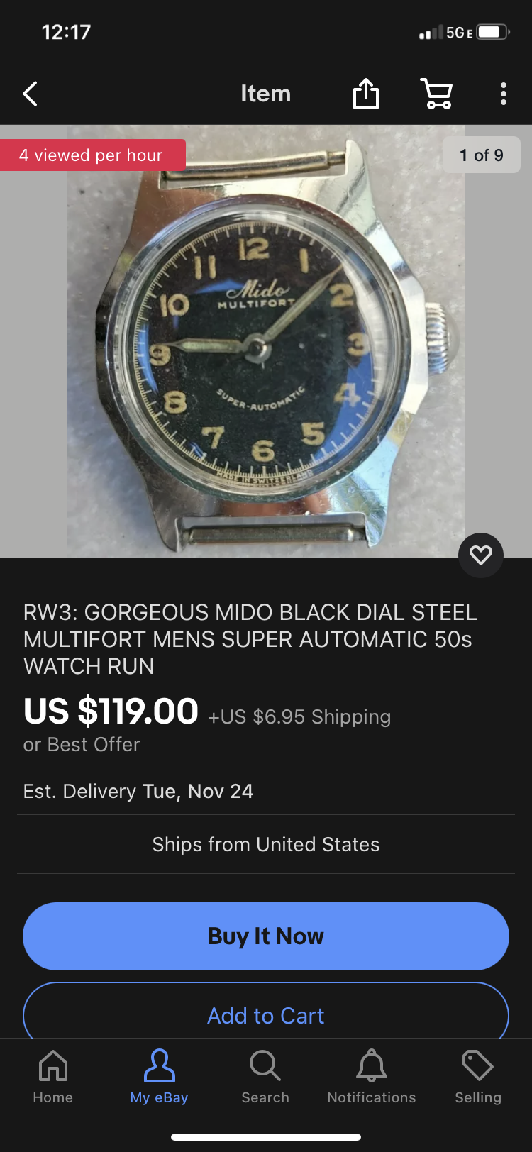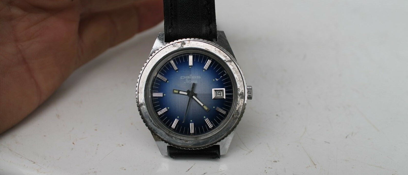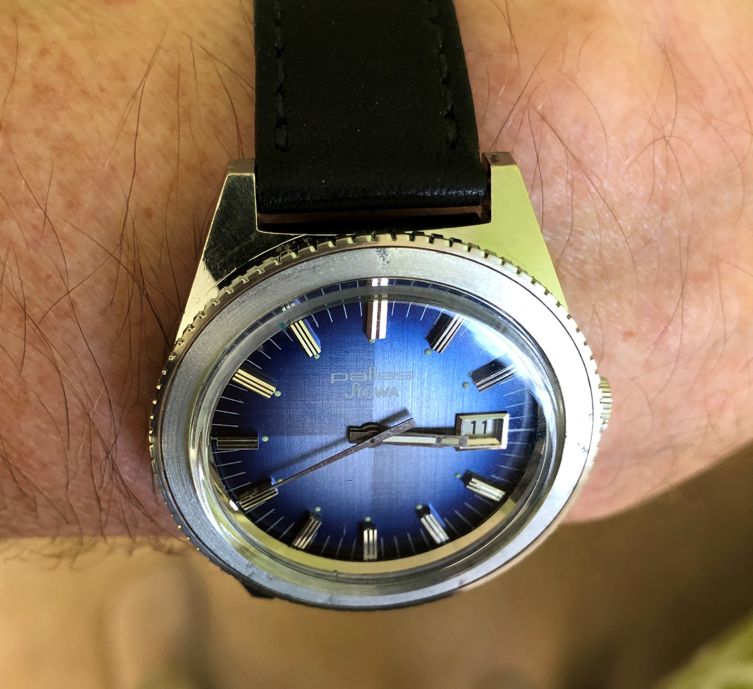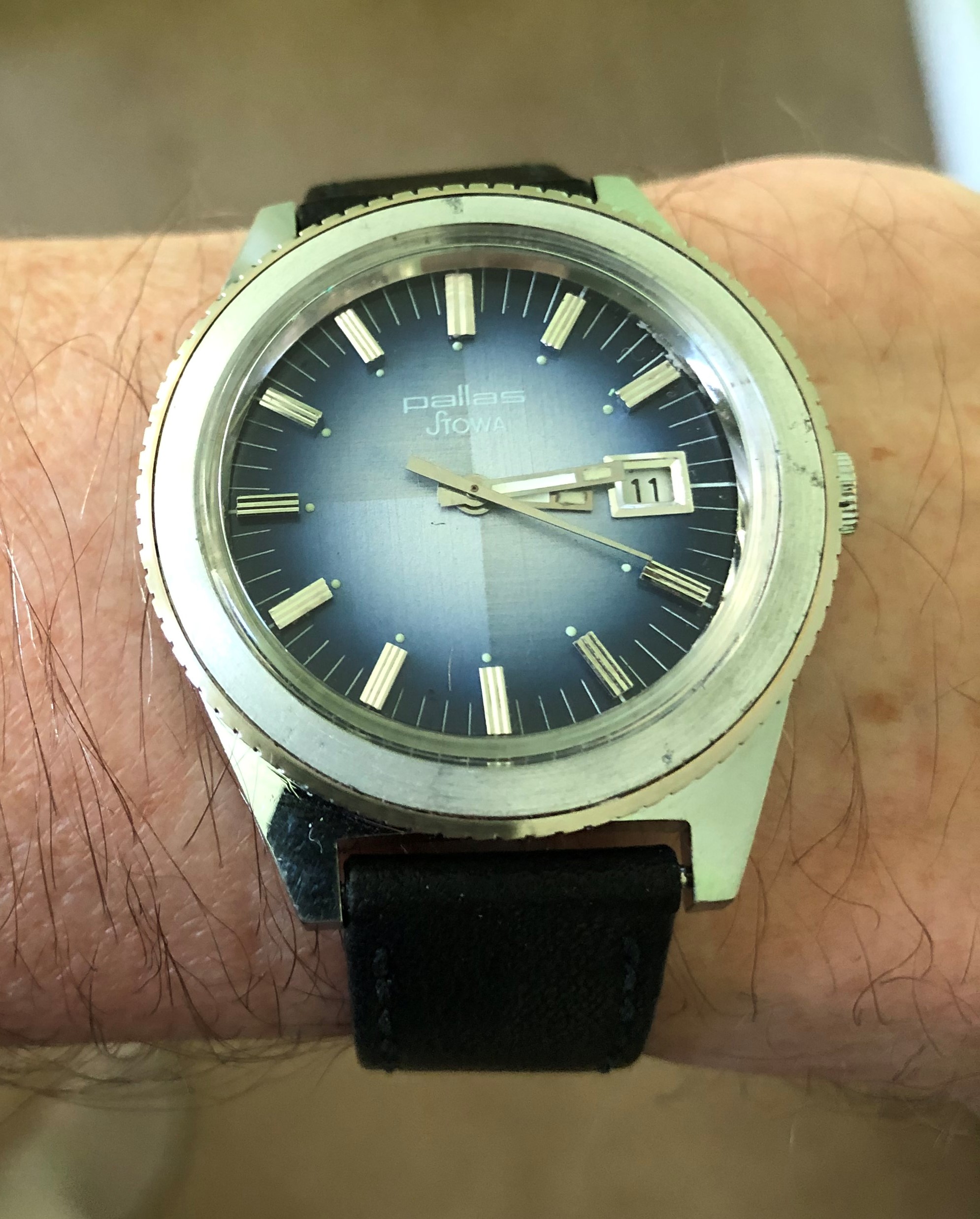 So I found this on Ebay several months ago, and thought my story belonged here. I really loved the dial and that it was a vintage Stowa, albeit a Pallas/Stowa. I tried lowballing the seller in Bulgaria, since it was missing the 2 o’clock marker, but settled about $200. I’m a sucker for a quarter dial, and this one has a sunburst/degradé that goes from a grey to blue, to a bright blue center sphere depending on the light. It also has a rotating bezel but no insert. For the missing hour marker, I found a vintage Pallas/Stowa parts watch that appeared to have similar indicators, again in Bulgaria.