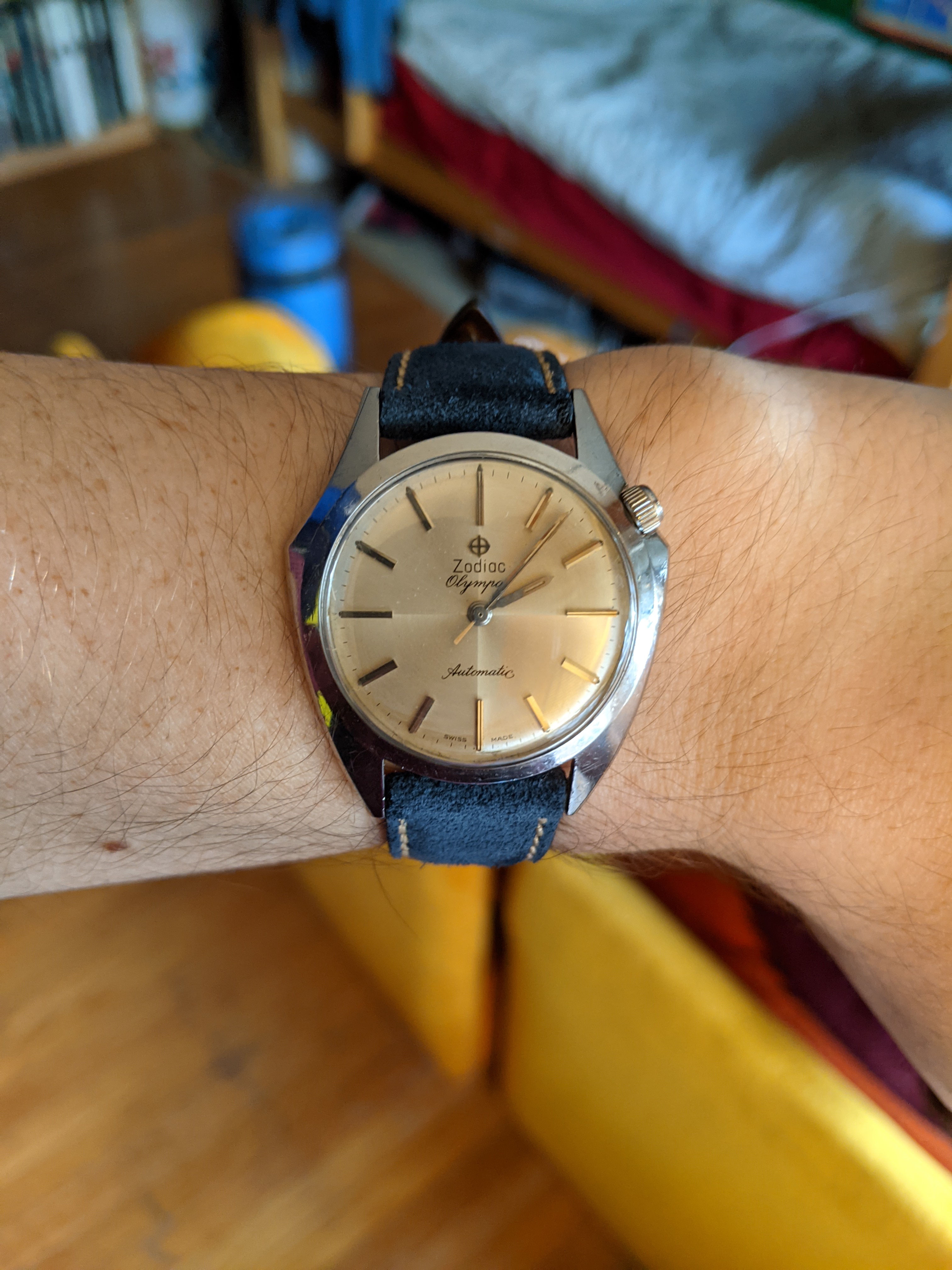 Zodiac Olympos- stunning case shape dial looks nice under the nasty crystal, lots of cheese on this that should scrub off easily.