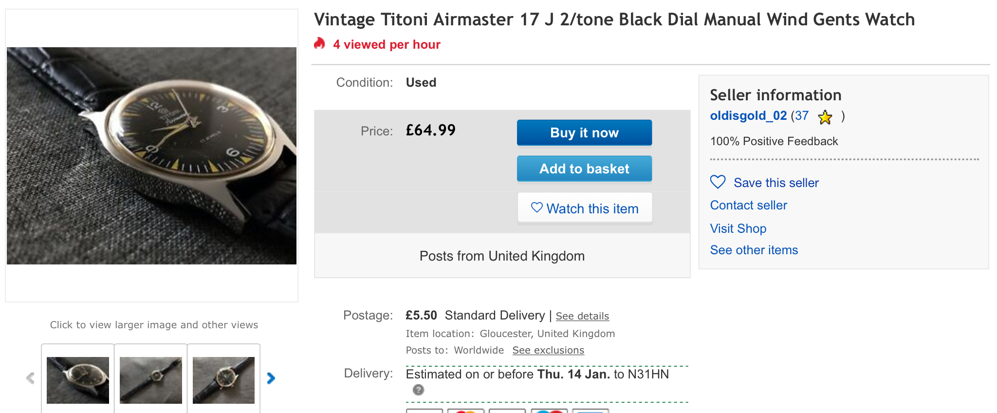 I have no idea about this brand but the watch is good looking - easy to see what inspired it. Unless it’s some kind of fake it looks like a nice cheap daily wearer.https://www.ebay.co.uk/itm/Vintage-Titoni-Airmaster-17-J-2-tone-Black-Dial-Manual-Wind-Gents-Watch/233850825304?hash=item3672986a58:g:4NYAAOSwGbFf72SV&LH_BIN=1&LH_ItemCondition=3000