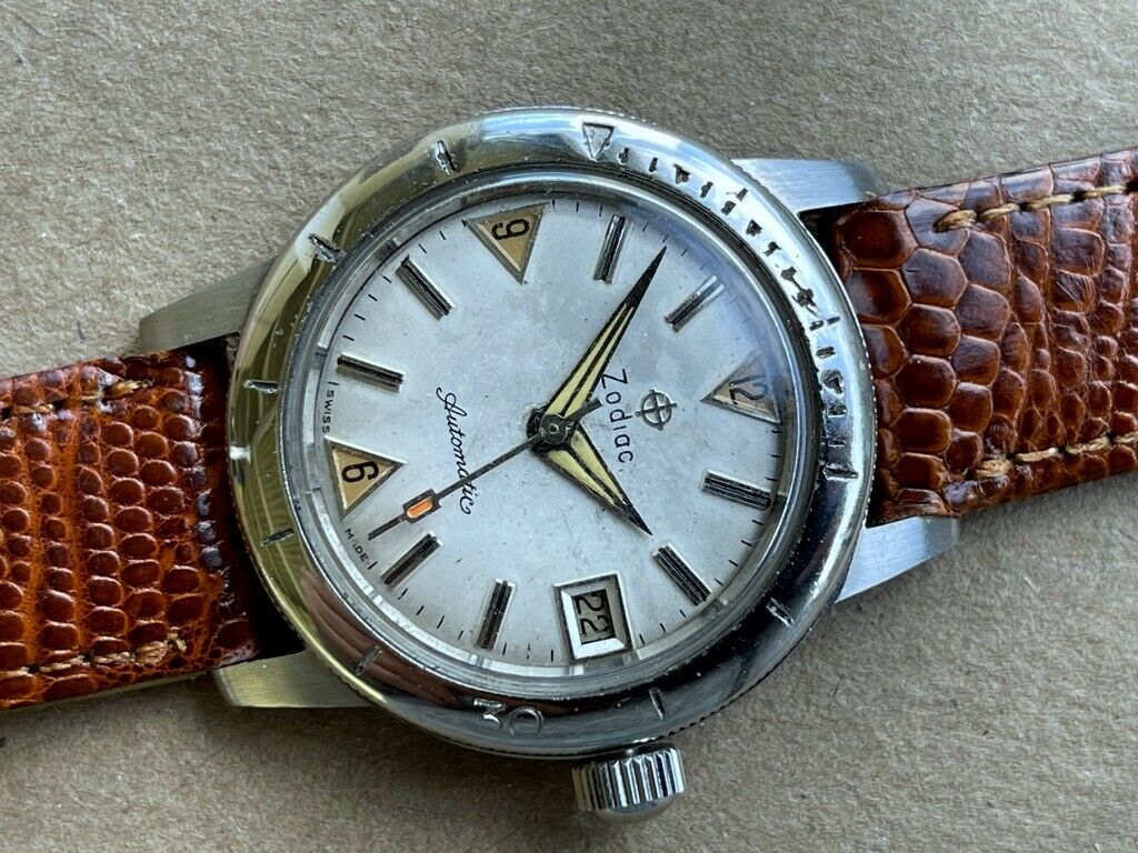 Zodiac Seawolf again from the UK Great looking watch with the hands matching the triangles at 6 9 12 Beware as not much information on it. Is that moisture residue on the mechanism?
