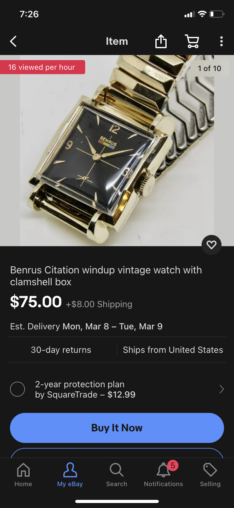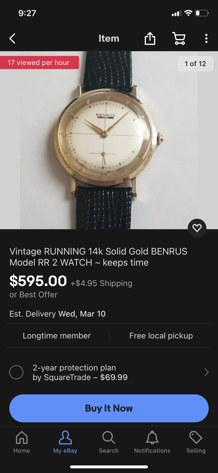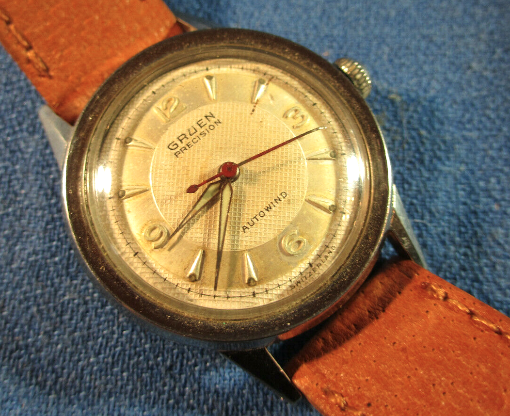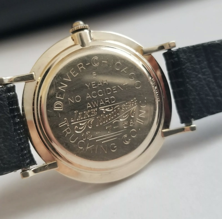 Benrus tank- this is really pretty. Gold plated, black dial- comes with clamshell. It appears to be running, there is a spot on the dial which I can’t tell if it’s crud or damage- if damage a dot of black modeling paint would hide it.