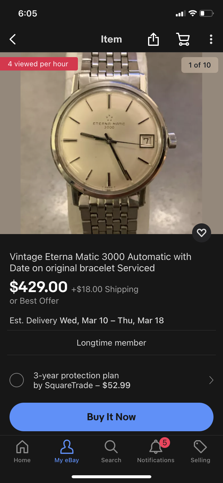 Eternamatic 3000 with factory bracelet and seller says freshly serviced. Lume pips are bright yellow, case looks nice- this is a classic. Has make offer.