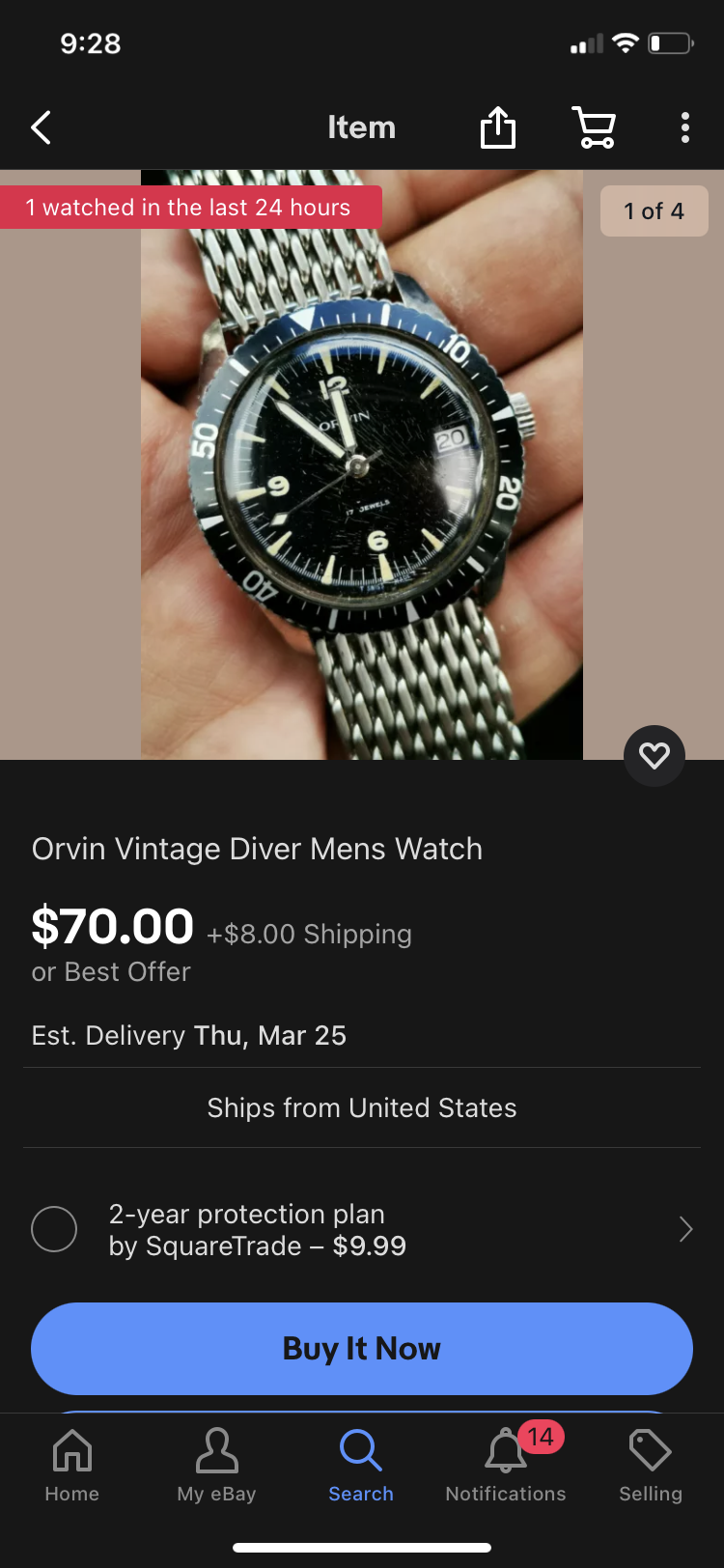 Orvin chrome plated diver. I normally bypass these unless they are running, but this one has a great dial & hands, nice bezel and good looking case. Crystal is crazed (Generic for $10 will solve that) and movement is most likely a FHF or something similar which would be simple to fix or even swap for a whole movement from a running donor for cost of dinner...for one, without wine. Probably not worth a professional service, but great for the shade-tree.