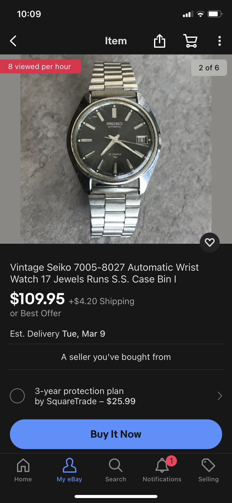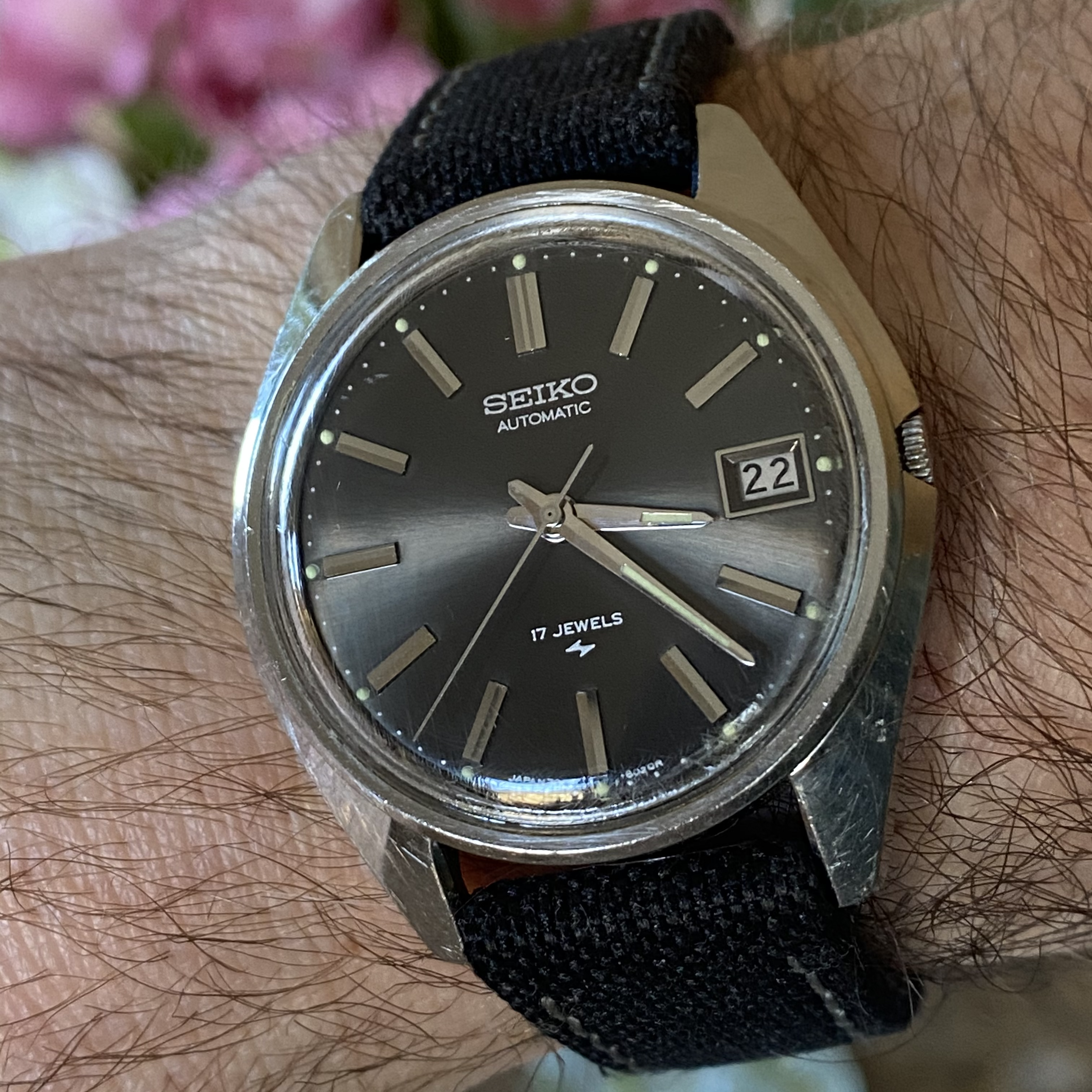 ·Nice looking 60’s stainless Seiko with black dial- date only - which is a nice thing as most are day/date. Looks honest and original, would probably clean up well with a wet sand on the crystal. Bracelet is aftermarket but Seiko BOR’s come up often, and cheaply. Lume looks great. Has make offer