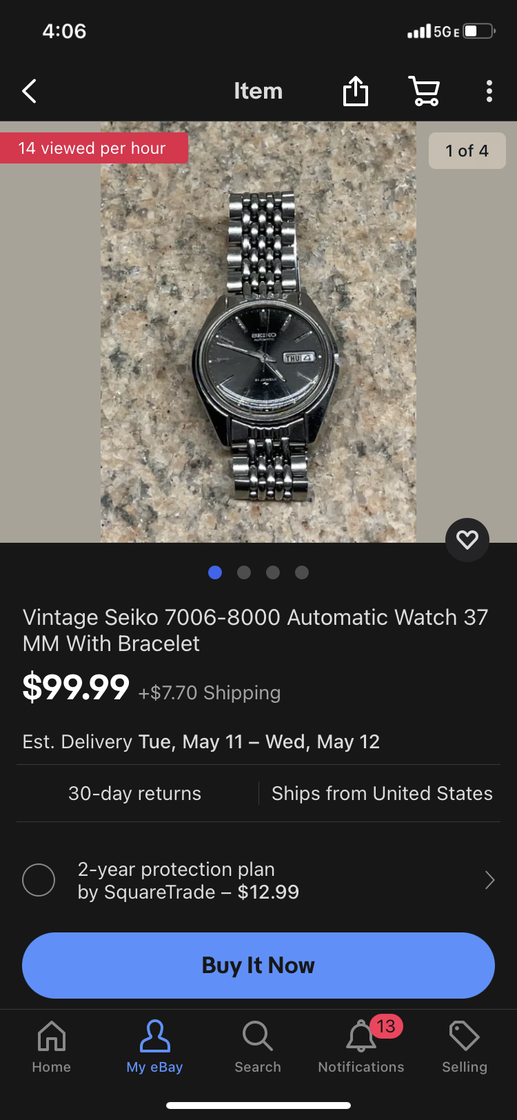 Black dialed (slate maybe??) stainless seiko on factory BOR. crystal should polish out and this thing would be a stunner. Seller says 37mm so sizable for the style.